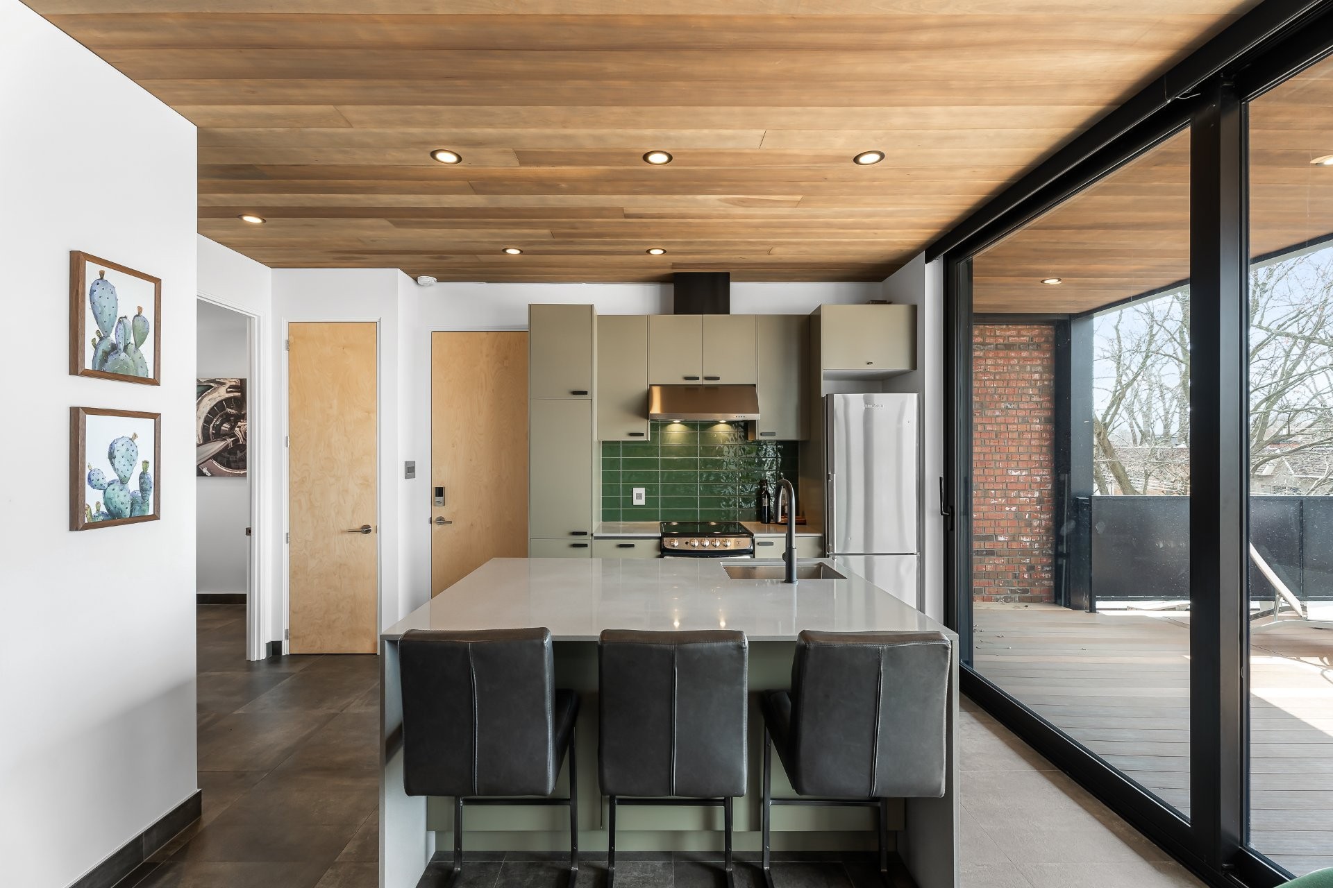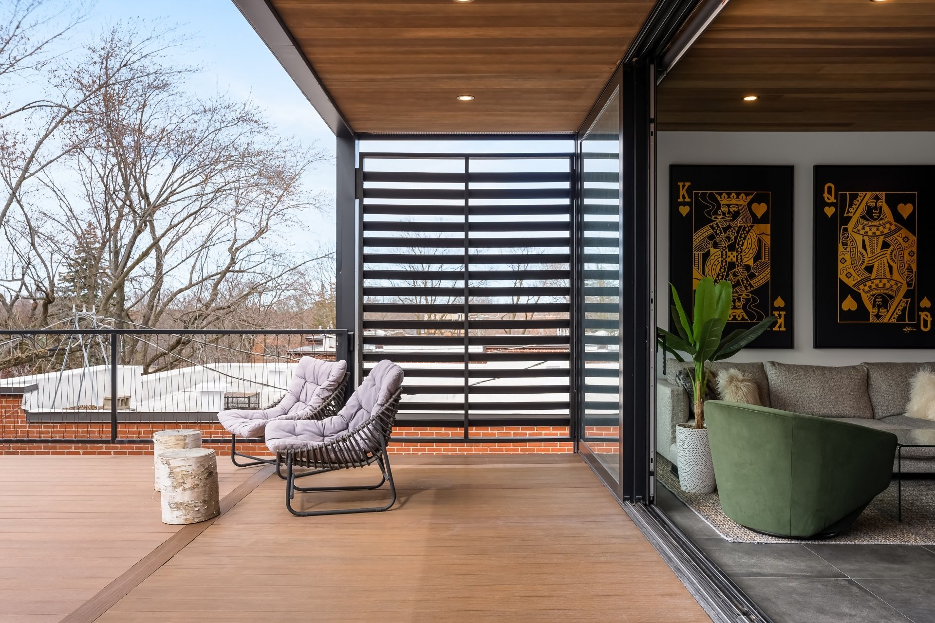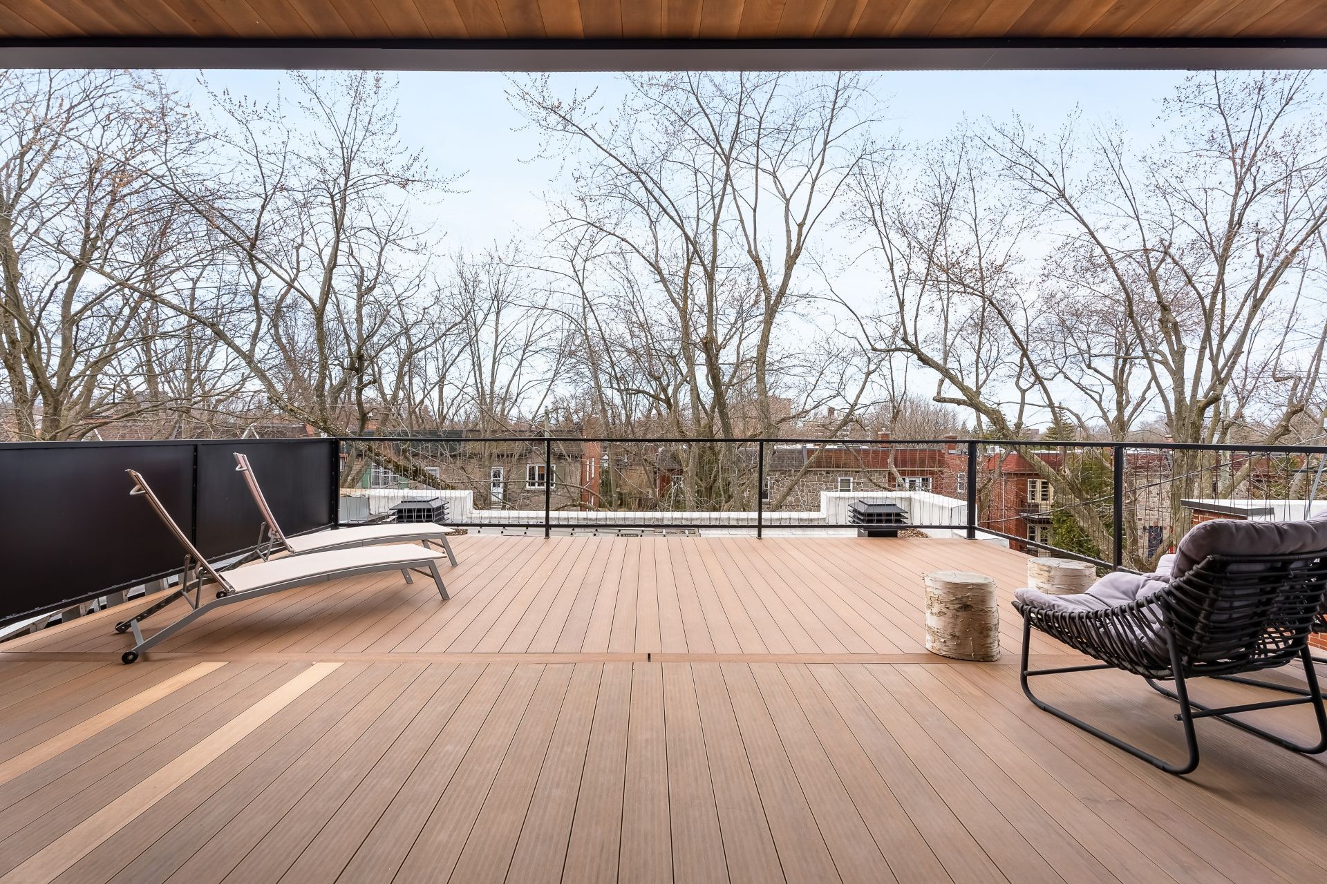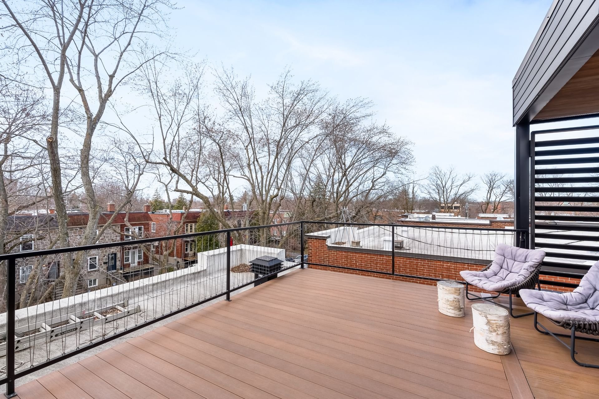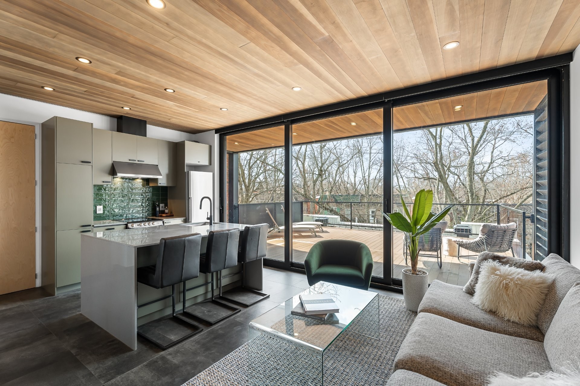 À l'extérieur, une superbe terrasse de plus de 400 pi², accessible par de grandes portes coulissantes, offre un prolongement naturel de l'espace intérieur. Un lieu privilégié pour recevoir en toute élégance, partager un apéritif ou simplement profiter des soirées d'été avec vue dégagée.