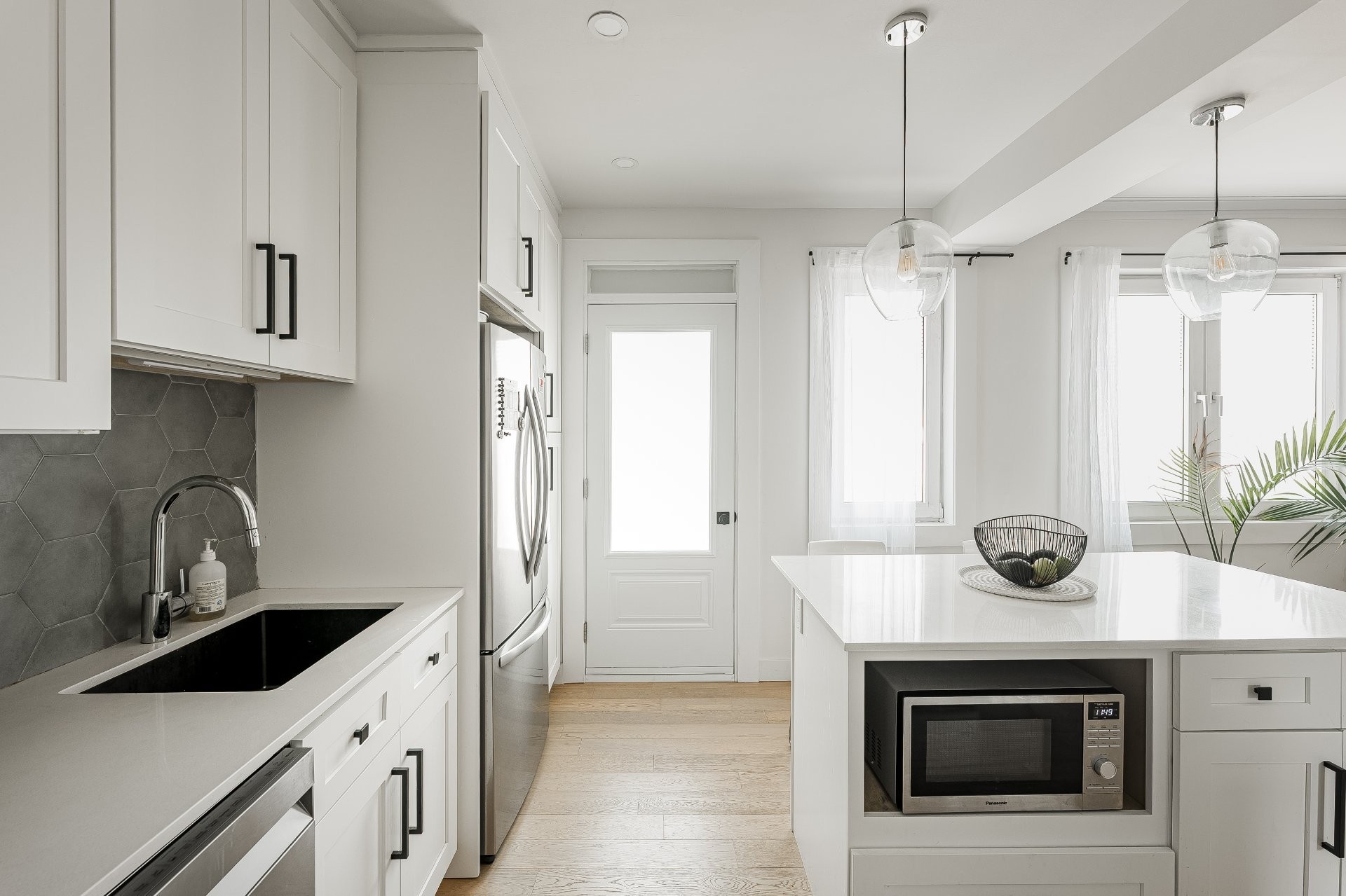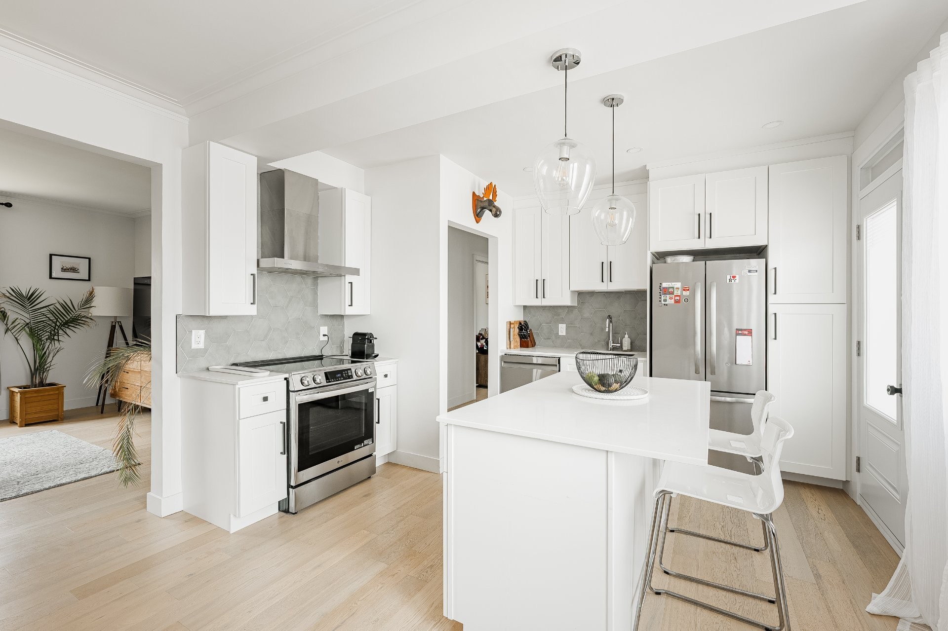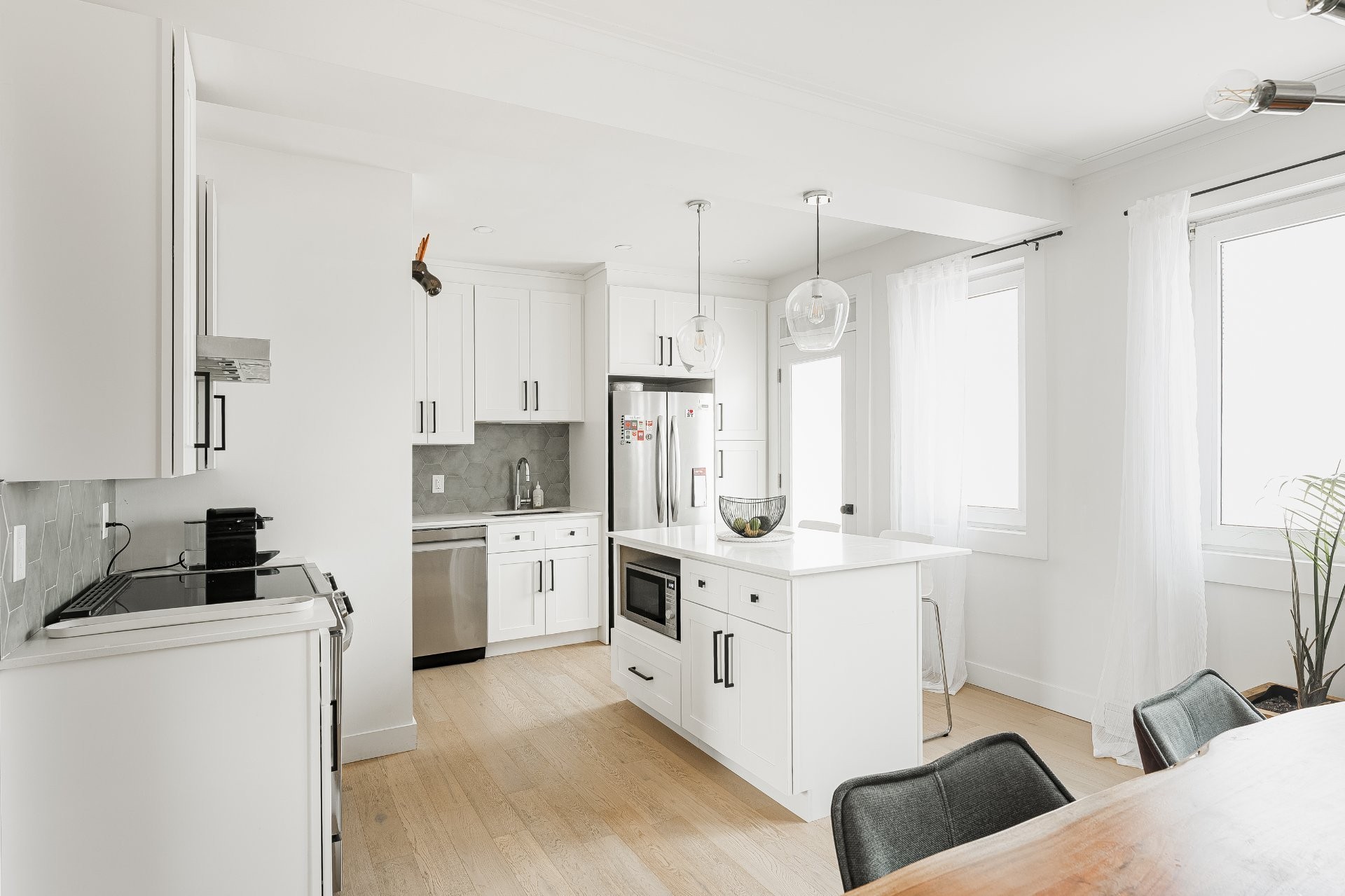 * Cuisine rénovée avec îlot central et comptoir de quartz