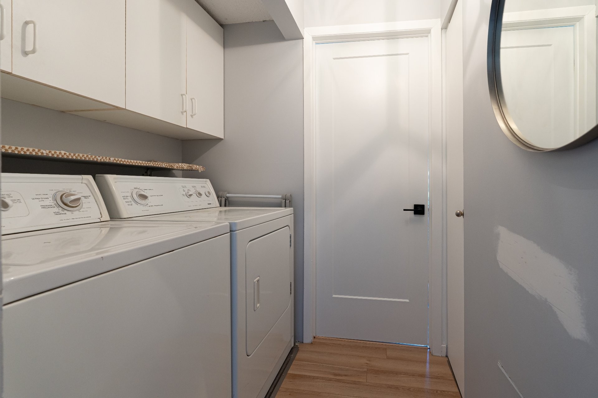 Réfrigérateur, cuisinière, micro-ondes, laveuse, sécheuse, chariot à linge Chambre principale : cadre de lit, table de chevet, coiffeuse, armoire noire Deuxième chambre :cadre de lit simple, lampadaire