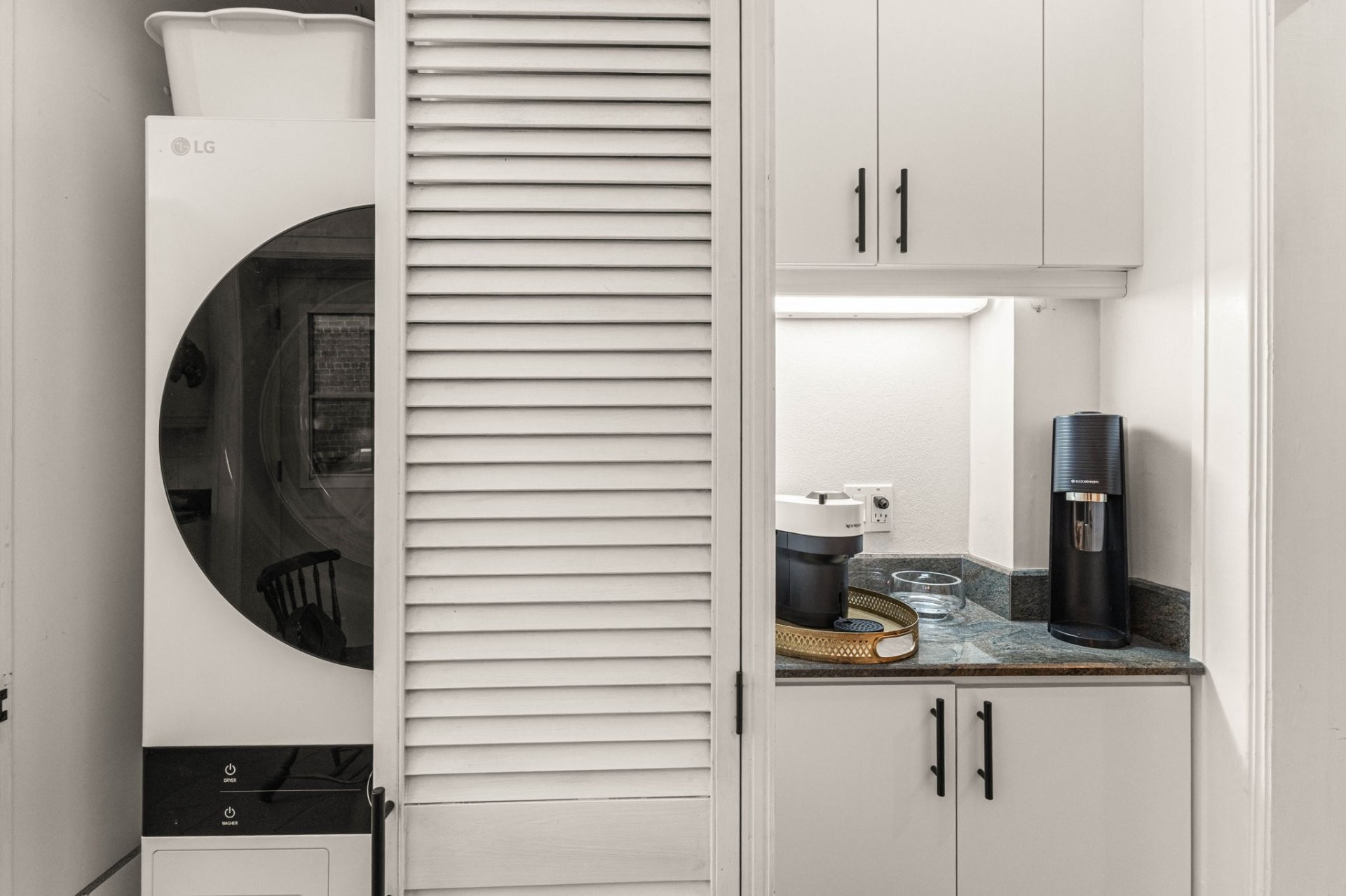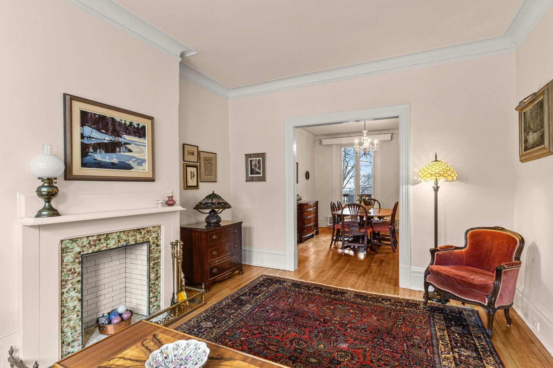 Rideaux, luminaire de cuisine, luminaire de salle à manger, garde-feu de cheminée et objets personnels.
