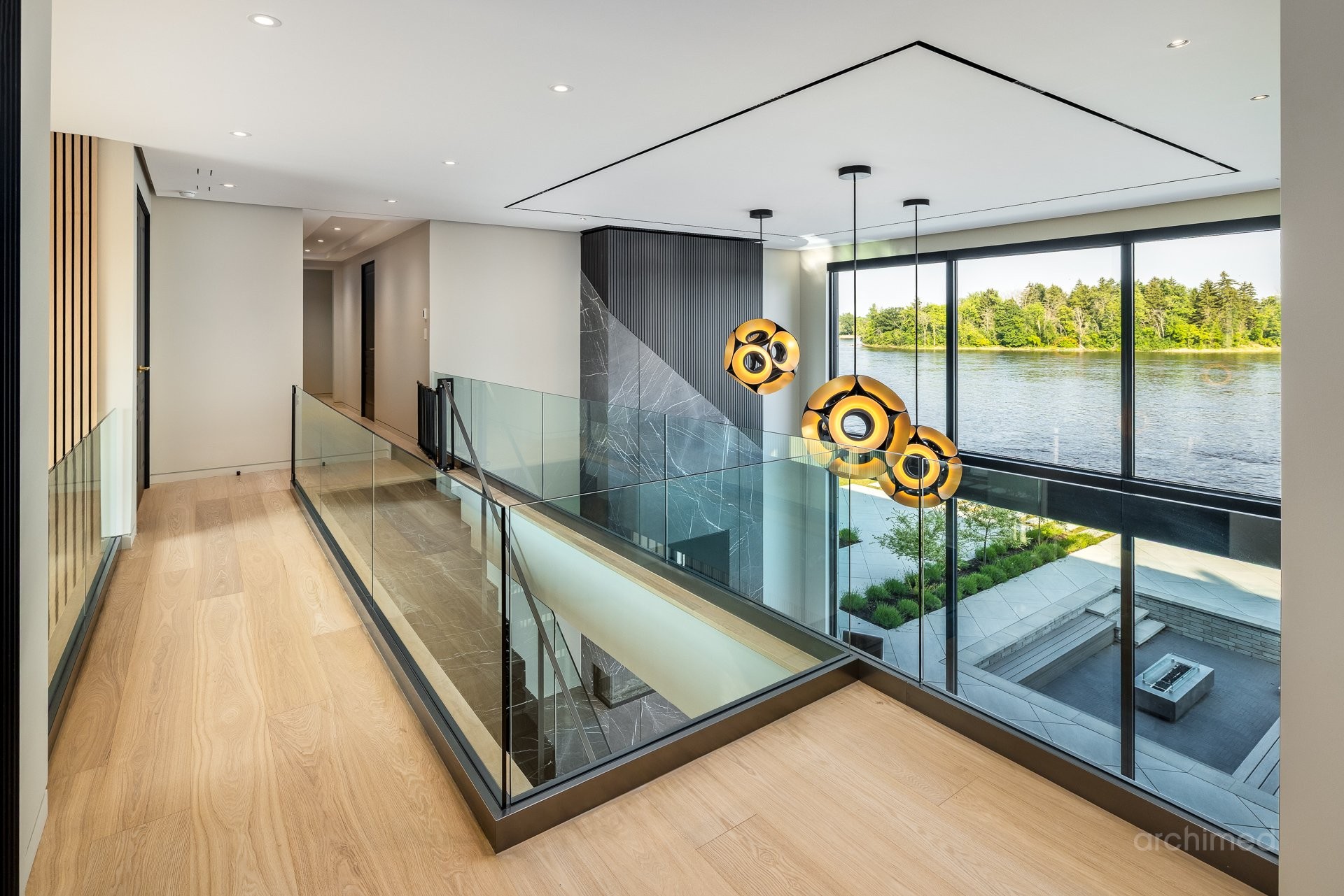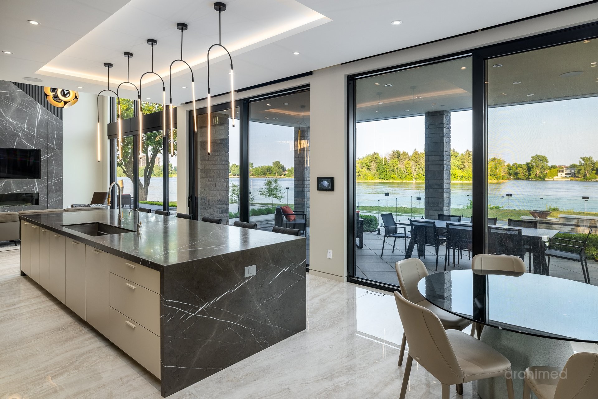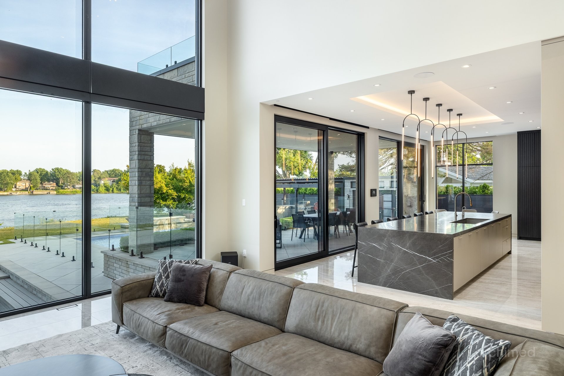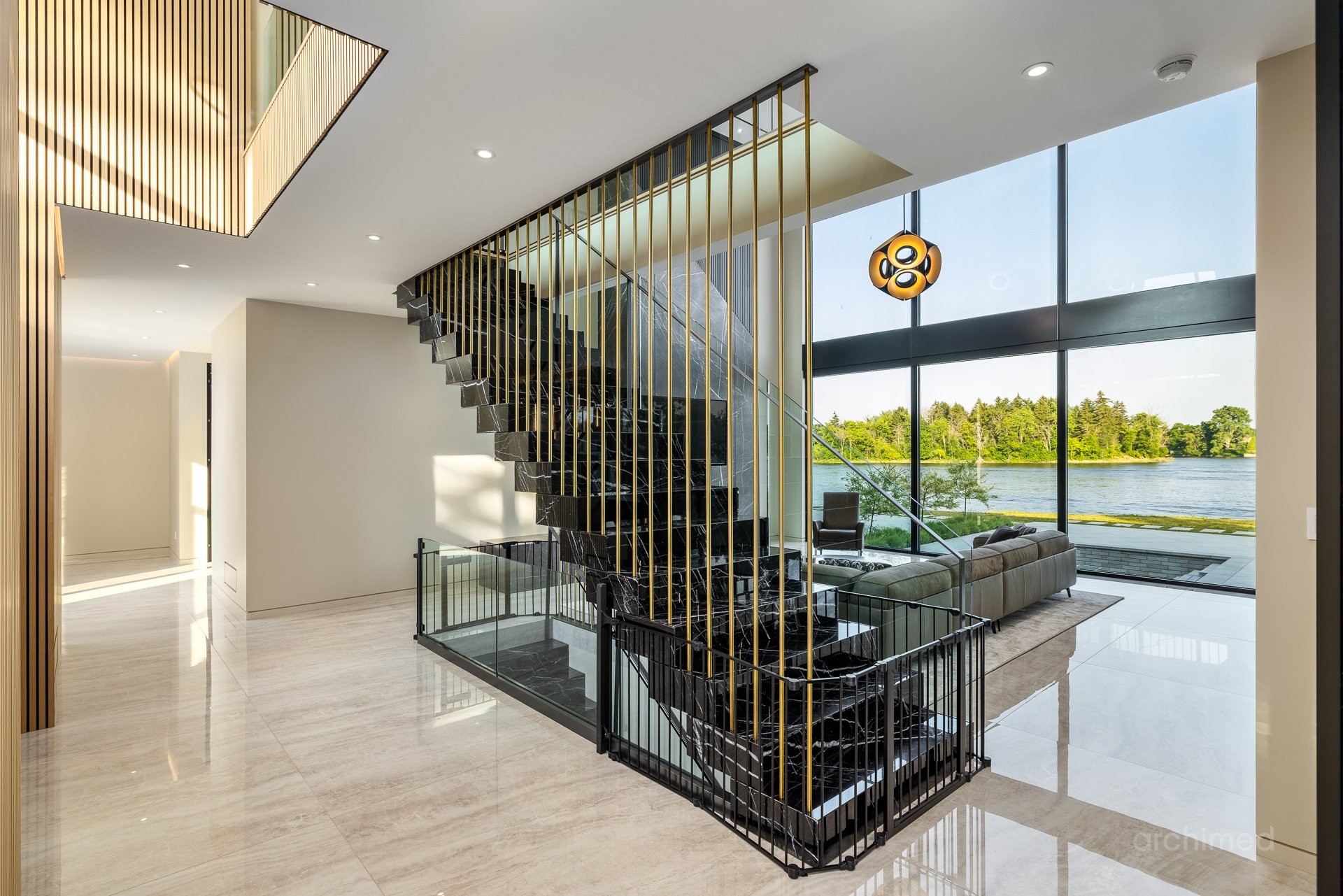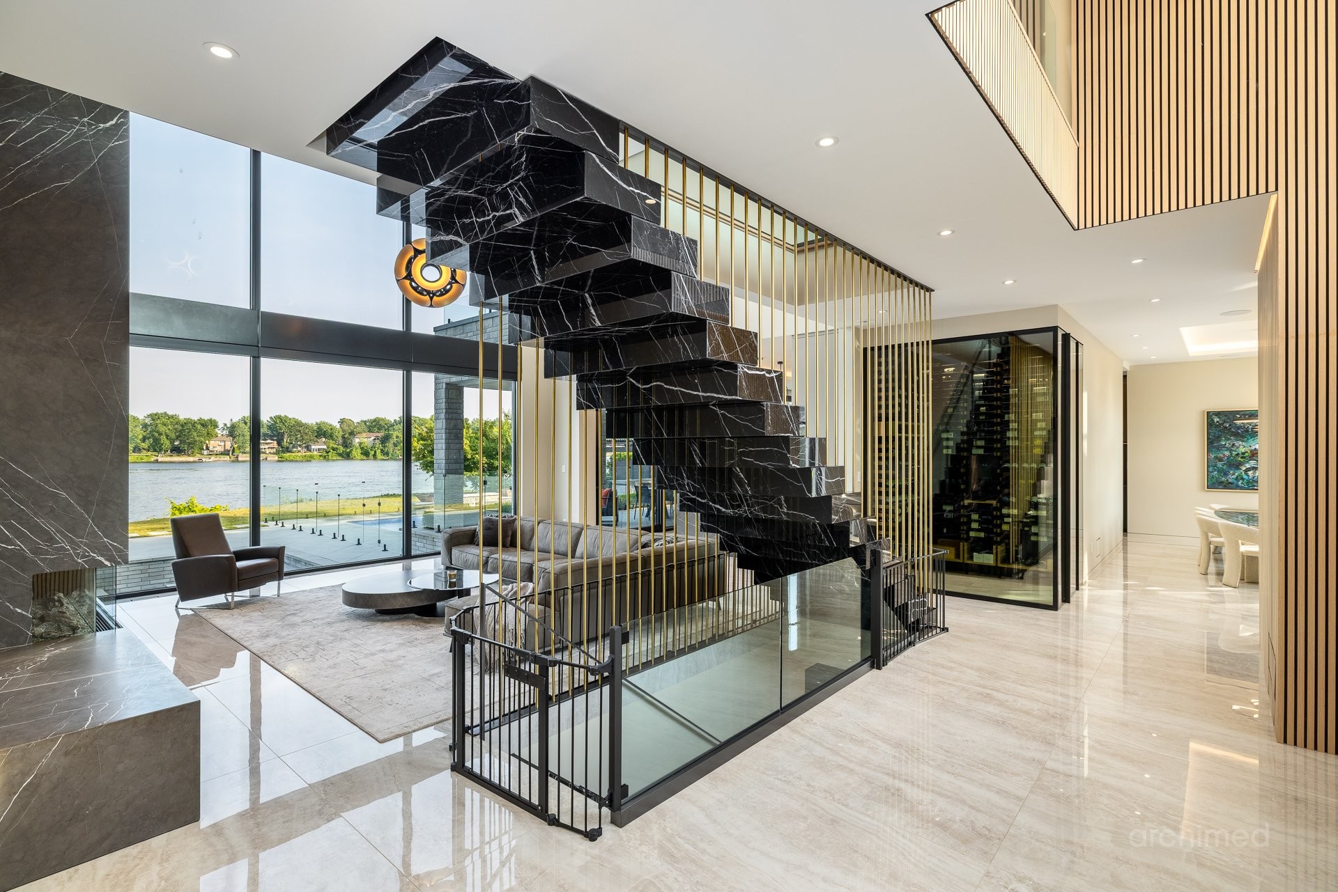 + Véritable pièce maîtresse architecturale, l'escalier flottant en marbre, conçu sur mesure, est suspendu harmonieusement et constitue le point de mire dès l'entrée+ La cuisine du chef est dotée d'un îlot central en marbre de 14 pieds, de comptoirs et d'un dosseret+ Un garde-manger de 13 pieds avec de nombreux rangements et armoires+ Le bar avec évier, lave-vaisselle et mini-réfrigérateur sont à votre disposition+ Sols carrelés en porcelaine de 12 mm+ Salle à manger séparée+ Le vaste salon offre une vue panoramique sur la Rivière des Prairies et comprend un foyer au gaz en marbre, encastré dans un plafond cathédrale de 22 pieds de haut.+ Bureau avec portes-fenêtres vitrées+ Le gym comprend une salle de bain attenante avec douche, une laveuse et sécheuse et un sauna sec. Ouvrez la porte et profitez d'un accès direct à la terrasse arrière+ Toutes les portes intérieures sont importées d'Italie+ La cave à vin est à température contrôlée, protégée contre les UV et peut contenir 500 bouteilles+ Toutes les fenêtres de la maison sont protégées contre les UV et inviolables, reliées au système d'alarme central+ Plafonds de 11 pieds