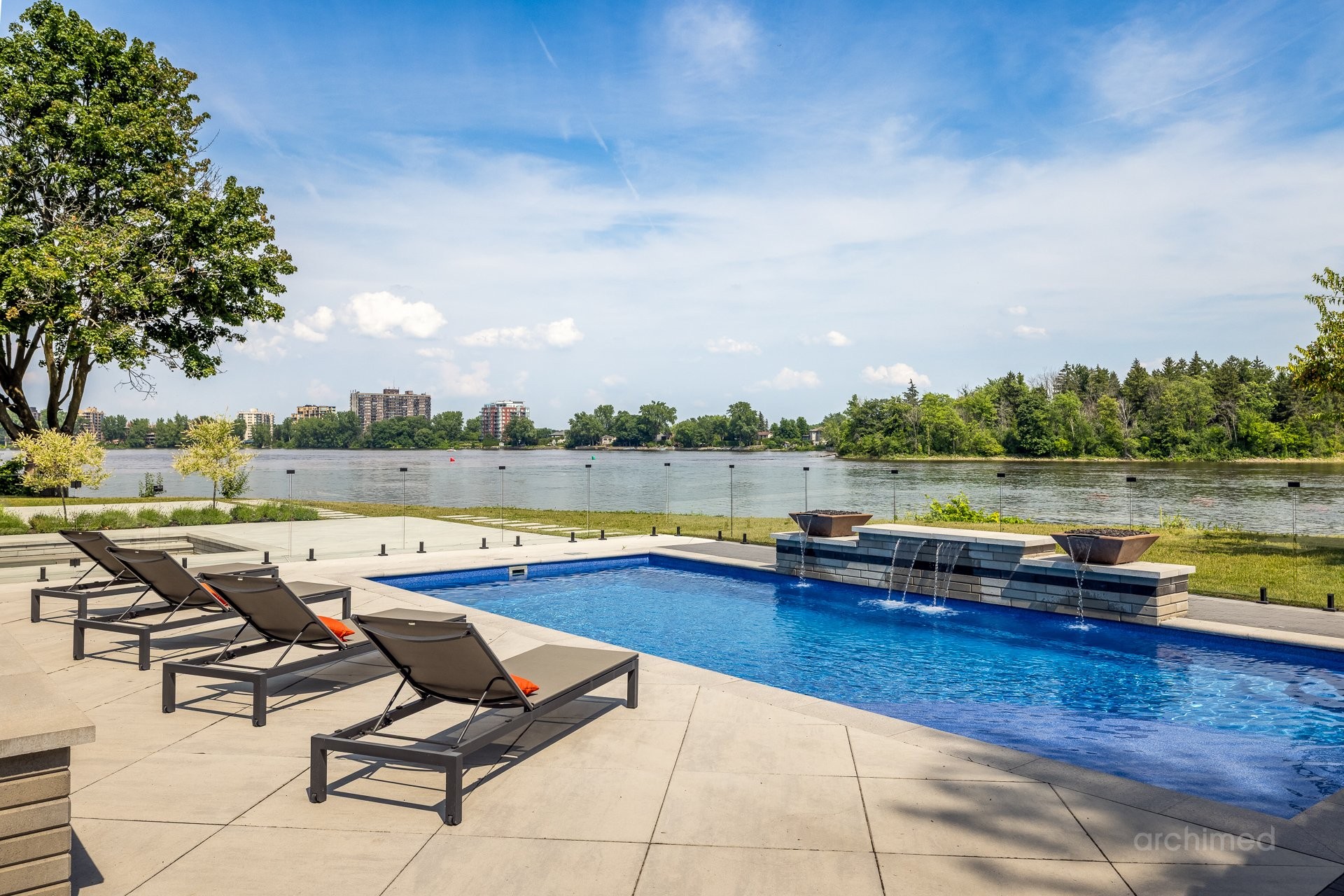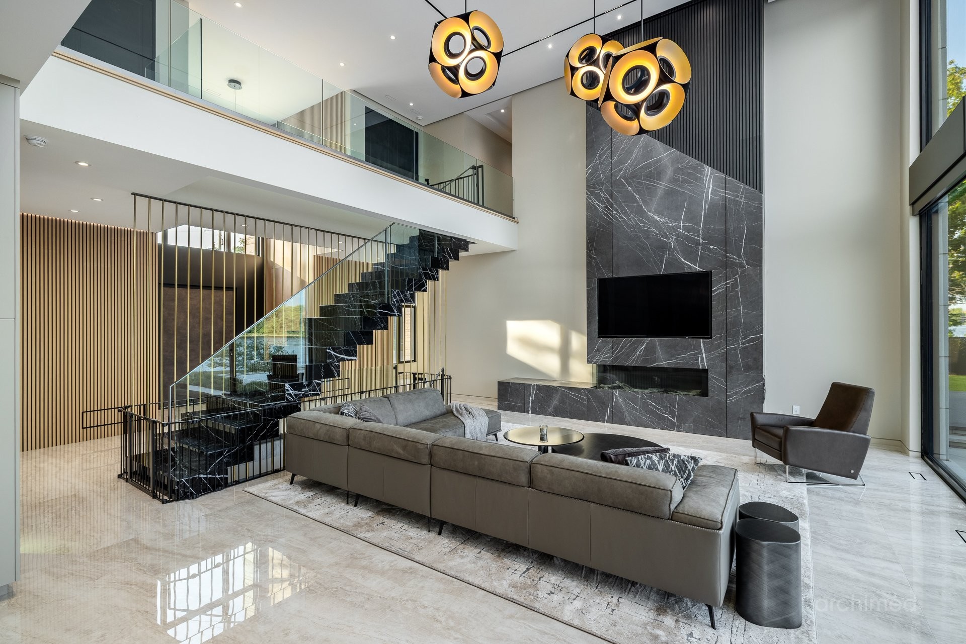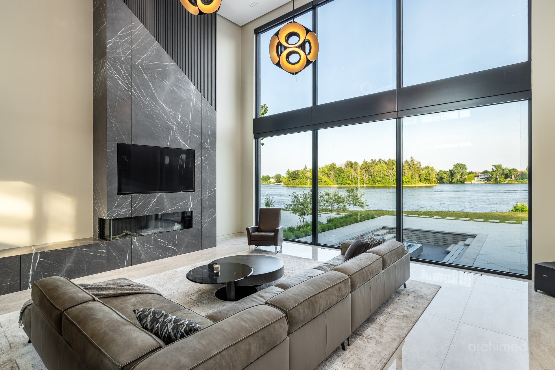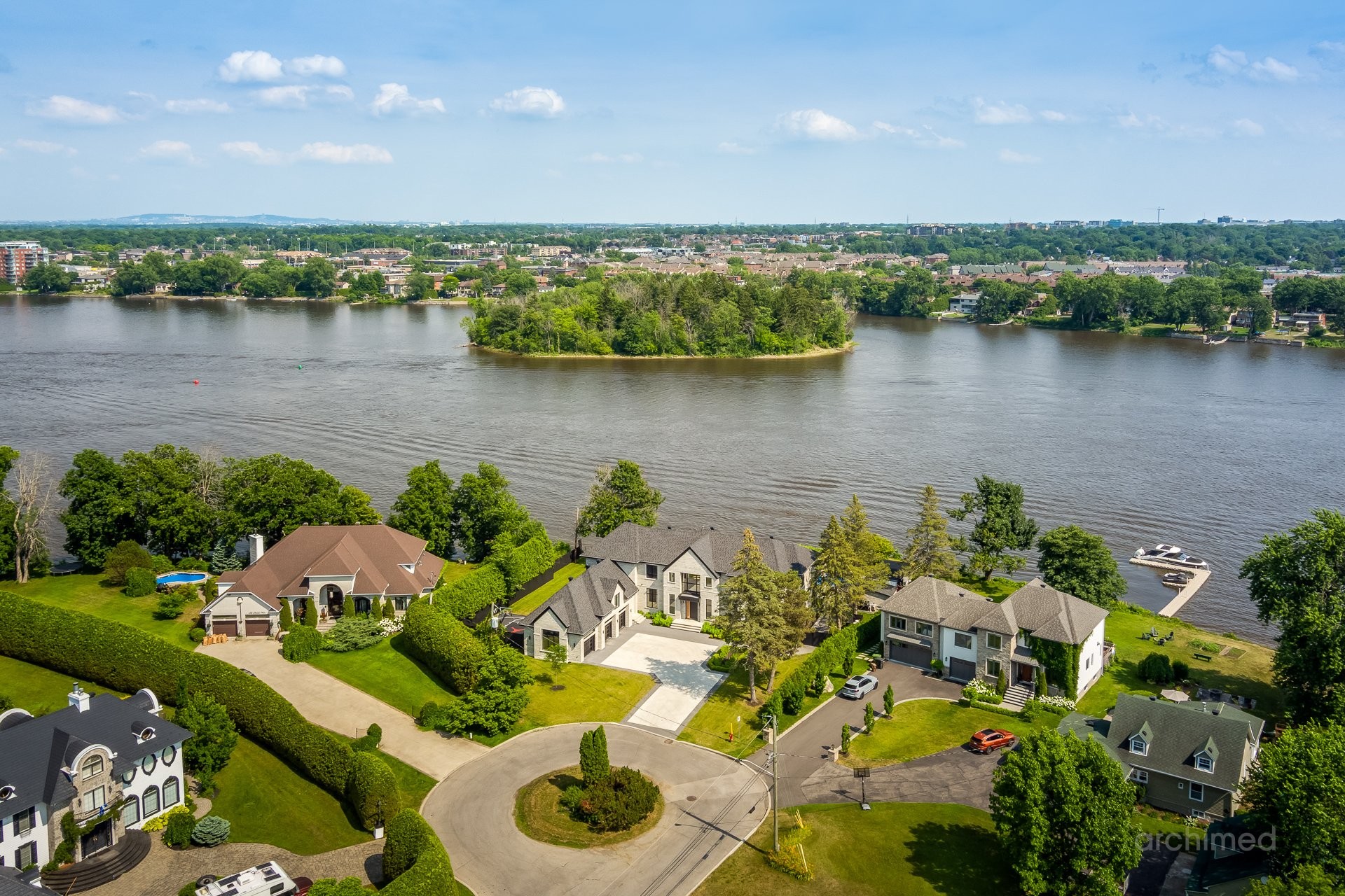 + Véritable pièce maîtresse architecturale, l'escalier flottant en marbre, conçu sur mesure, est suspendu harmonieusement et constitue le point de mire dès l'entrée+ La cuisine du chef est dotée d'un îlot central en marbre de 14 pieds, de comptoirs et d'un dosseret+ Un garde-manger de 13 pieds avec de nombreux rangements et armoires+ Le bar avec évier, lave-vaisselle et mini-réfrigérateur sont à votre disposition+ Sols carrelés en porcelaine de 12 mm+ Salle à manger séparée+ Le vaste salon offre une vue panoramique sur la Rivière des Prairies et comprend un foyer au gaz en marbre, encastré dans un plafond cathédrale de 22 pieds de haut.+ Bureau avec portes-fenêtres vitrées+ Le gym comprend une salle de bain attenante avec douche, une laveuse et sécheuse et un sauna sec. Ouvrez la porte et profitez d'un accès direct à la terrasse arrière+ Toutes les portes intérieures sont importées d'Italie+ La cave à vin est à température contrôlée, protégée contre les UV et peut contenir 500 bouteilles+ Toutes les fenêtres de la maison sont protégées contre les UV et inviolables, reliées au système d'alarme central+ Plafonds de 11 pieds