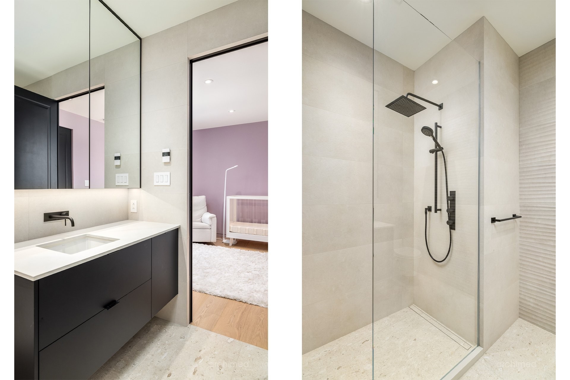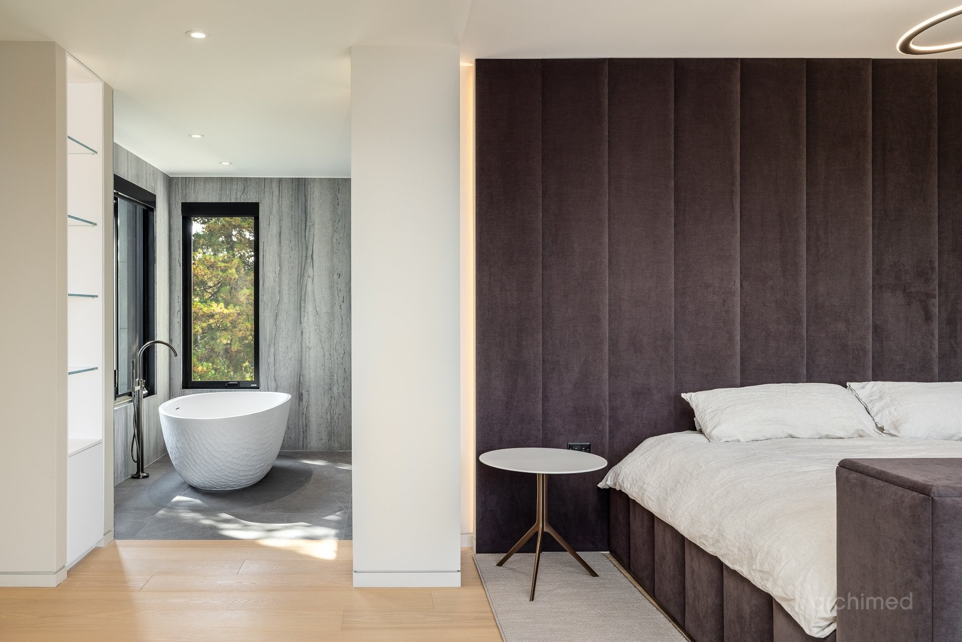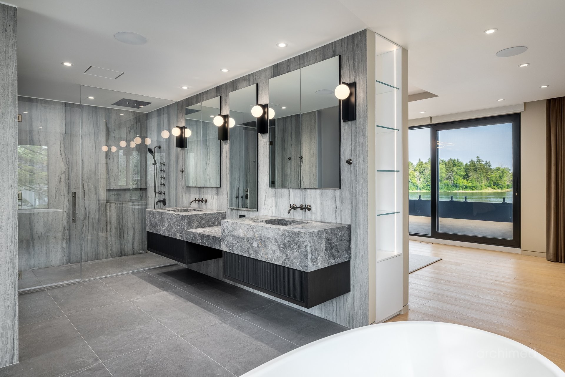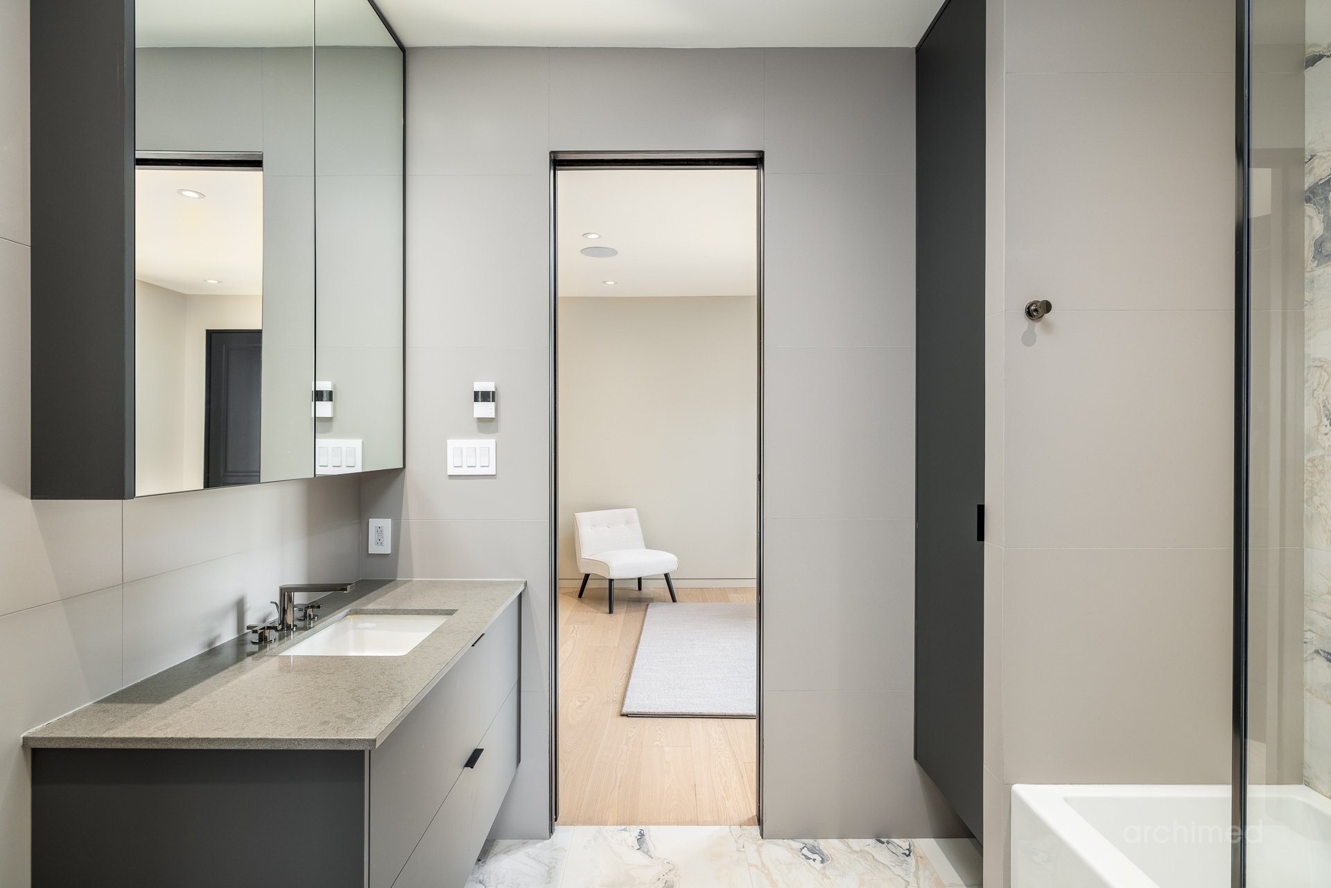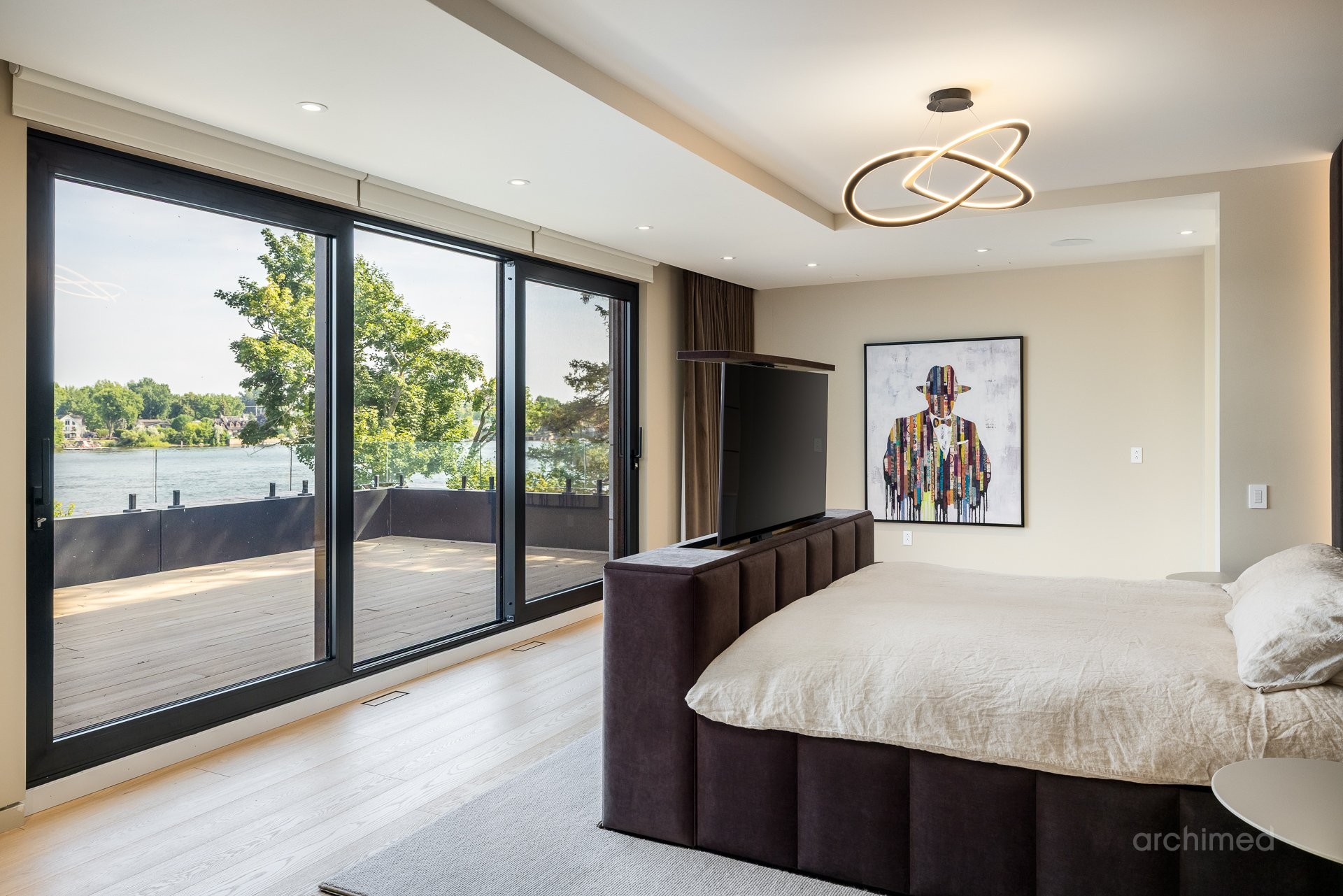 + La chambre principale est équipée d'un téléviseur escamotable parfaitement intégré, élégamment dissimulé au pied du cadre de lit et commandé par télécommande+ La salle de bain attenante est dotée de murs en marbre, de lavabos et d'une douche, de robinetterie et d'accessoires Dornbracht, ainsi que d'une baignoire Kallista indépendante.+ La salle de bain attenante mène à deux dressings séparés pour elle et lui+ Accès direct à votre balcon privé+ Plafonds de 9 pieds