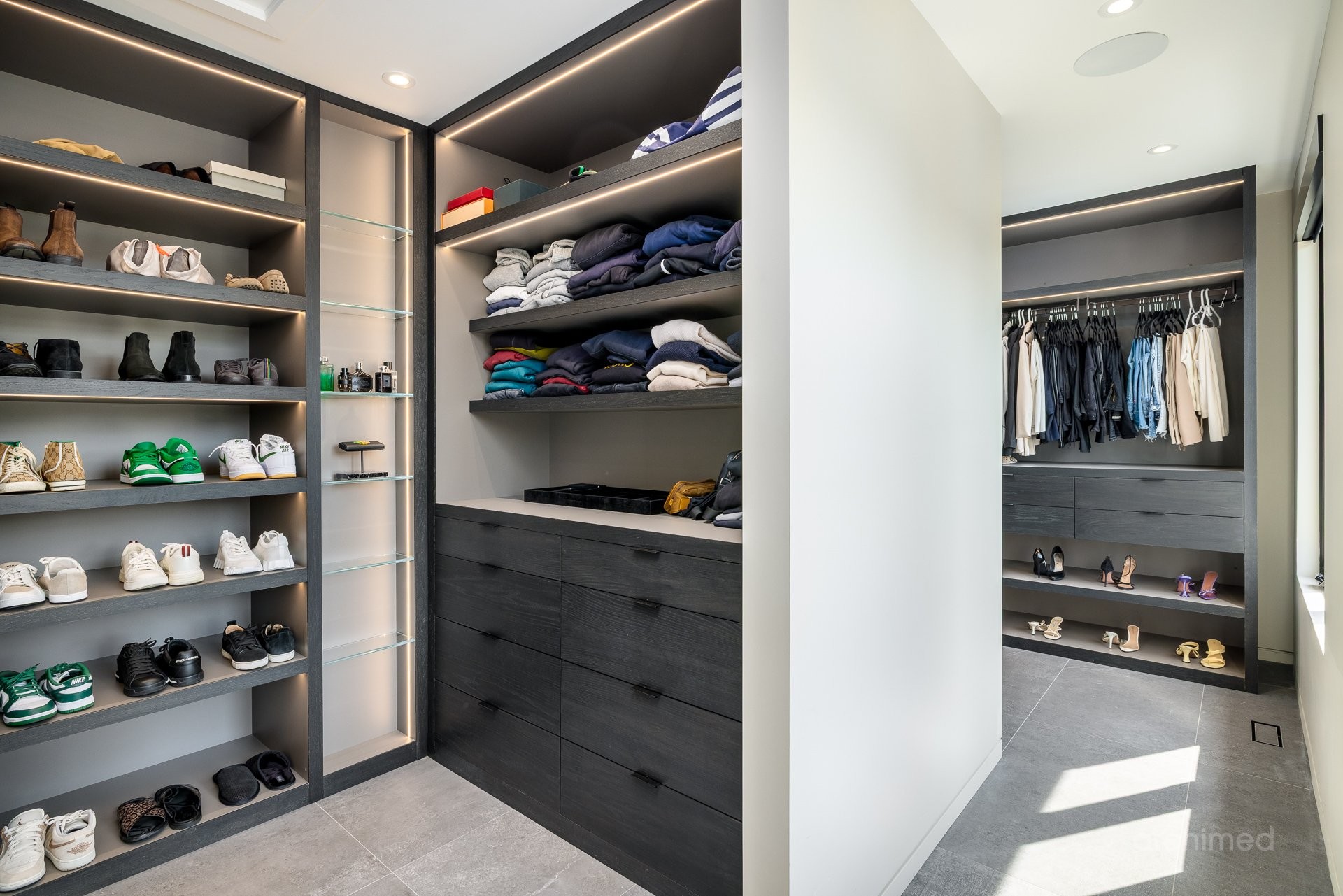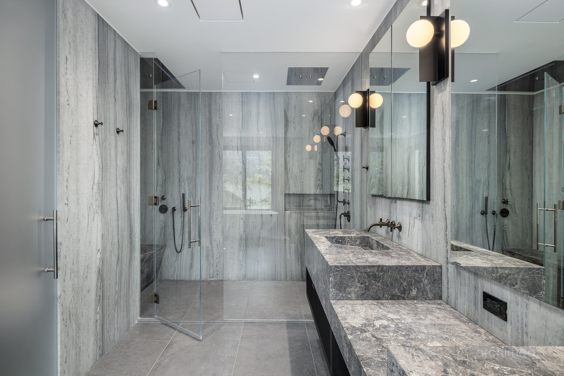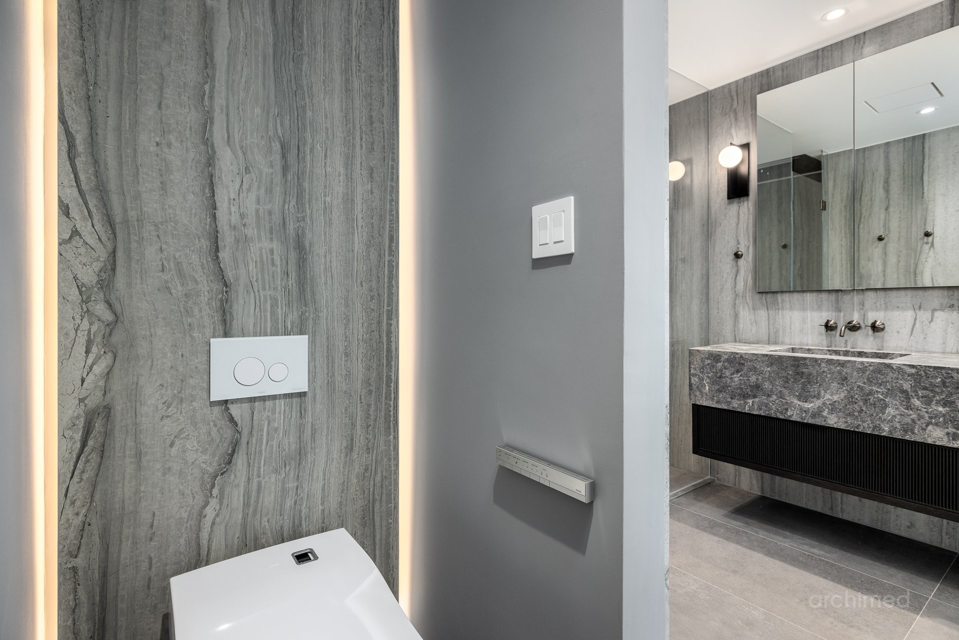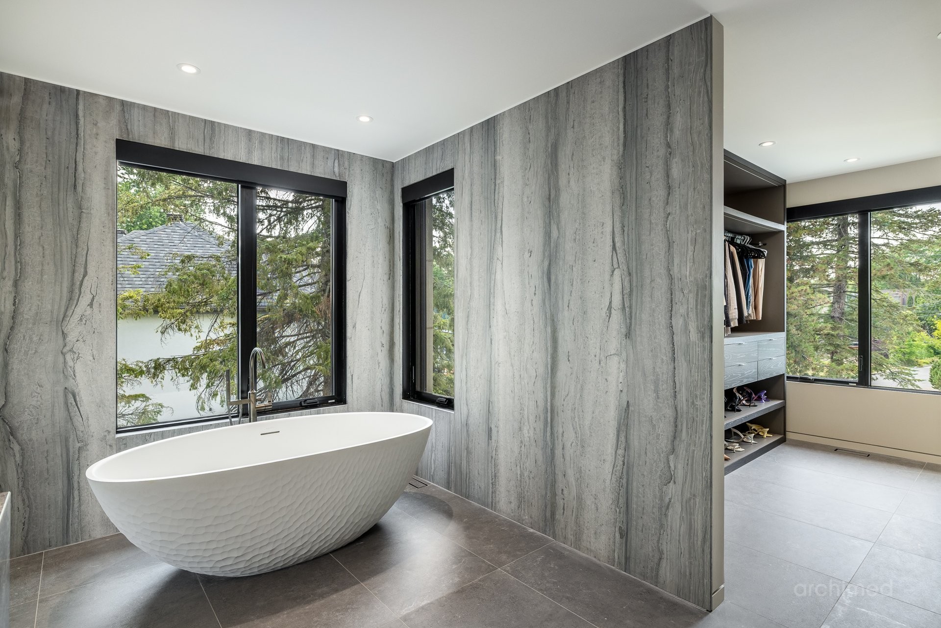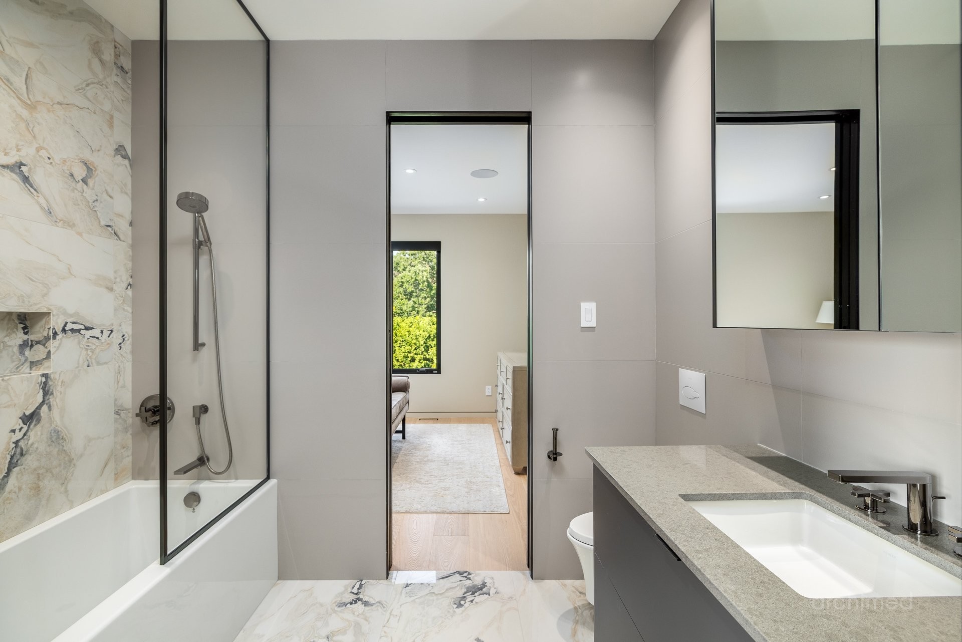 + La chambre principale est équipée d'un téléviseur escamotable parfaitement intégré, élégamment dissimulé au pied du cadre de lit et commandé par télécommande+ La salle de bain attenante est dotée de murs en marbre, de lavabos et d'une douche, de robinetterie et d'accessoires Dornbracht, ainsi que d'une baignoire Kallista indépendante.+ La salle de bain attenante mène à deux dressings séparés pour elle et lui+ Accès direct à votre balcon privé+ Plafonds de 9 pieds