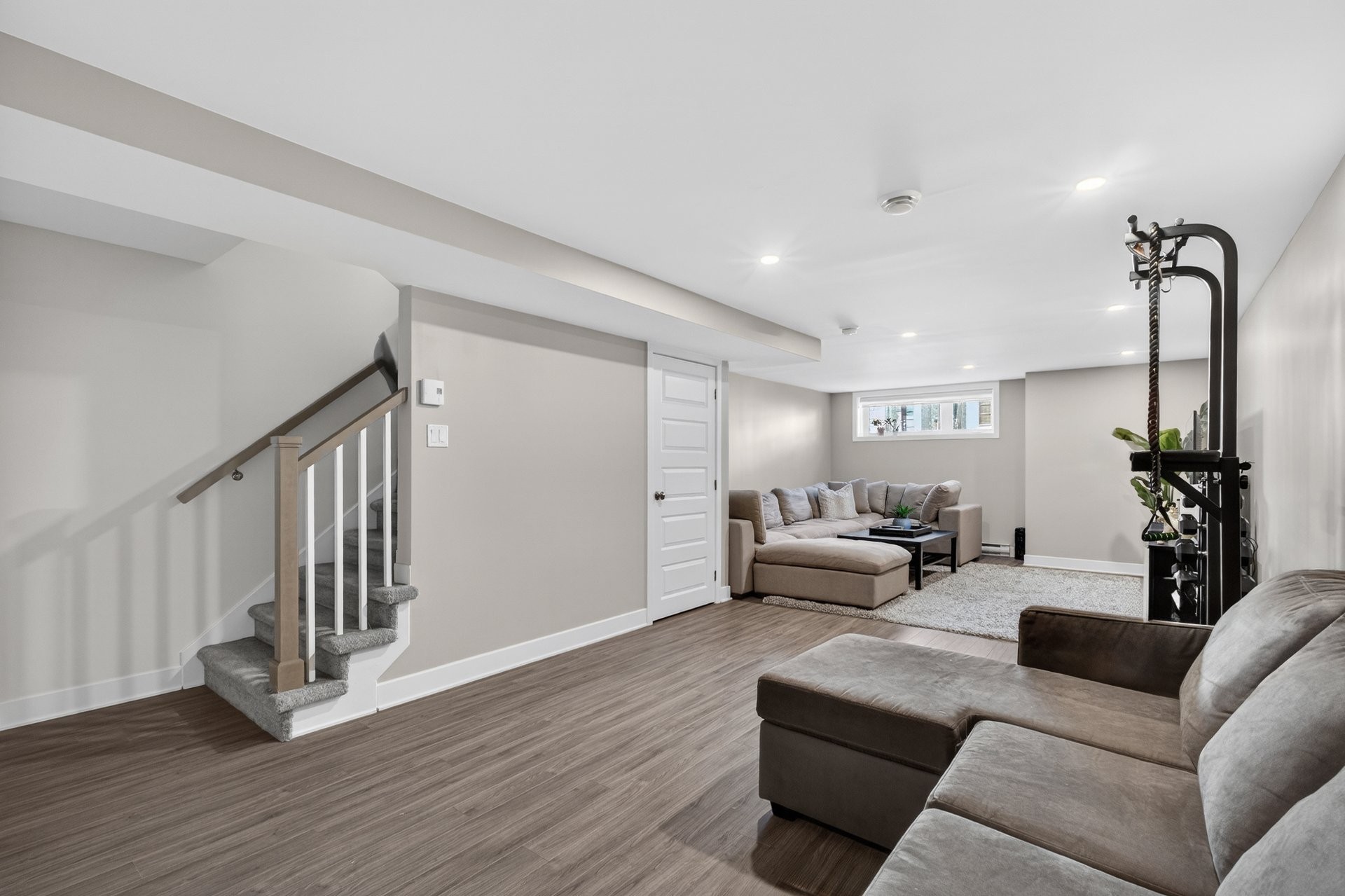 Le sous-sol aménagé est de grande dimension et équipé de plafonniers encastrés, créant un espace lumineux et accueillant. Installation brute pour salle de bain (3 pièces) déjà en place au sous-sol.