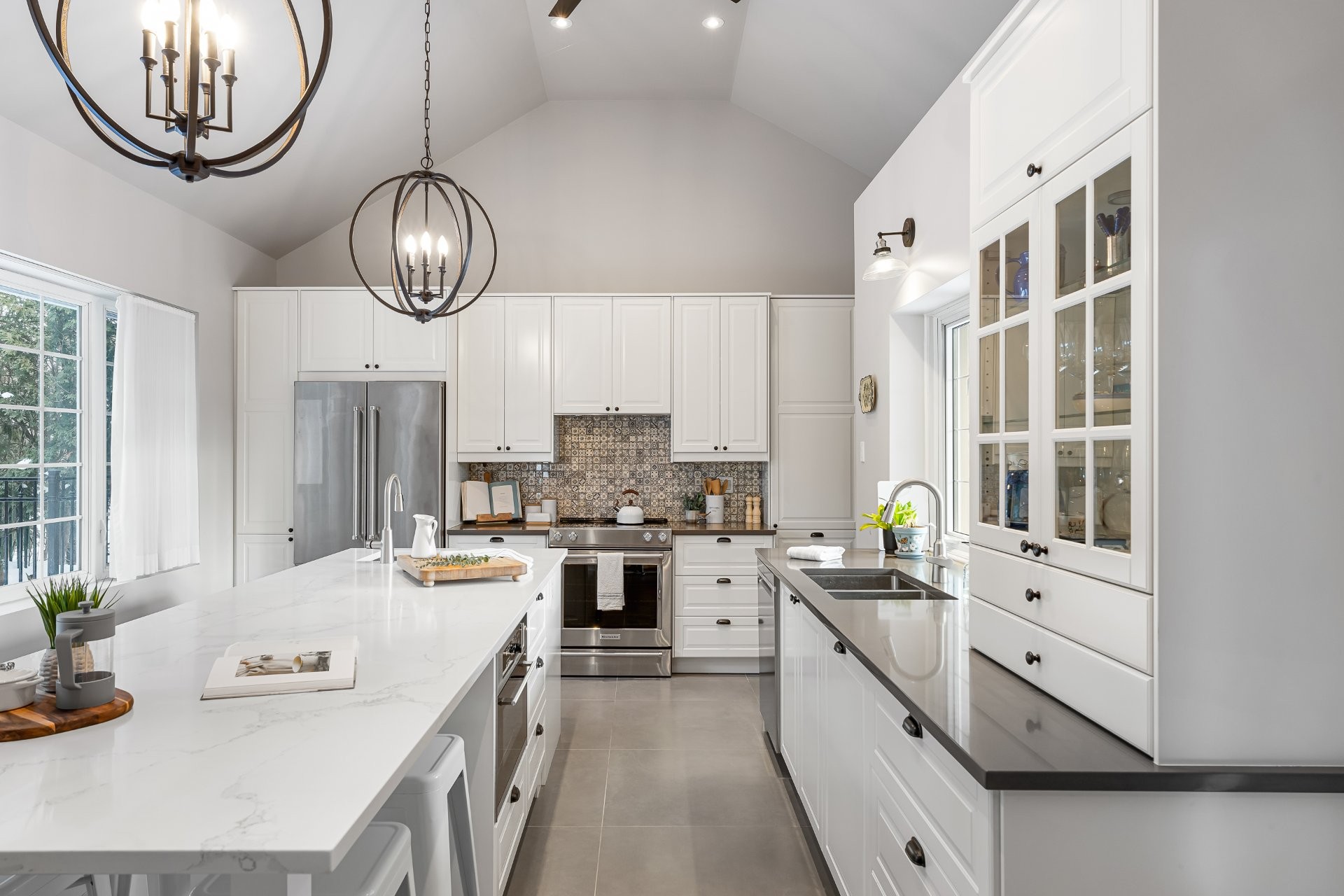 L'extérieur se distingue par une cuisine d'été entièrement équipée avec armoires en acier inoxydable, four à pizza et BBQ Napoleon en acier inoxydable, un espace rêvé pour recevoir et profiter pleinement de la belle saison.
