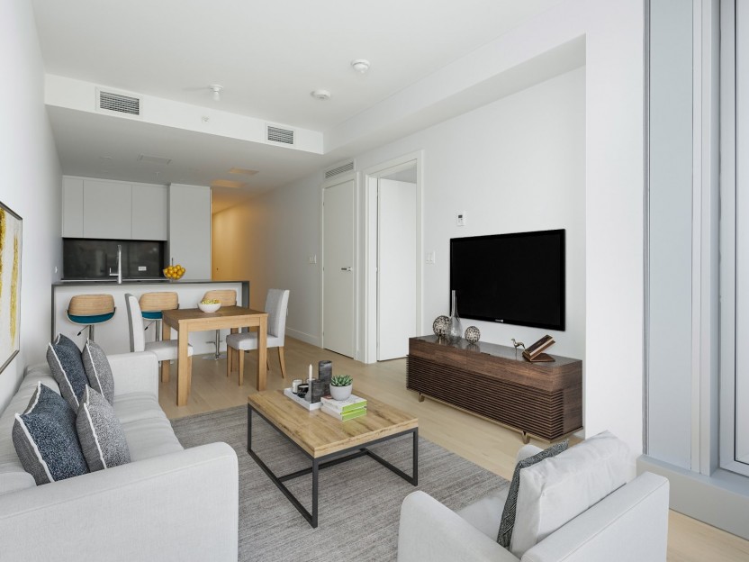 Unité de coin partiellement meublé moderne au YUL avec 2 chambres, 1 salle de bain et espace lumineux à aire ouverte. Fenêtres pleine hauteu...