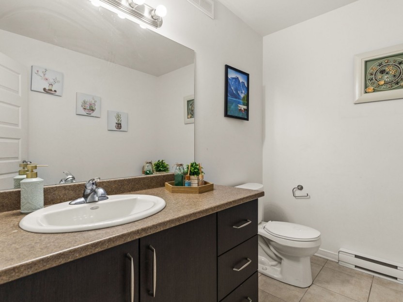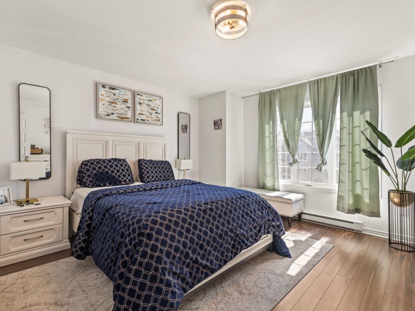 L'unité comprend deux chambres à coucher, dont une chambre principale avec penderie de type walk-in. La salle de bain est munie d'un bain-douche ainsi que d'un meuble-lavabo offrant du rangement pratique.