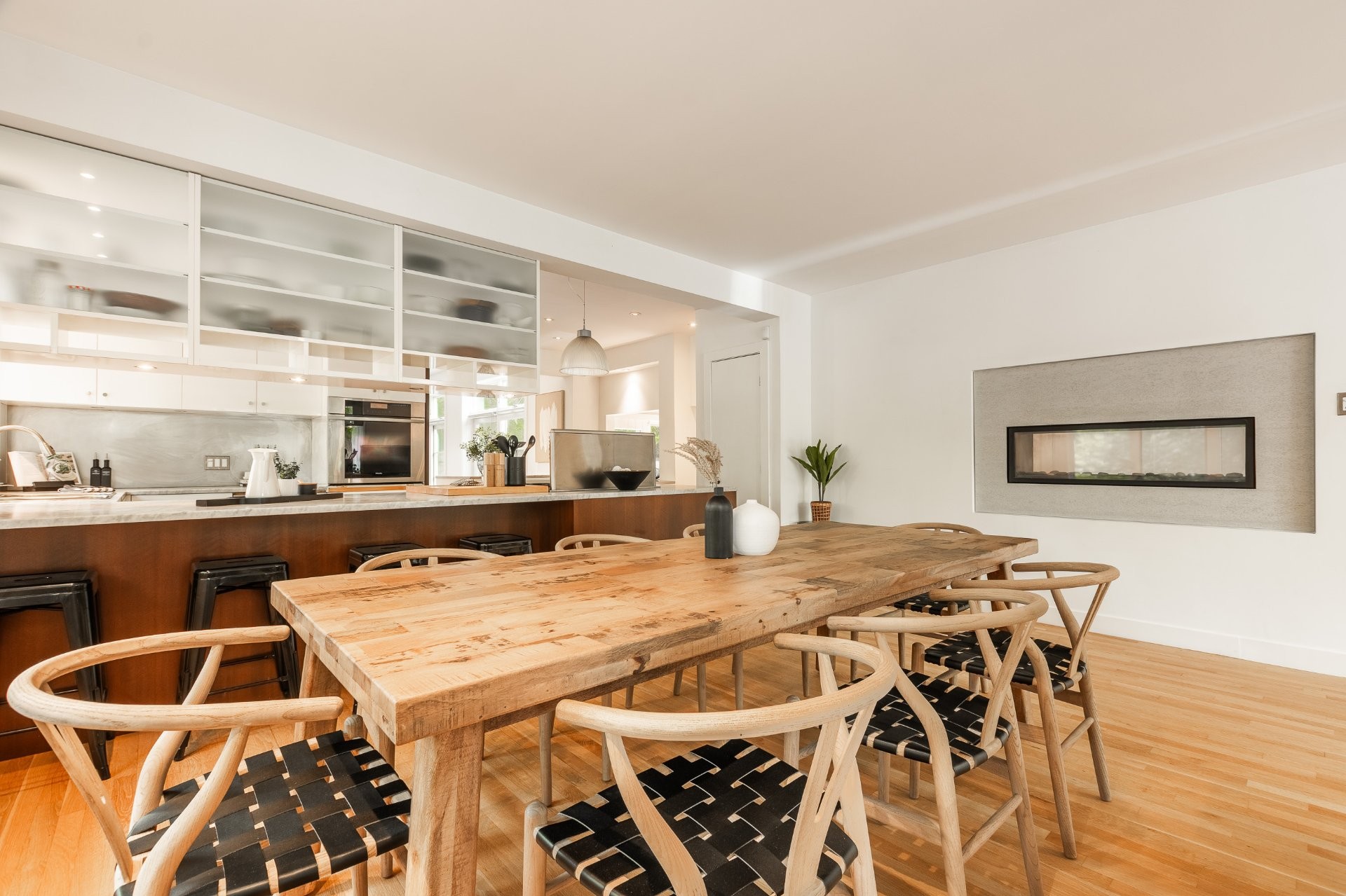 Salle à manger élégante, parquet en bois, pouvant accueillir plusieurs invites. Une cheminée à gaz sépare subtilement l'espace repas de la cuisine.