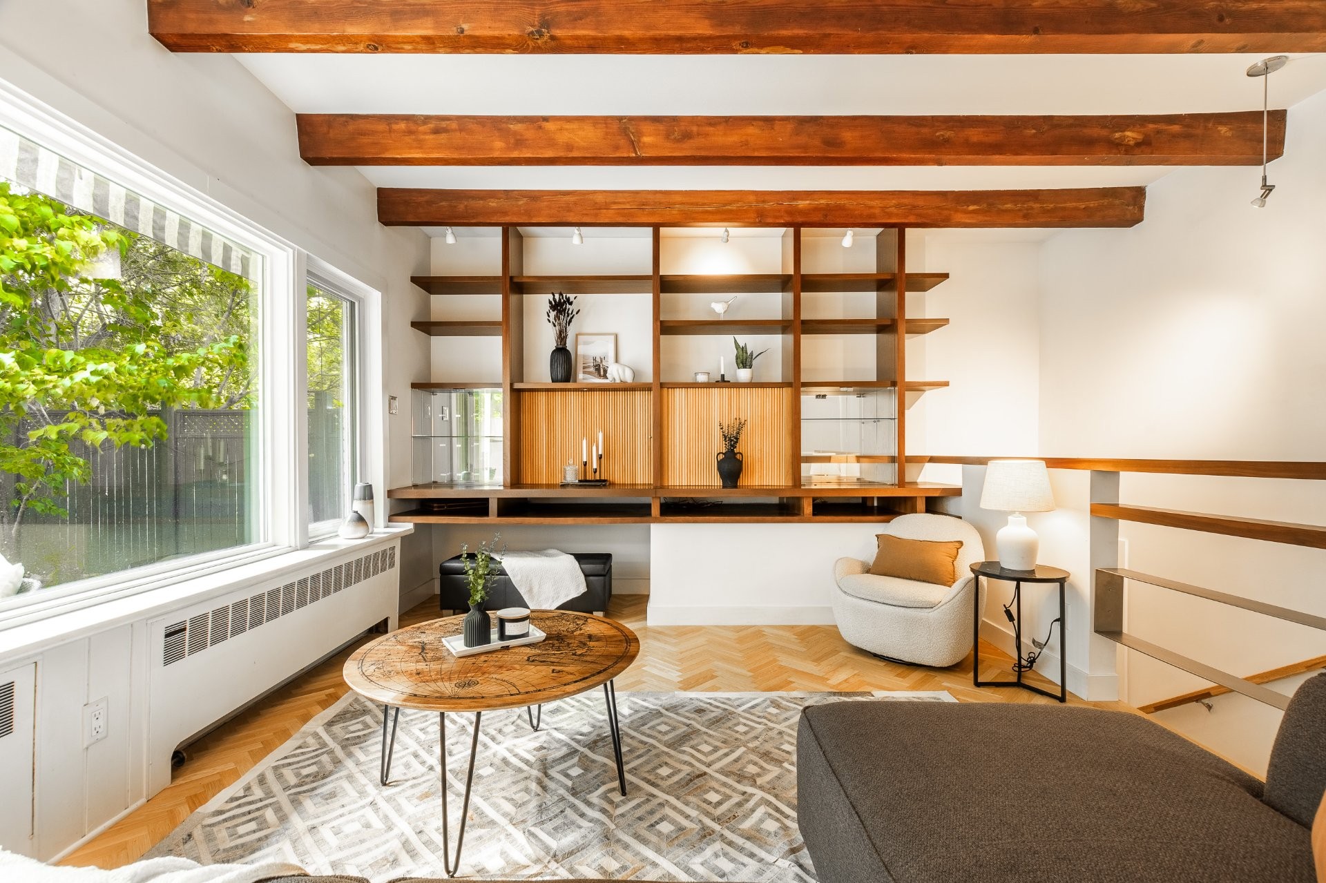 Salon raffiné avec parquet à chevrons, étagères sur mesure et poutres apparentes.