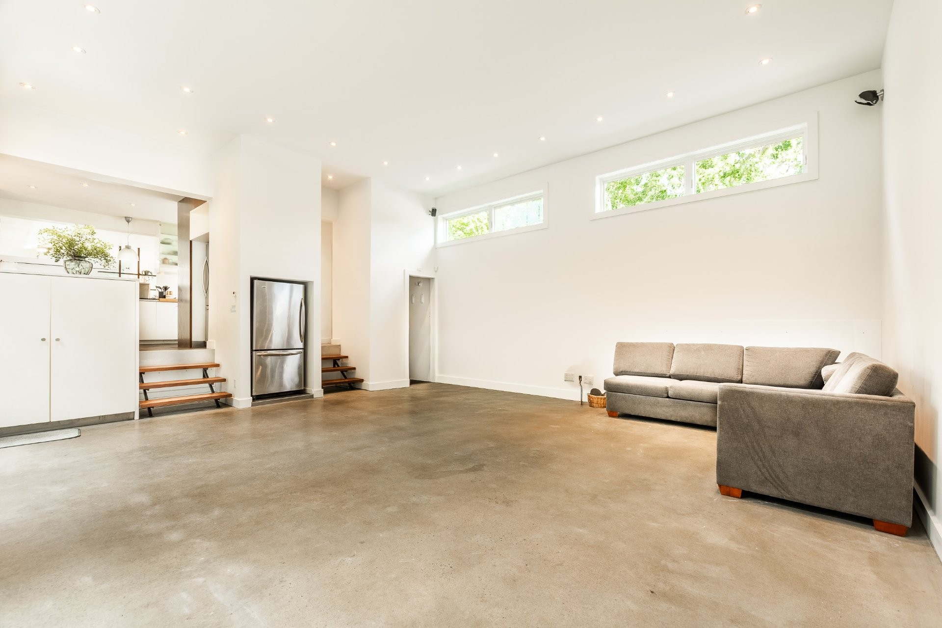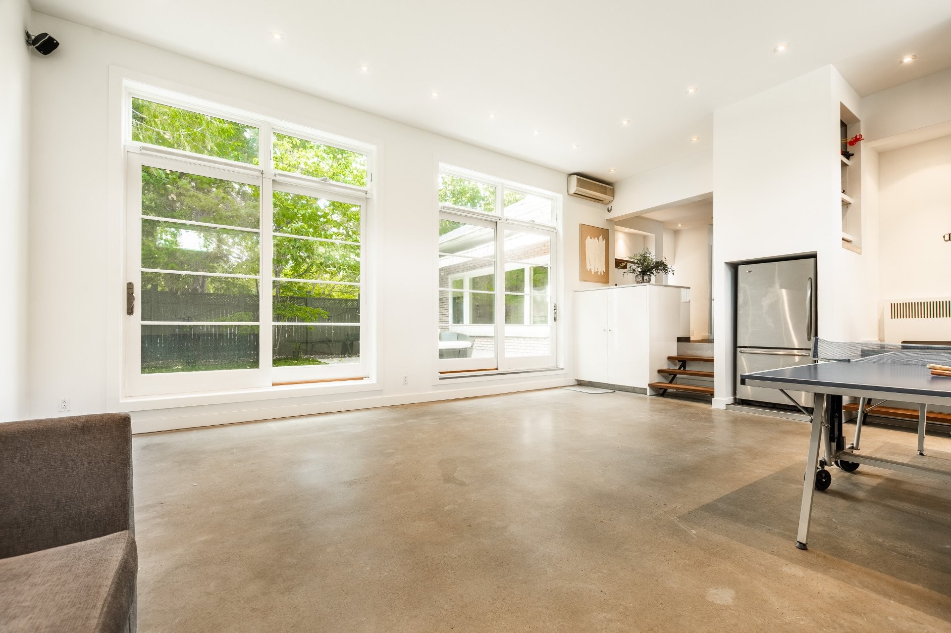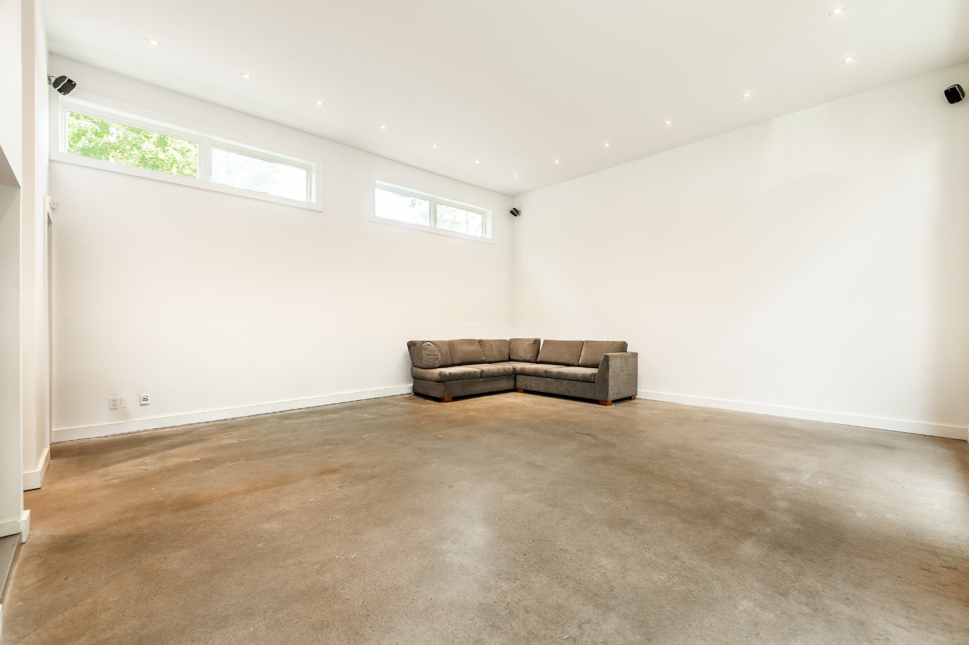 Immense salle familiale avec plafonds de 4,8 mètres, sol en béton poli, et mur de fenêtres pleine hauteur (voir photos) offrant un accès direct à l'extérieur.