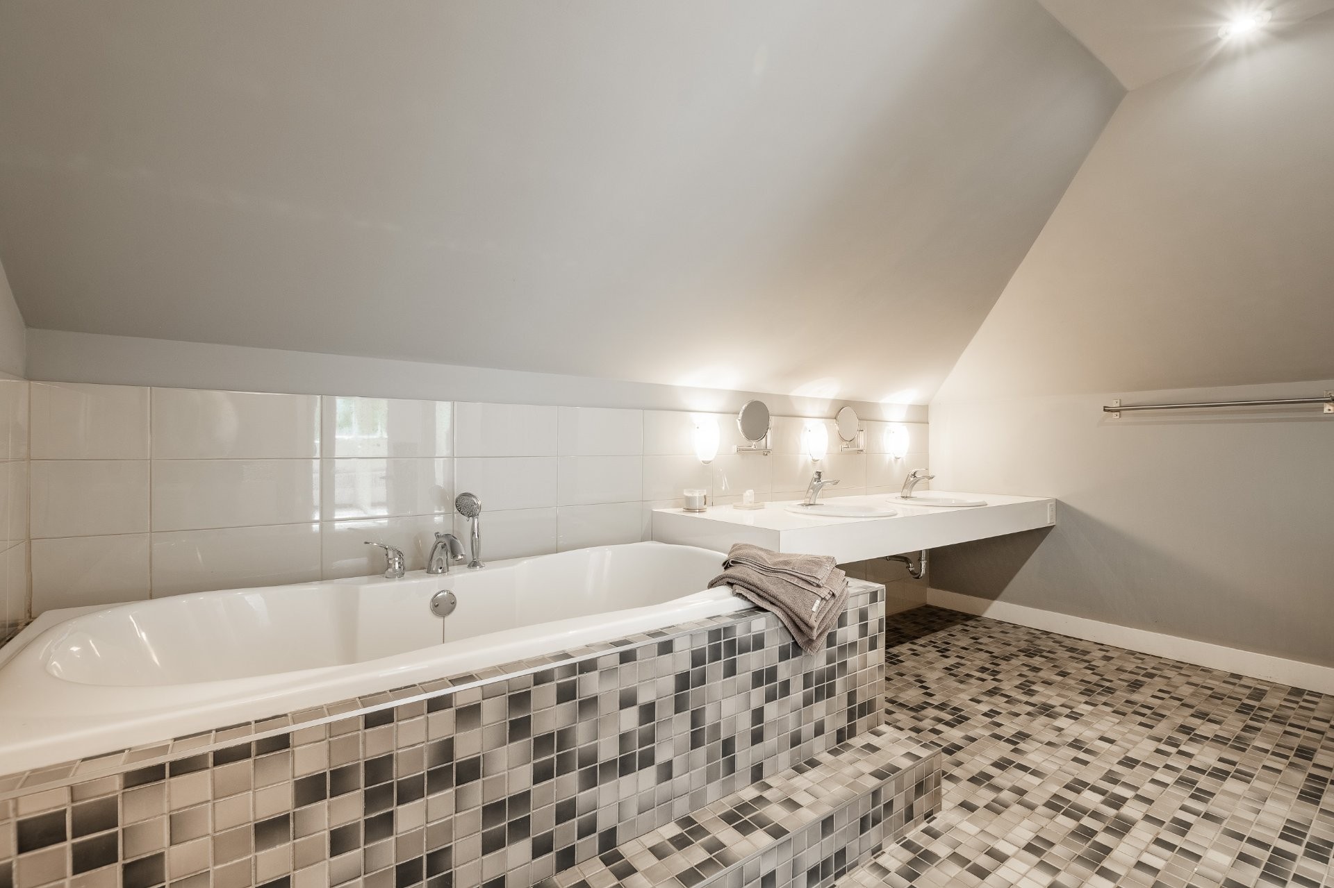 Suite principale au rez-de-chaussée, lumineuse et intime, avec salle de bain attenante.