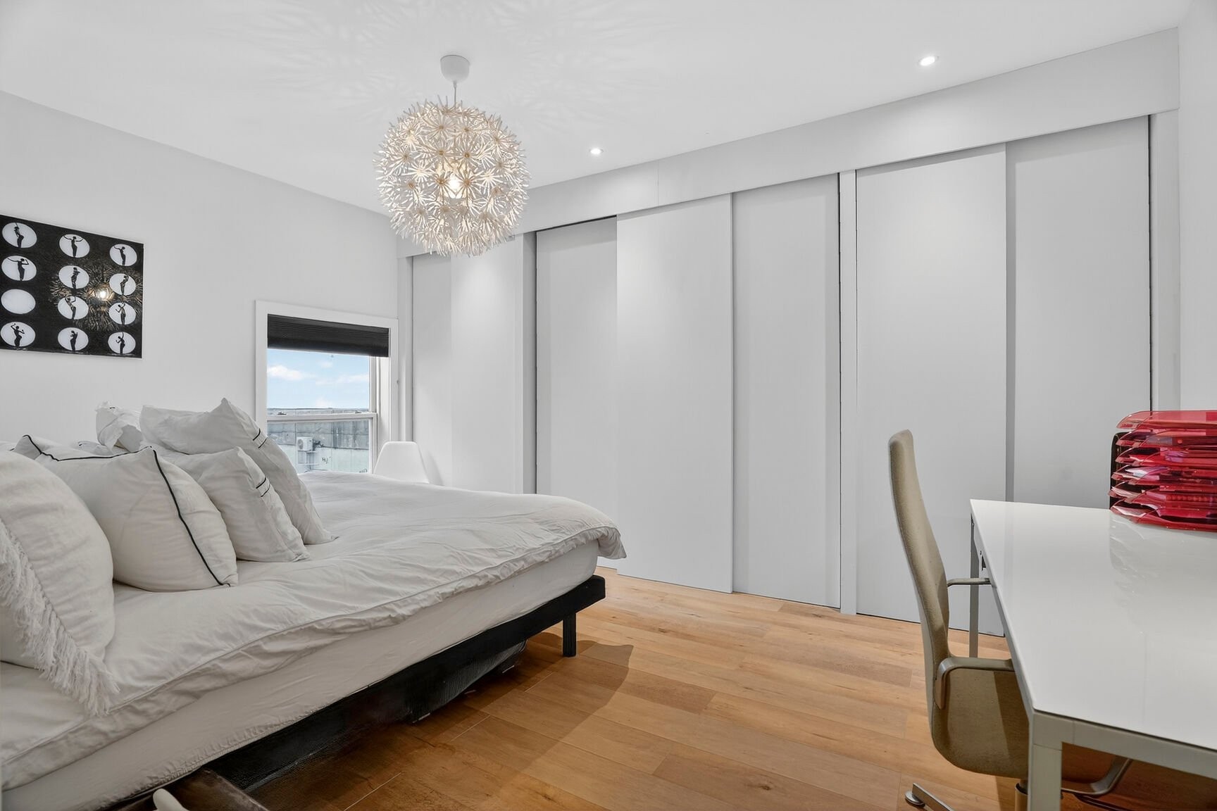 La configuration propose deux chambres généreuses, ainsi qu'un espace bureau ouvert, parfaitement intégré à l'aire de vie. L'ensemble est sublimé par une fenestration abondante courant sur toute la longueur du condo, baignant les espaces de lumière naturelle et créant une atmosphère apaisante et élégante tout au long de la journée.