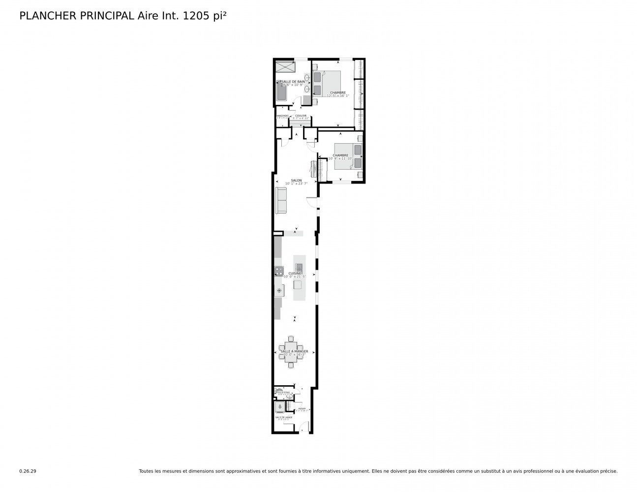 | Salon | 2ième étage | 10.1x23.7 P | Bois | Ouvert avec le bureau |