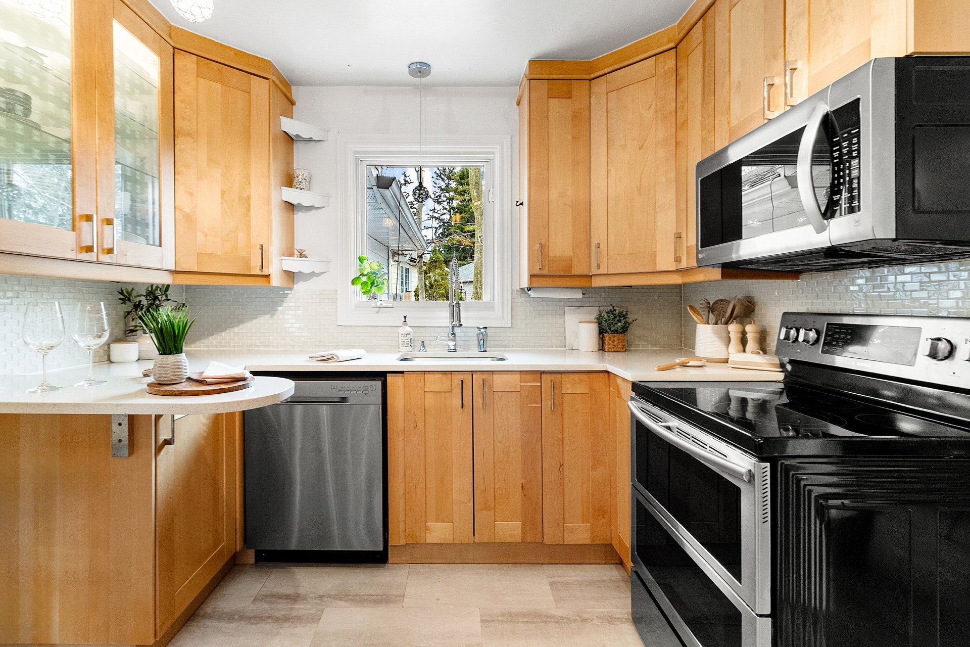 Réfrigérateur, cuisinière, lave-vaisselle, poles, luminaires permanents, aménagement d'étagères murales salle de divertissement (sous-sol) + support mural pour télévision, tablettes fixes, stores, boîtier électrique 240V pour borne de recharge