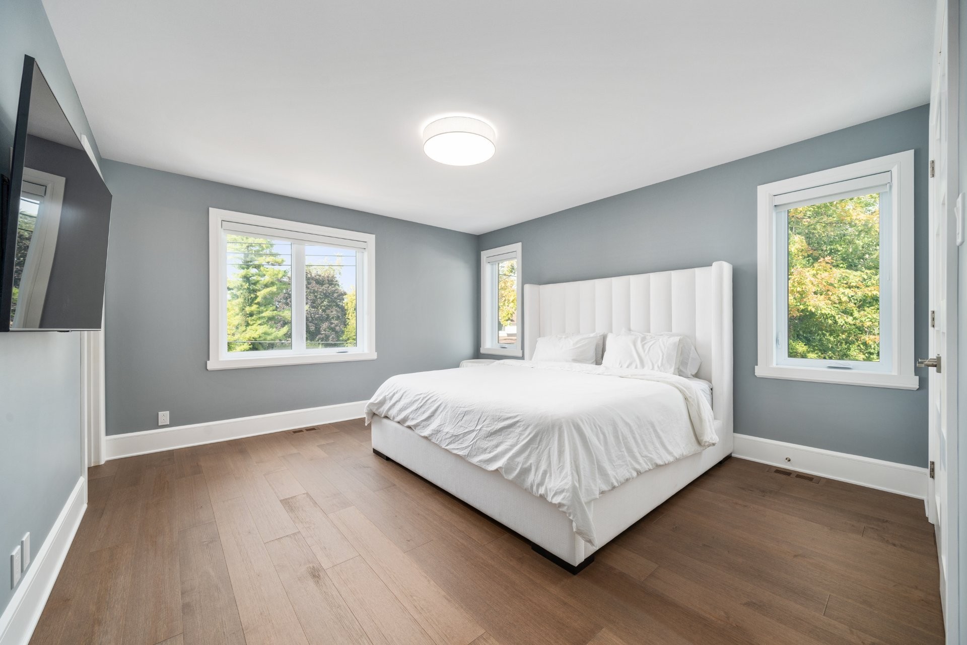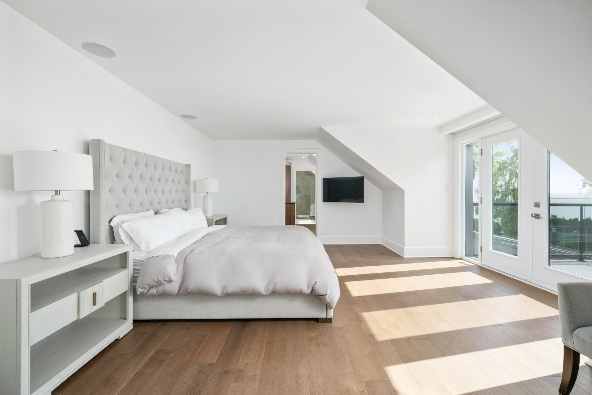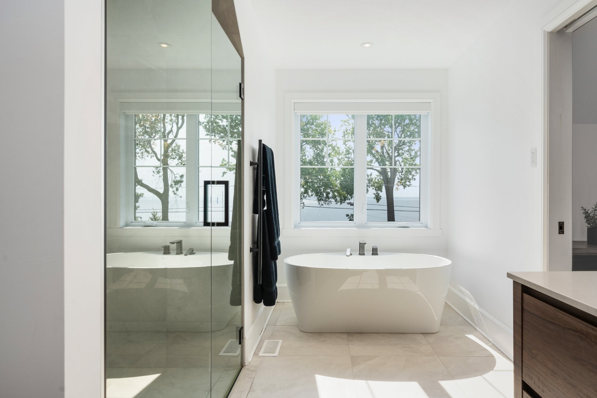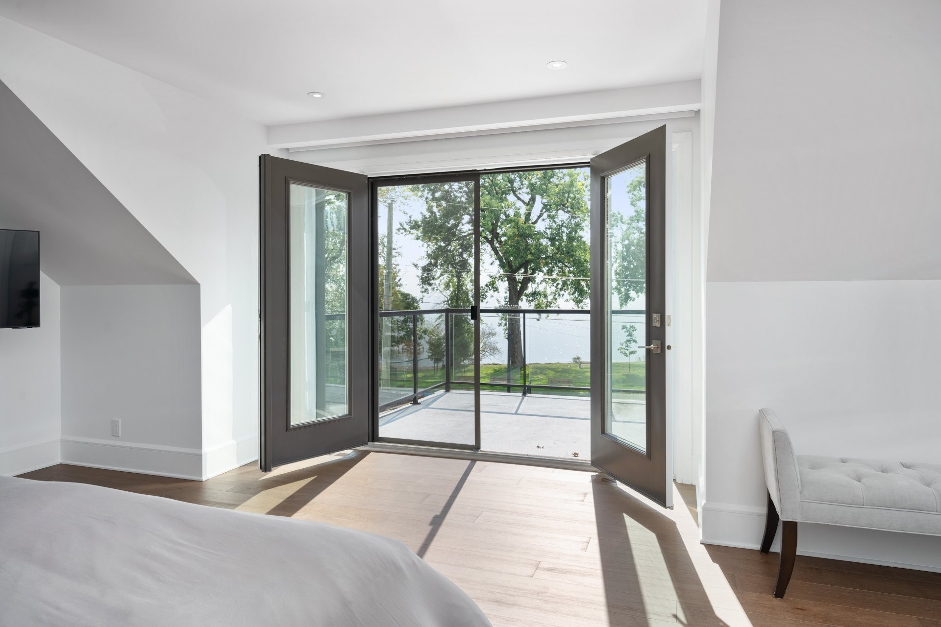À l'étage, la suite principale comprend un walk-in, une salle de bain de style spa avec douche vitrée et baignoire, ainsi qu'un balcon privé offrant une vue imprenable sur l'eau. Deux autres chambres partagent une salle de bain commune (Jack-and-Jill) tandis qu'une quatrième dispose de sa propre salle de bain. Un bureau est également disponible pour le télétravail.