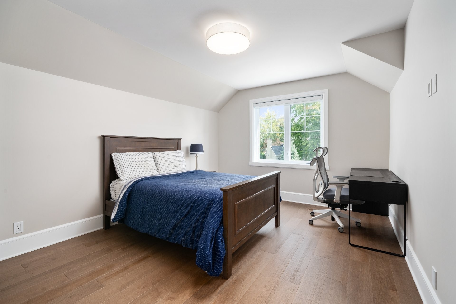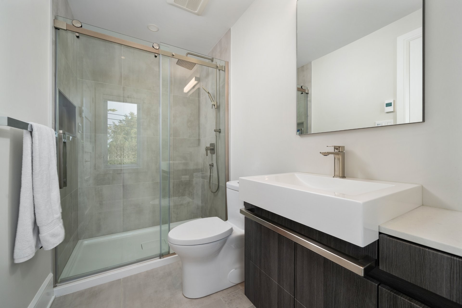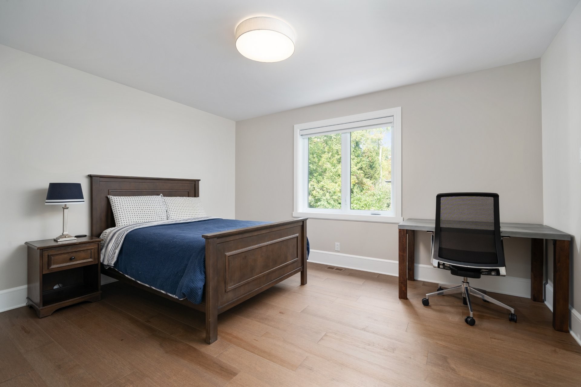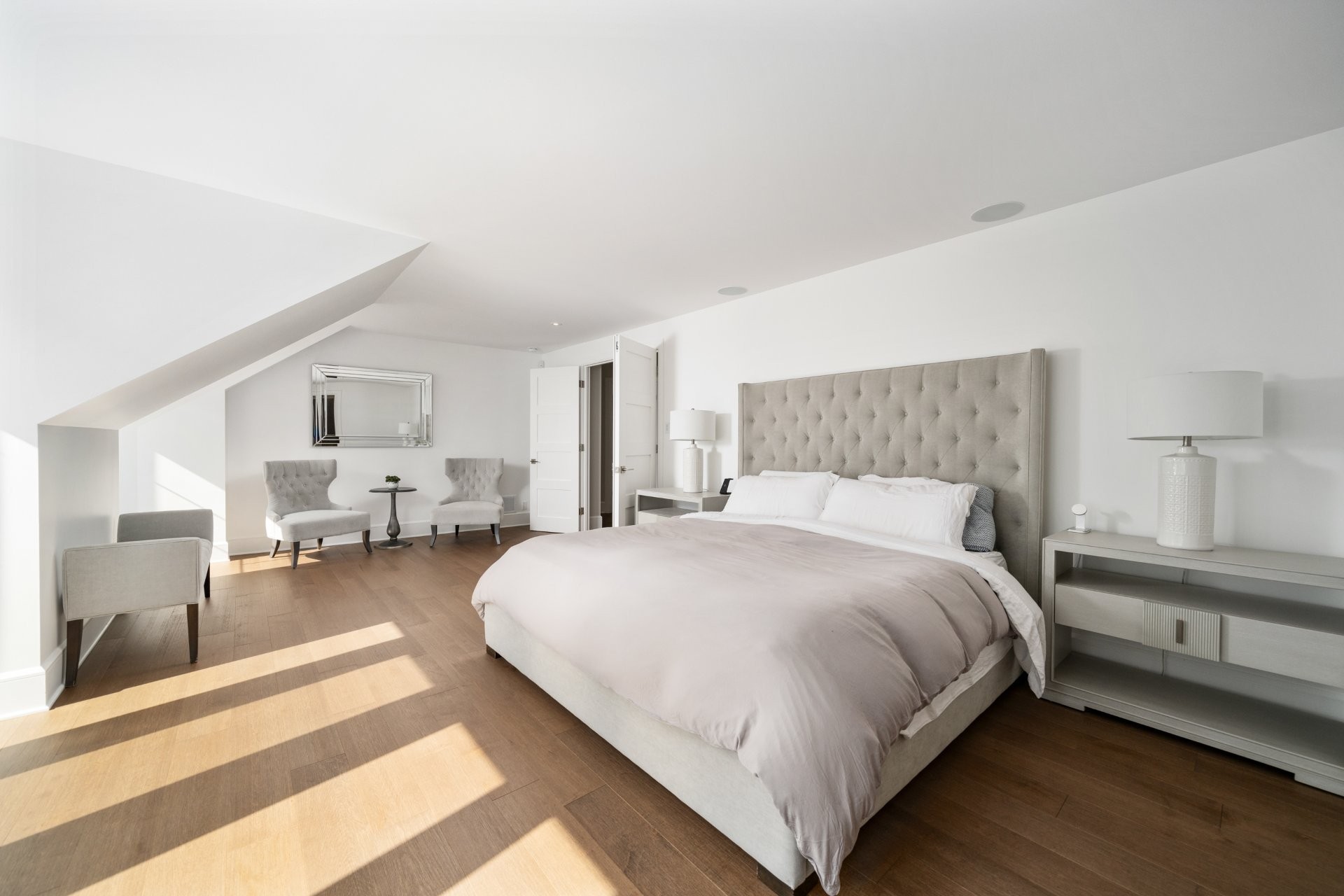 À l'étage, la suite principale comprend un walk-in, une salle de bain de style spa avec douche vitrée et baignoire, ainsi qu'un balcon privé offrant une vue imprenable sur l'eau. Deux autres chambres partagent une salle de bain commune (Jack-and-Jill) tandis qu'une quatrième dispose de sa propre salle de bain. Un bureau est également disponible pour le télétravail.