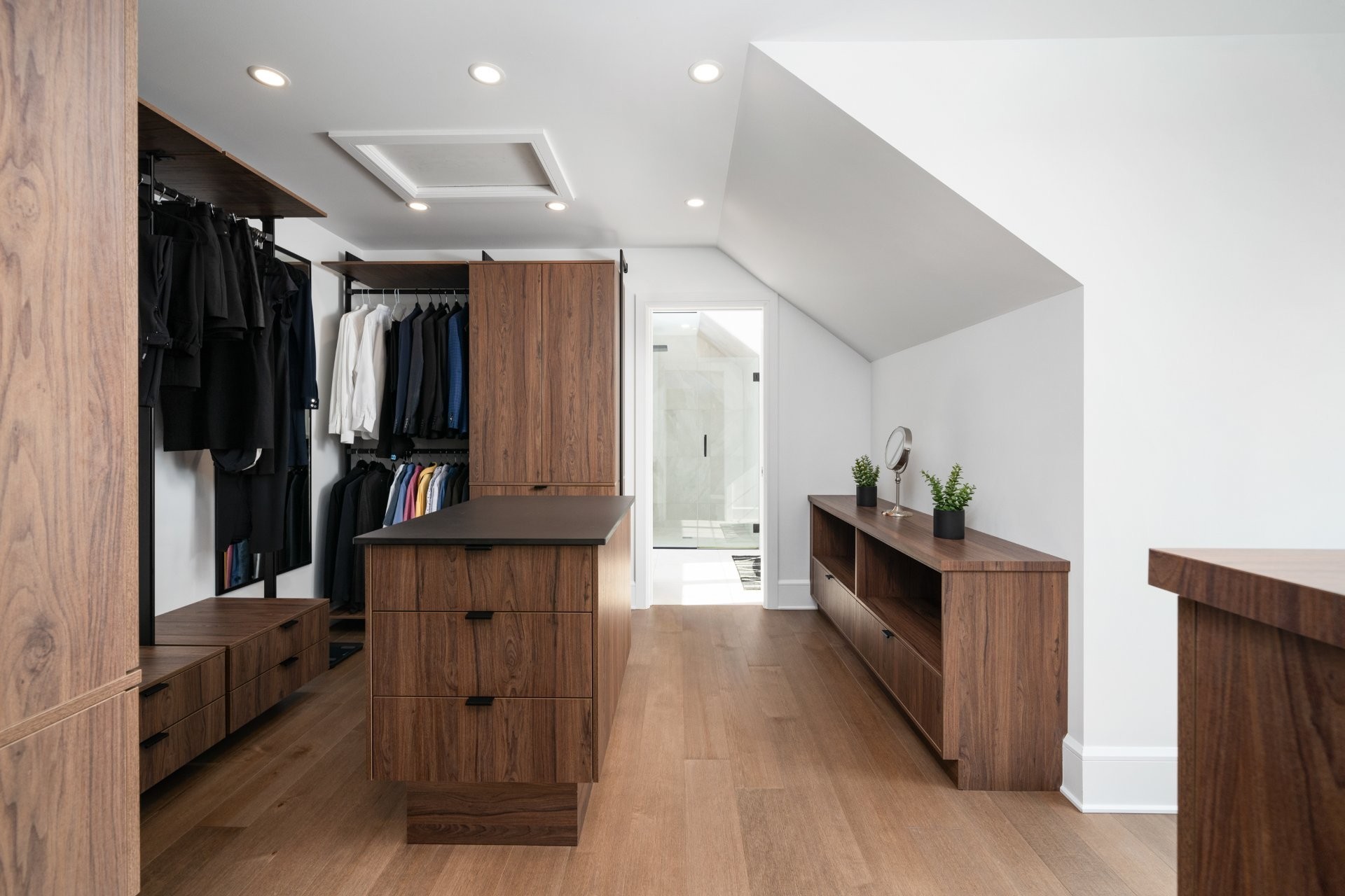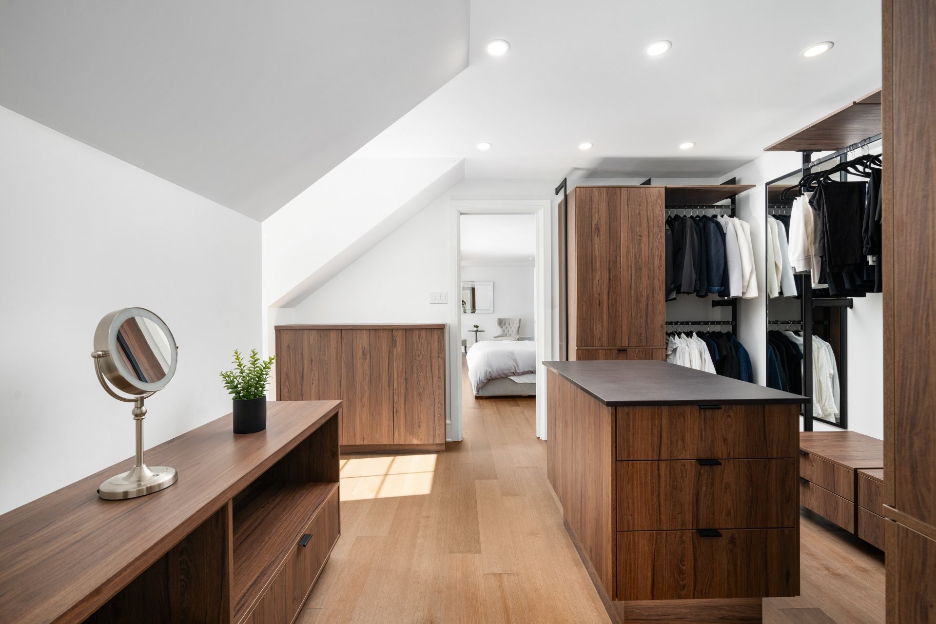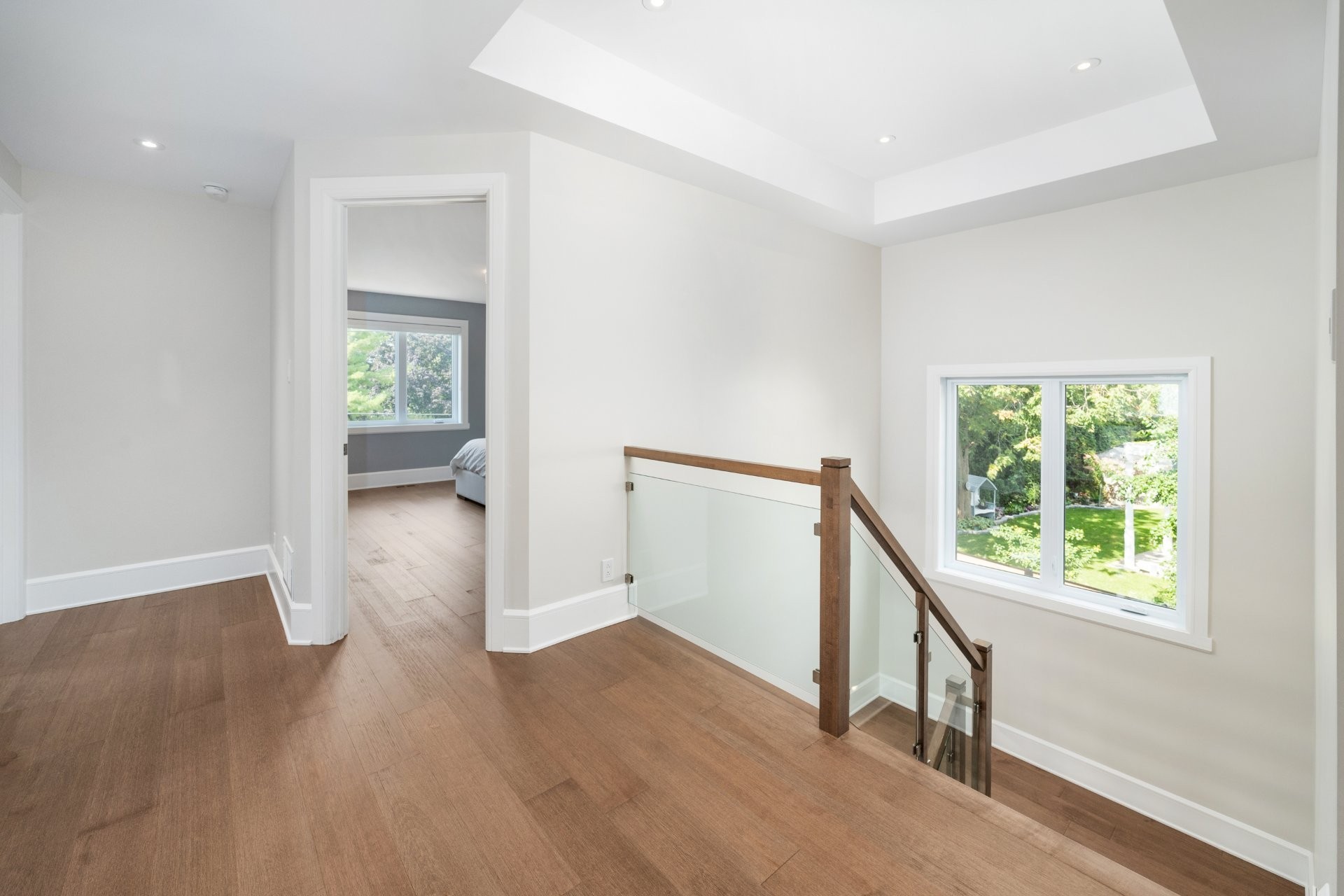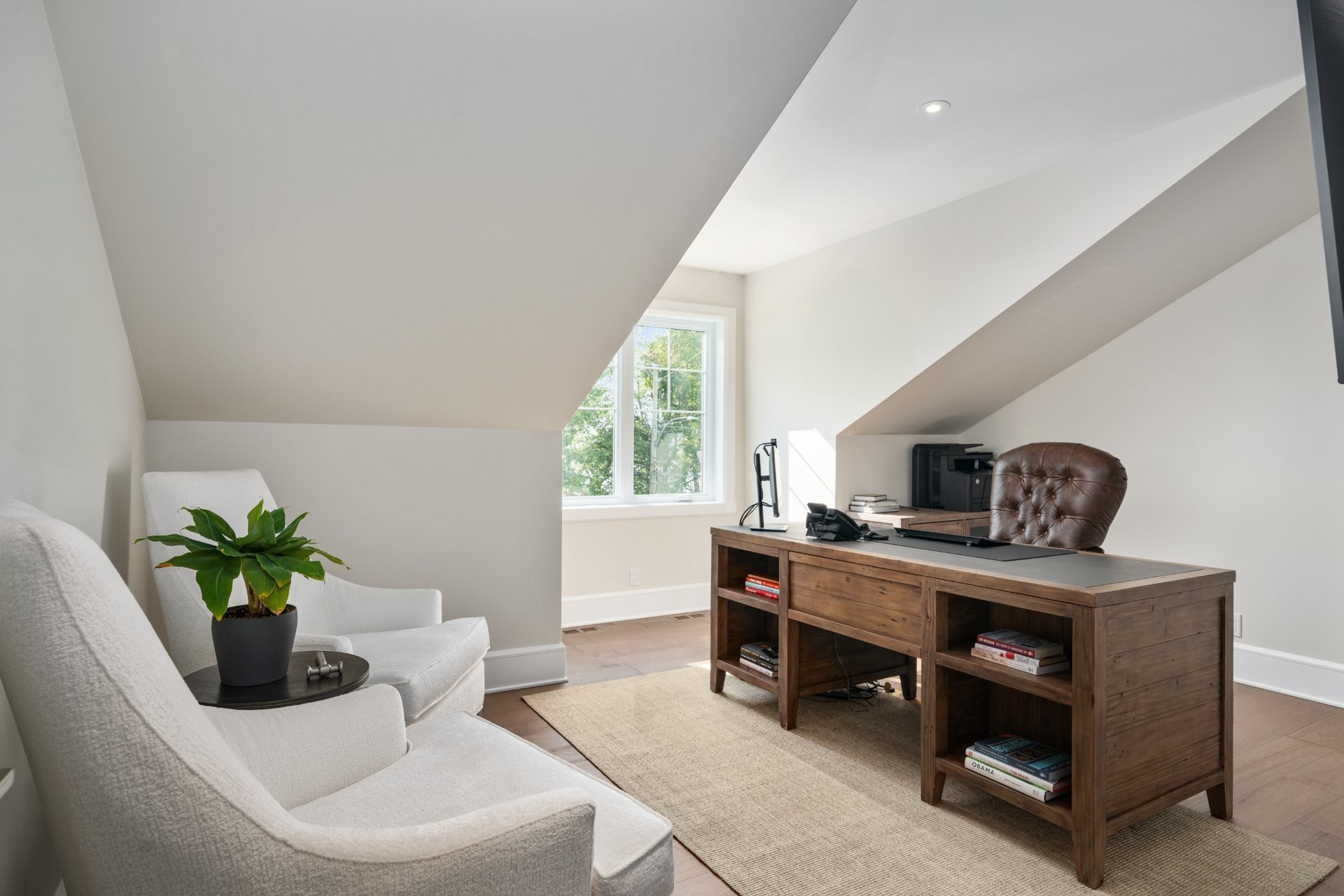 À l'étage, la suite principale comprend un walk-in, une salle de bain de style spa avec douche vitrée et baignoire, ainsi qu'un balcon privé offrant une vue imprenable sur l'eau. Deux autres chambres partagent une salle de bain commune (Jack-and-Jill) tandis qu'une quatrième dispose de sa propre salle de bain. Un bureau est également disponible pour le télétravail.