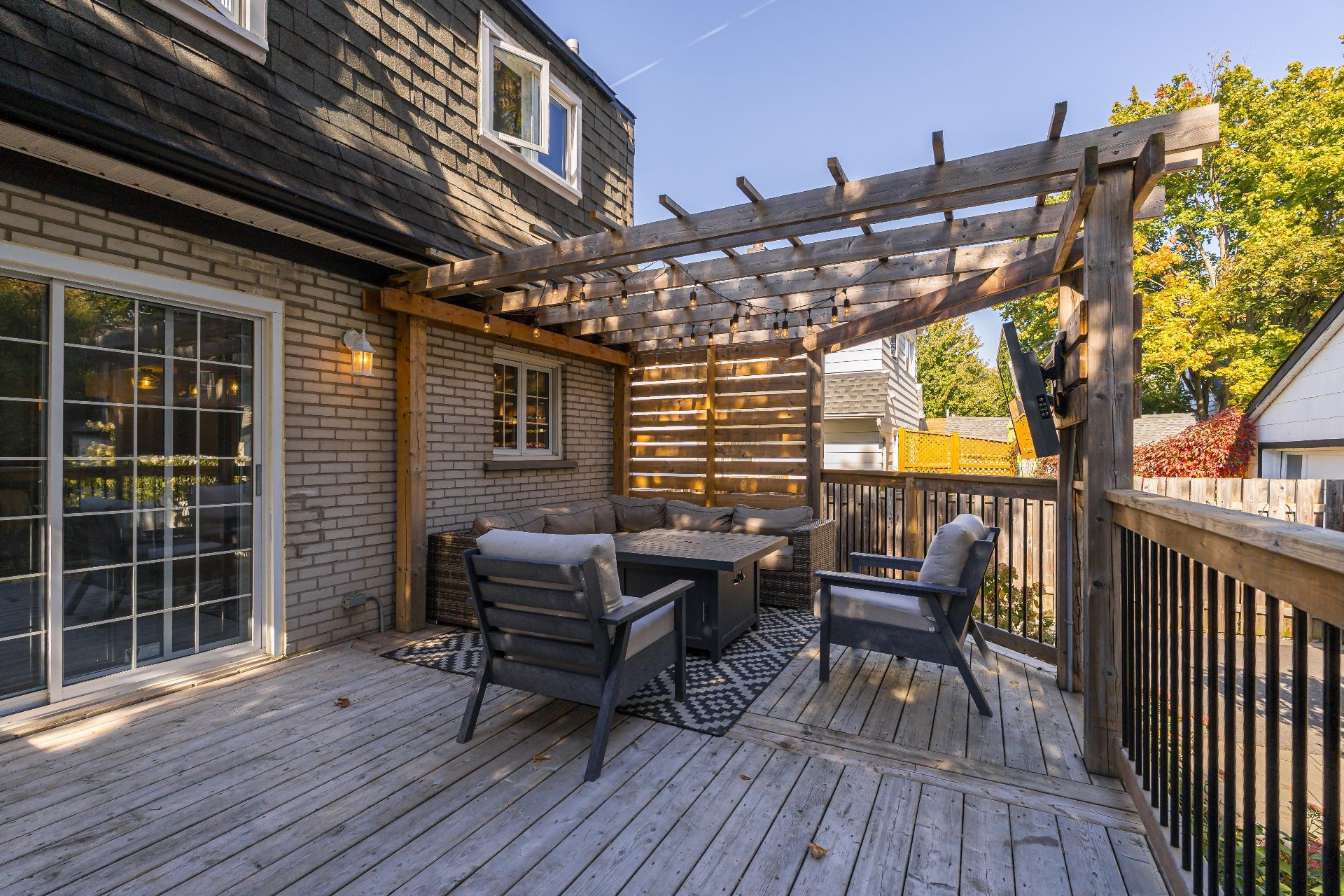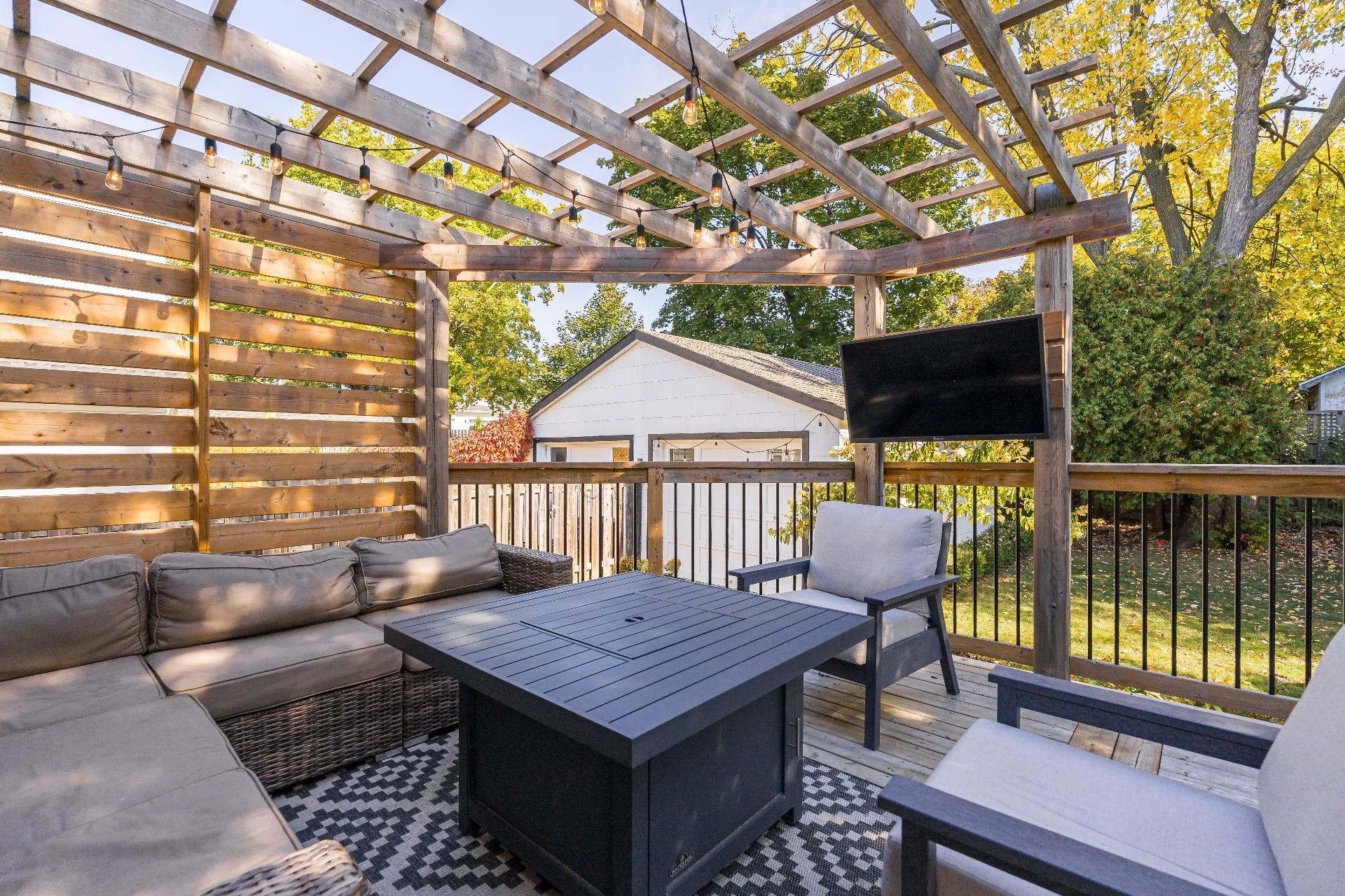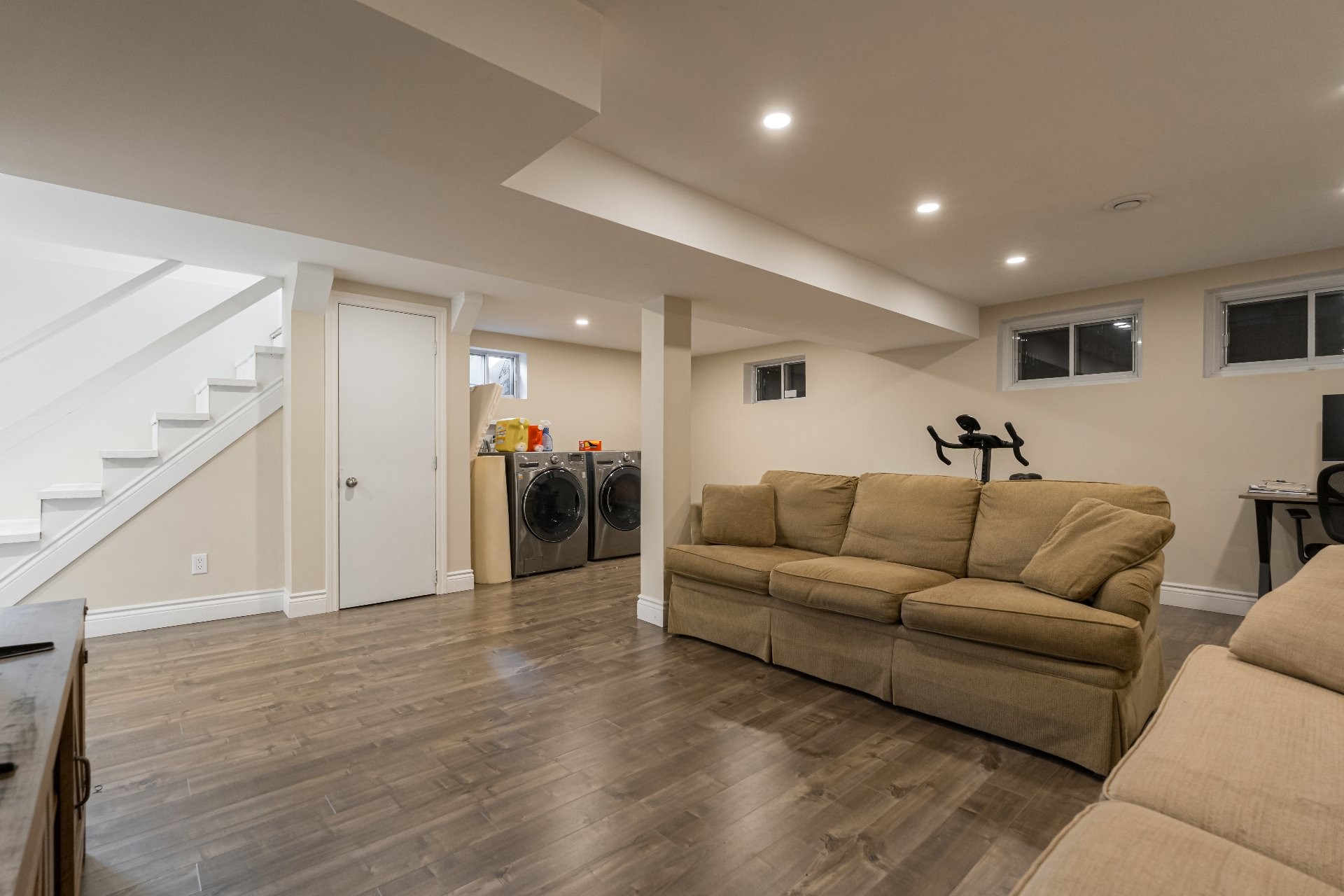 Laveuse, secheuse, televisions au salon et sur le patio