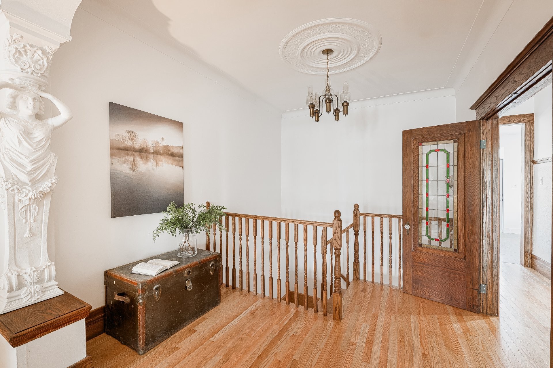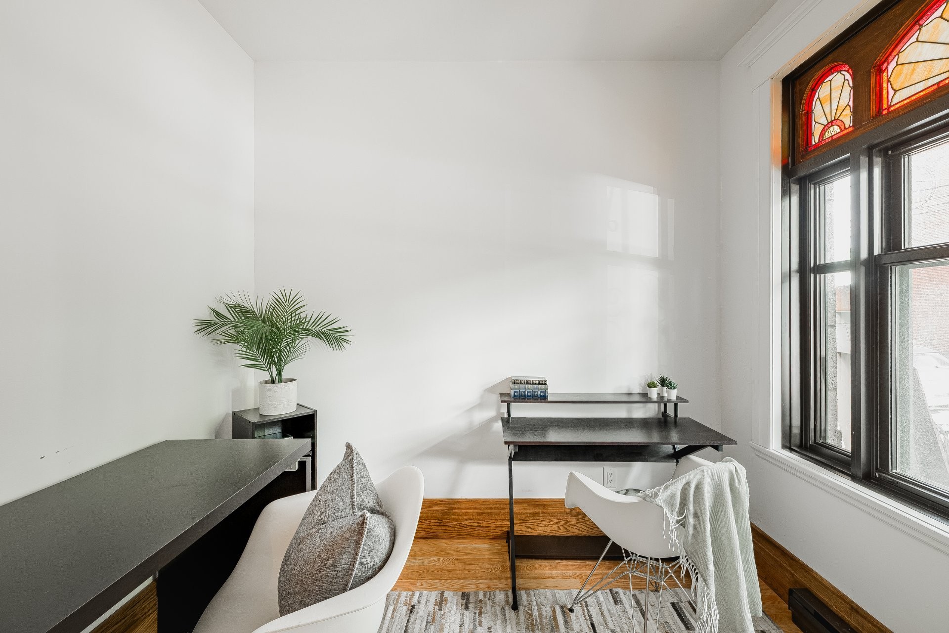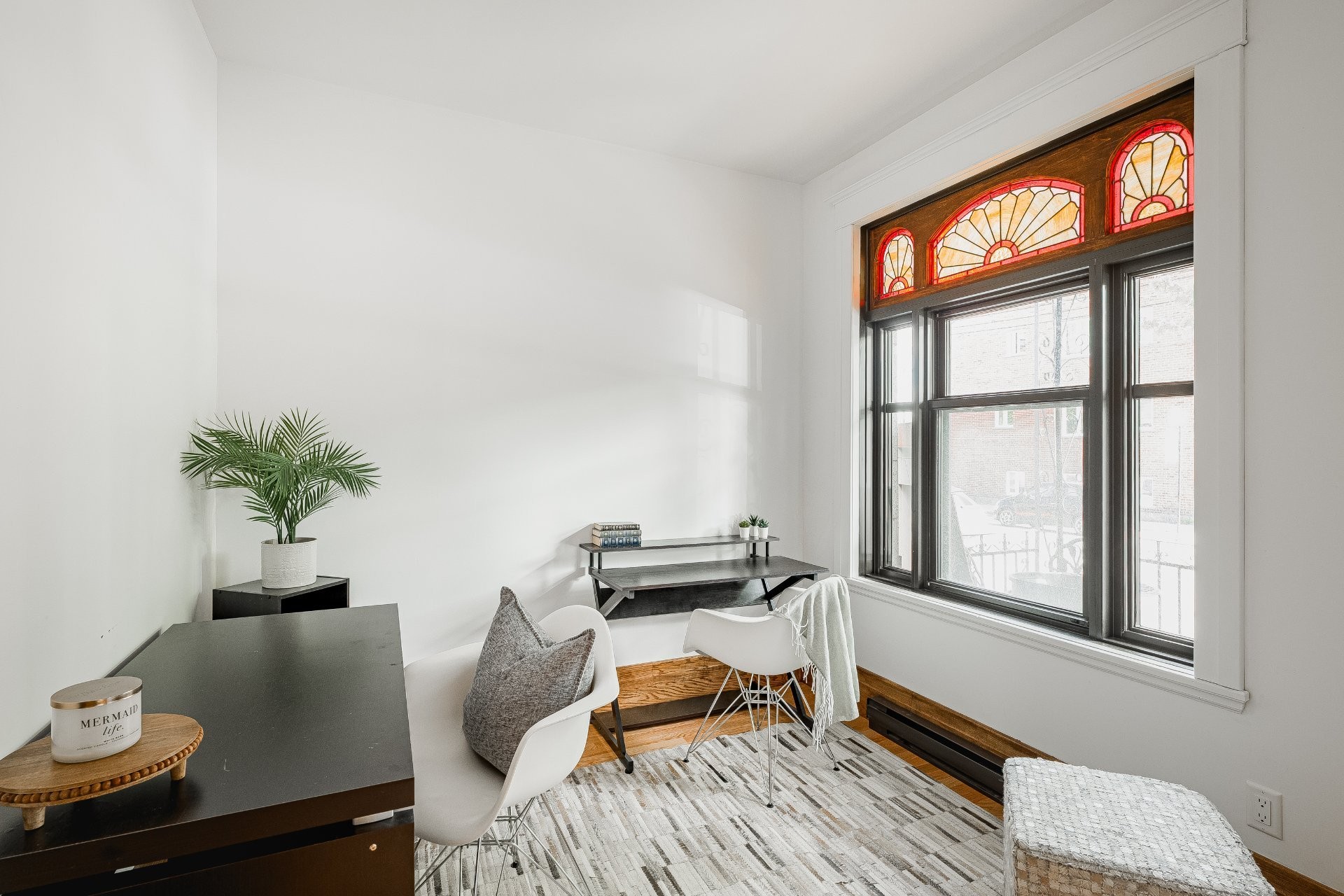 L'intérieur présente des plafonds hauts, des planchers de bois franc restaurés et de grandes fenêtres encadrées de garnitures d'époque et de vitraux, inondant l'espace de lumière naturelle. La restauration a soigneusement préservé le caractère du bâtiment tout en intégrant les fonctionnalités modernes.