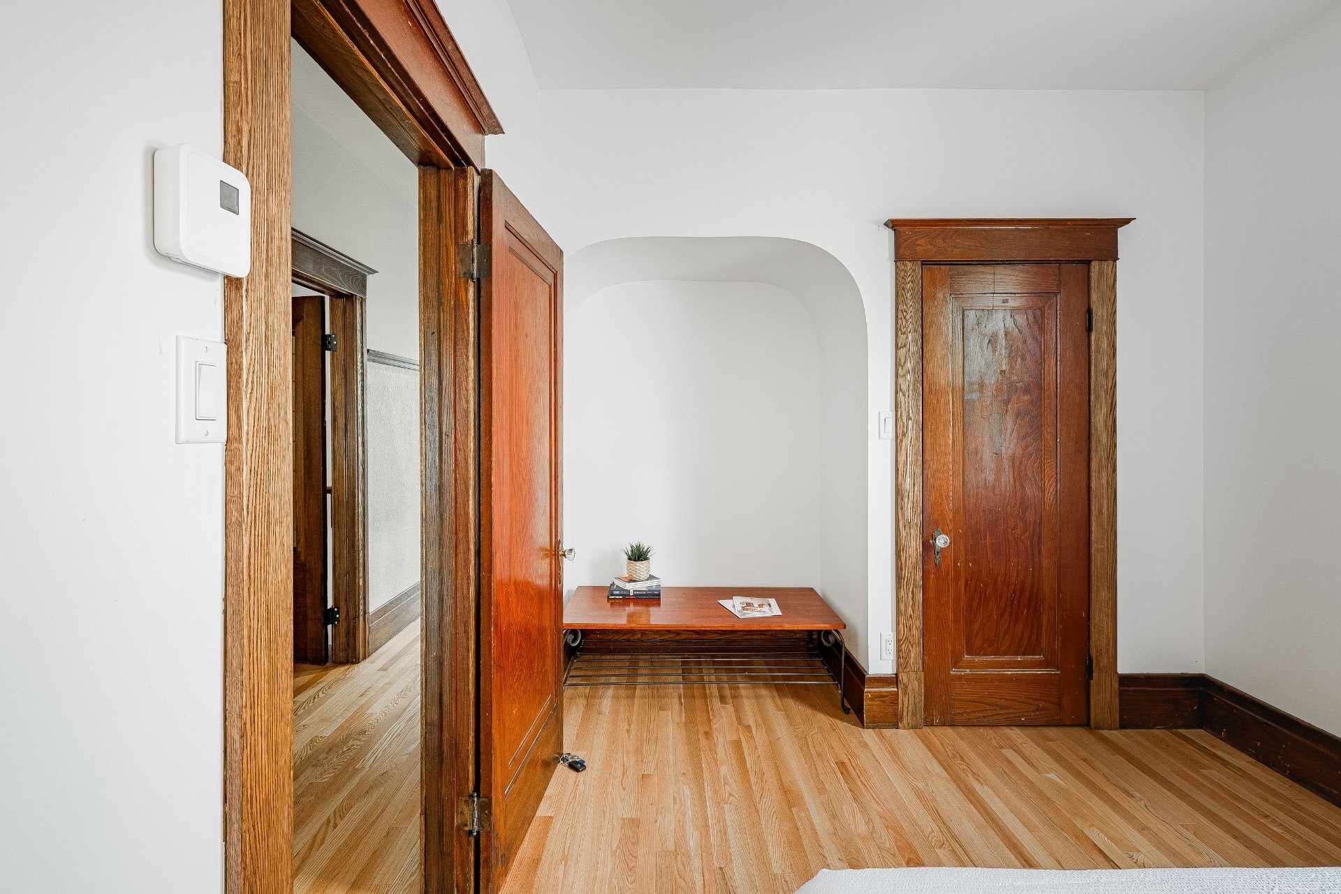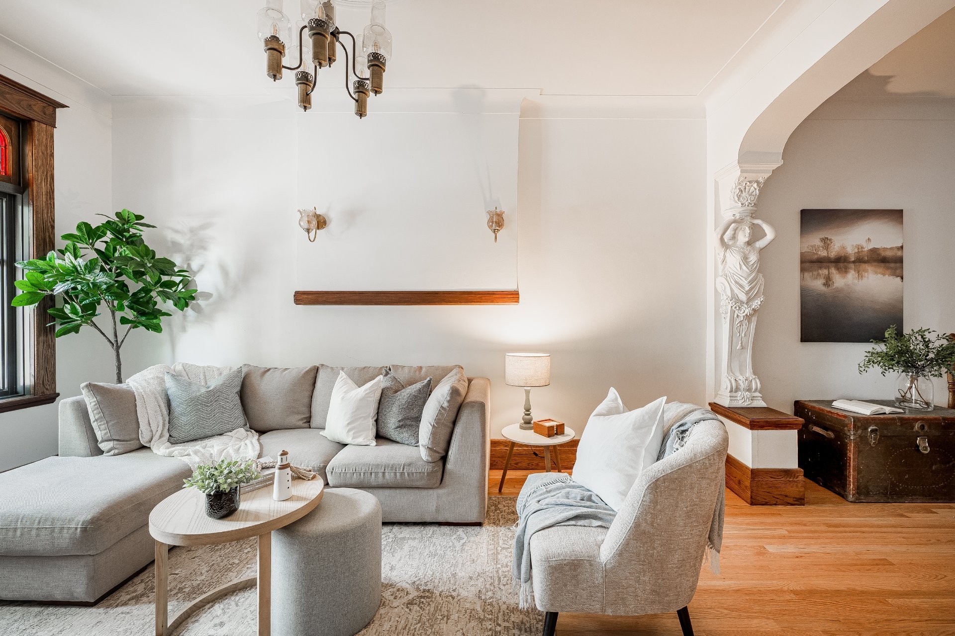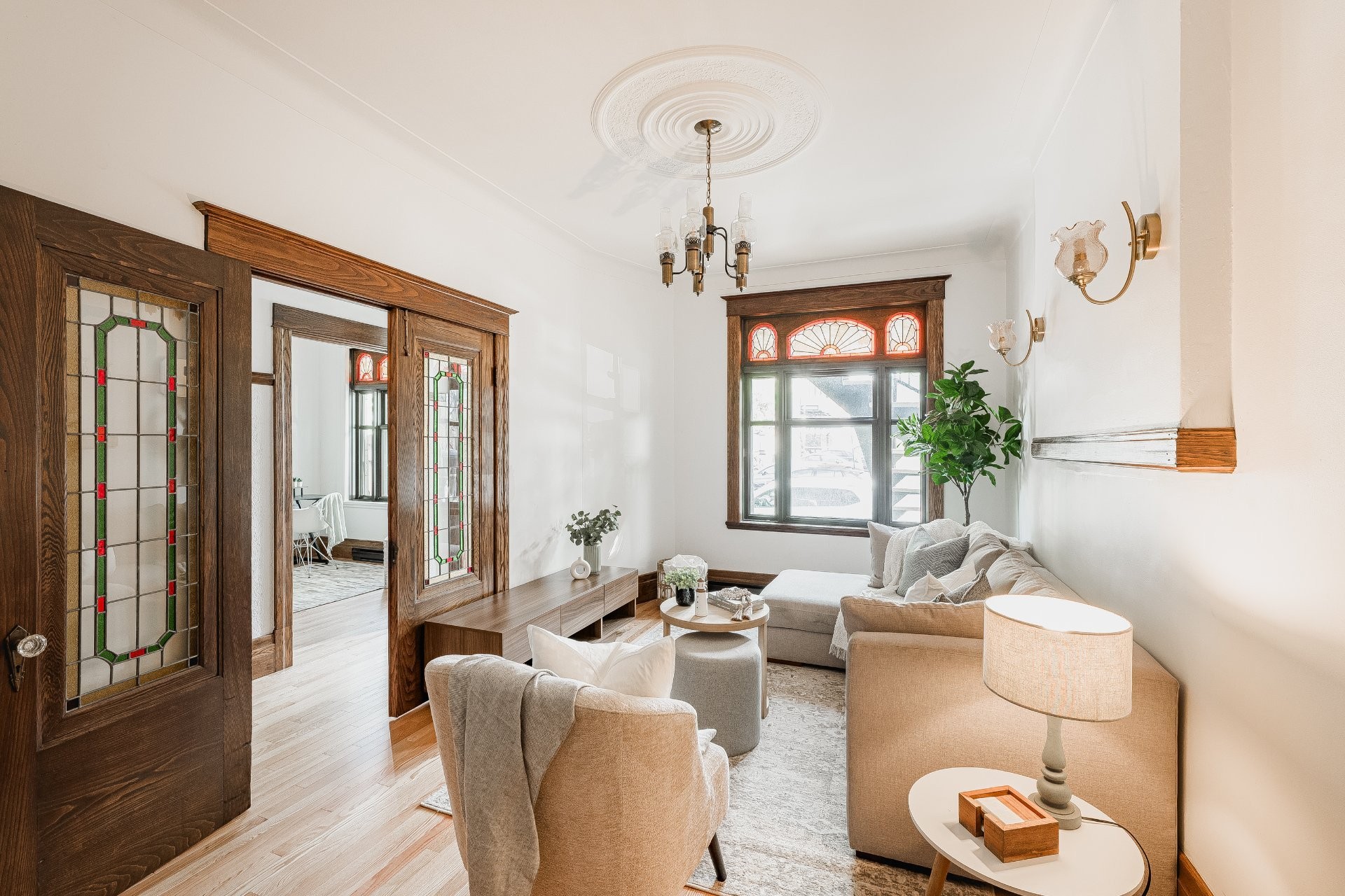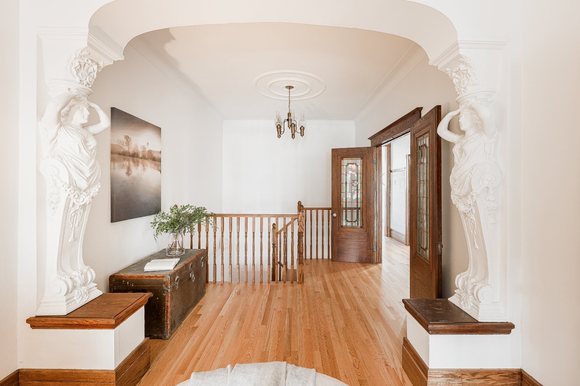 L'intérieur présente des plafonds hauts, des planchers de bois franc restaurés et de grandes fenêtres encadrées de garnitures d'époque et de vitraux, inondant l'espace de lumière naturelle. La restauration a soigneusement préservé le caractère du bâtiment tout en intégrant les fonctionnalités modernes.