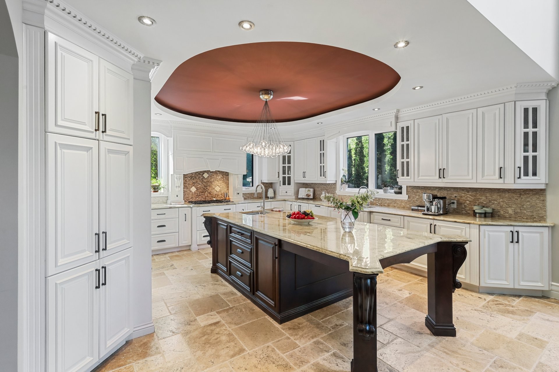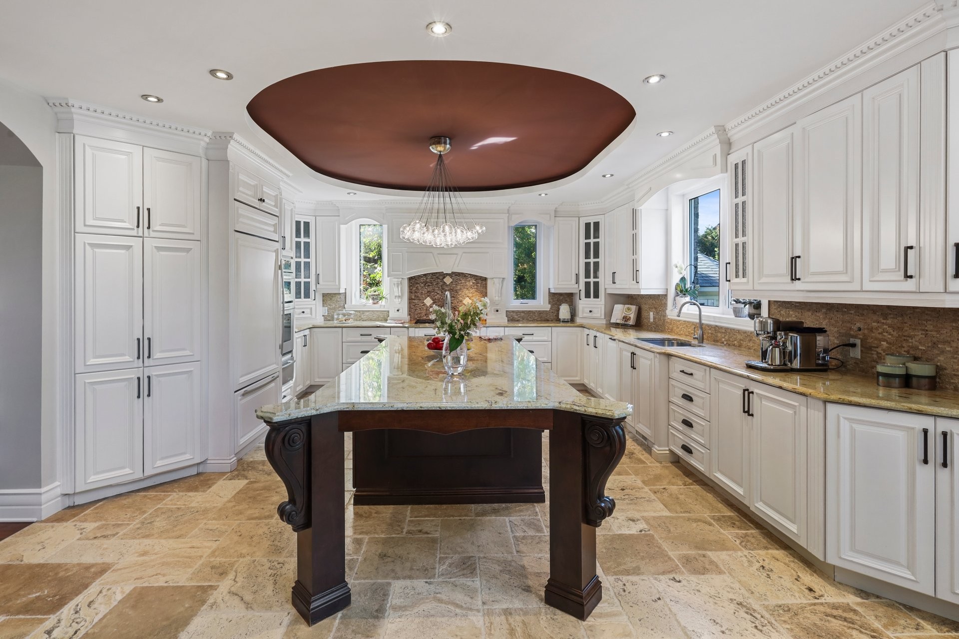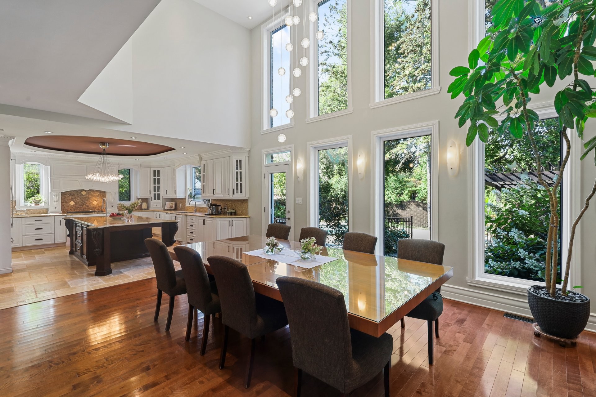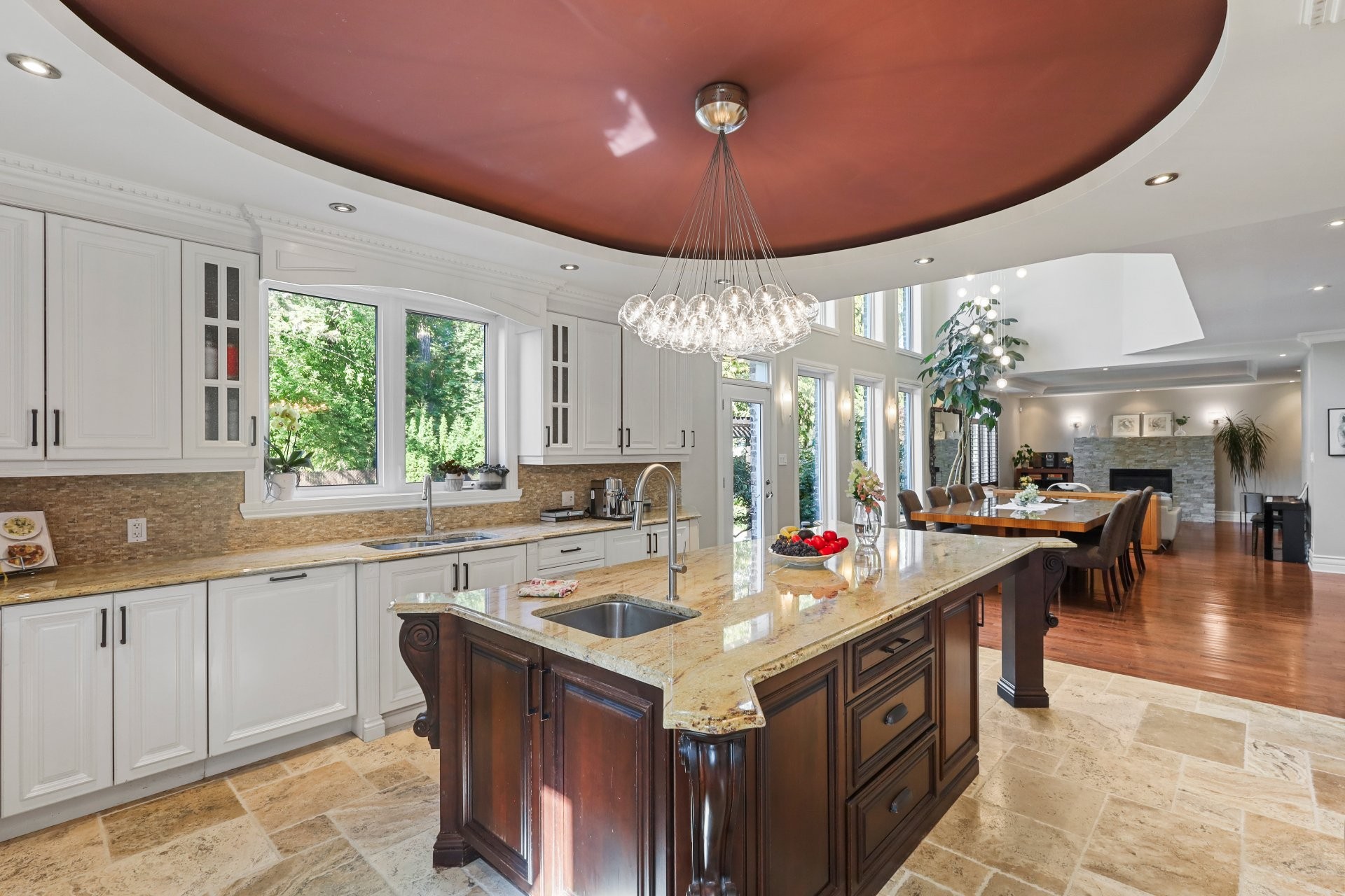 La cuisine moderne tout équipée, dotée de comptoirs en granite et d'un grand îlot central, ouvre sur la salle à manger et ses plafonds hauts de 18 pieds. Les grandes fenêtres surplombent la cour, ses terrasses et sa piscine creusée.