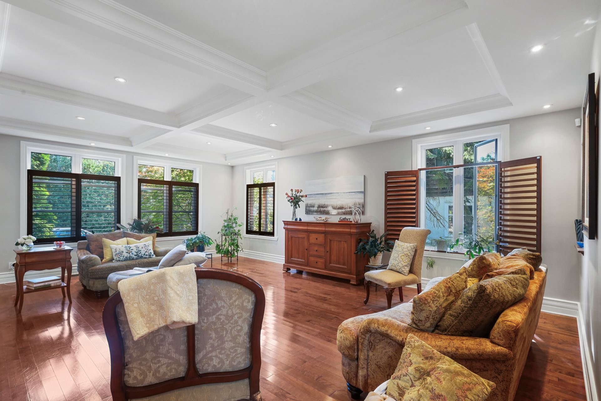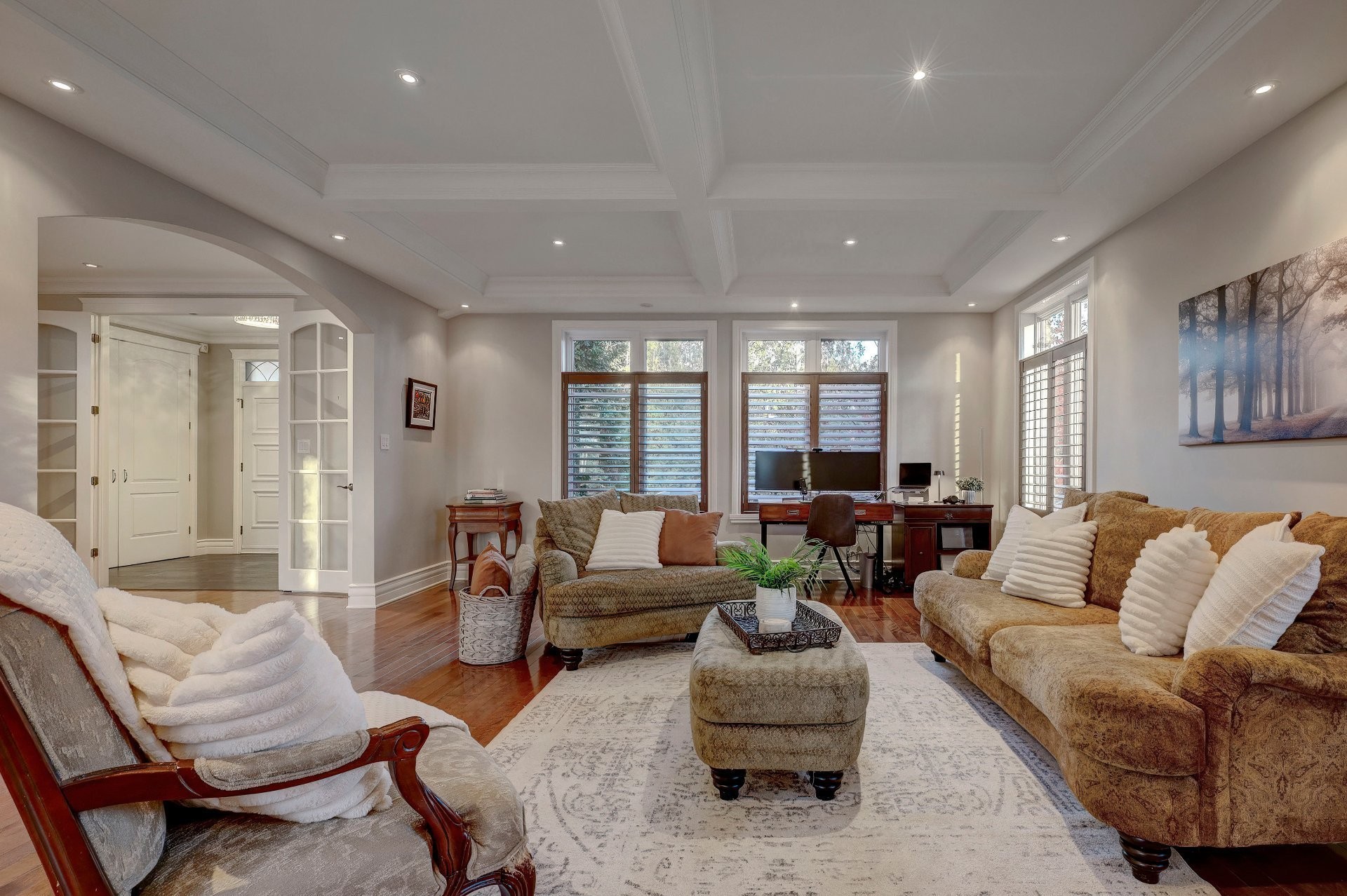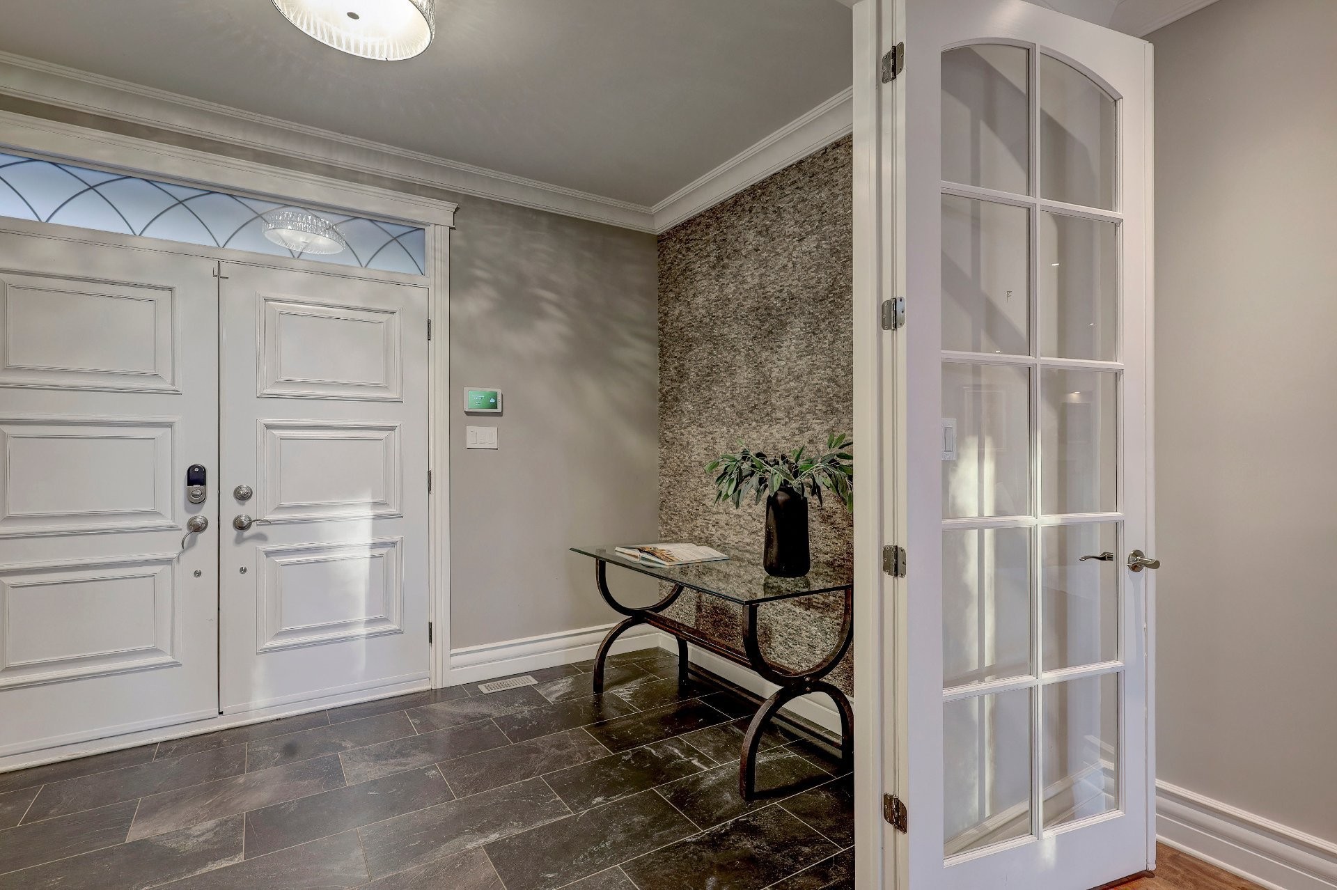 L'entrée principale mène à un vestibule formel (11.9 x 7.7) avec une grande penderie et des portes à deux vantaux ouvrant sur le hall d'entrée et ses planchers en bois franc. La salle de séjour formelle est dotée d'un plafond à caissons et de puits de lumière.