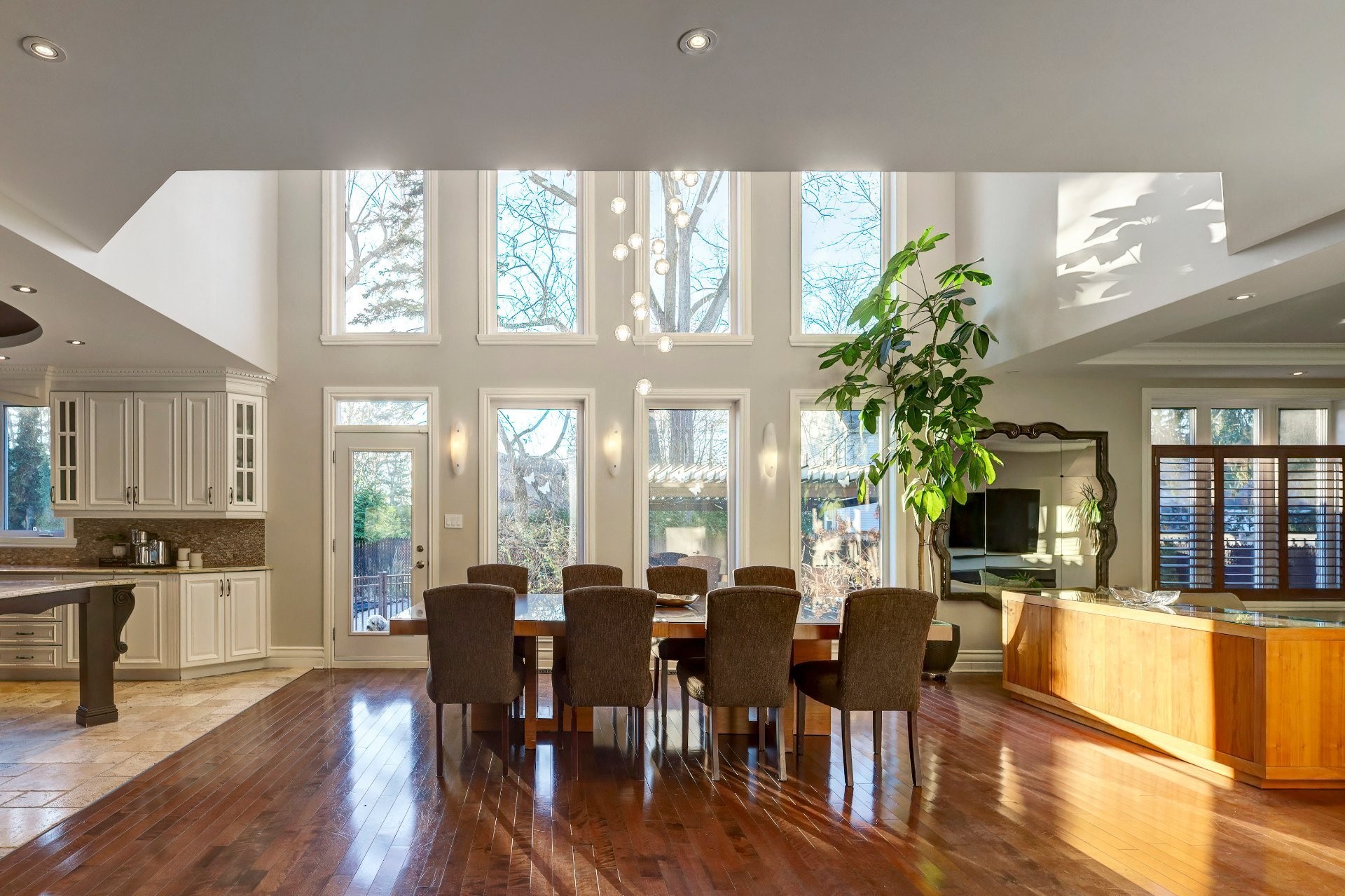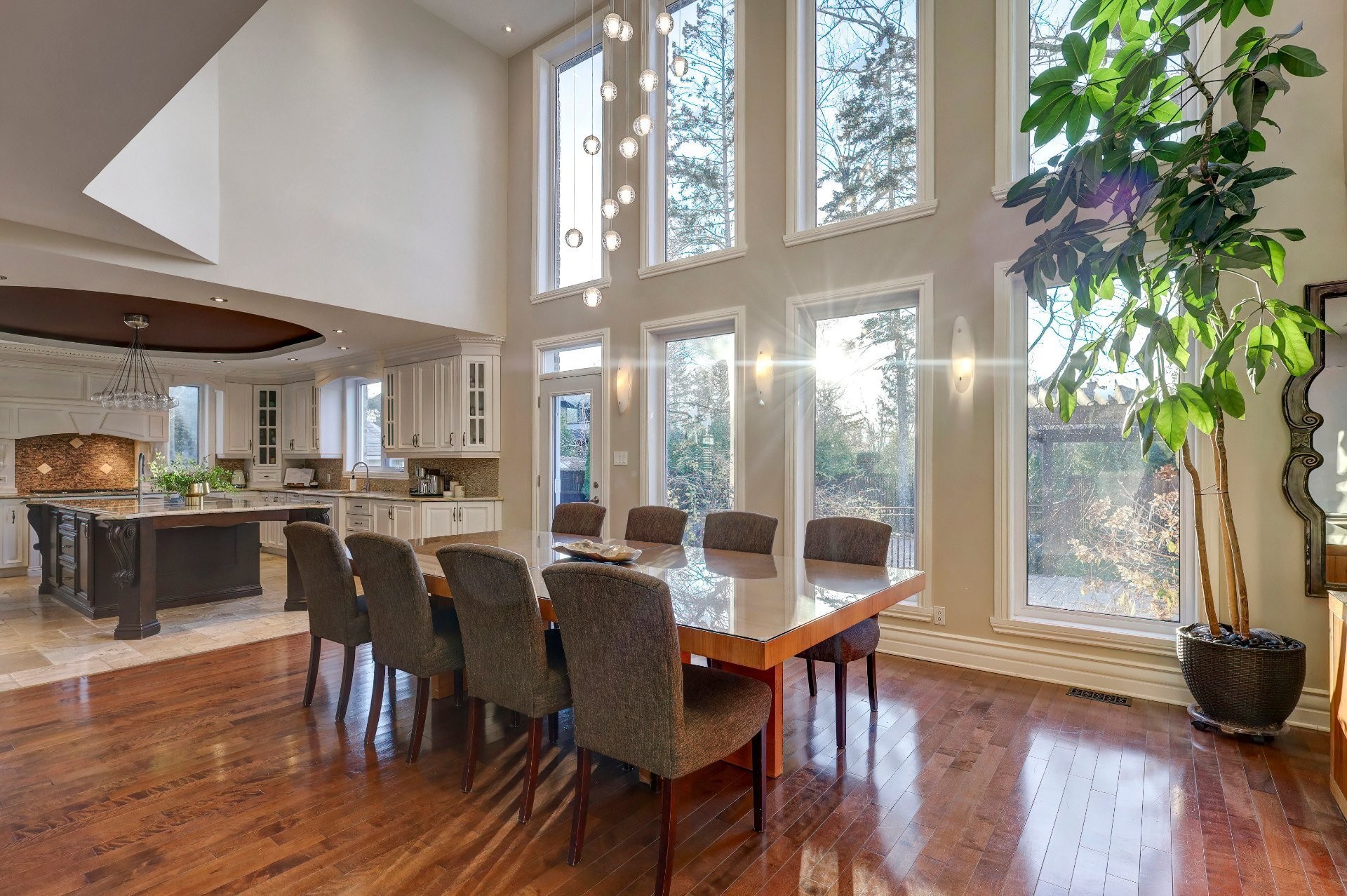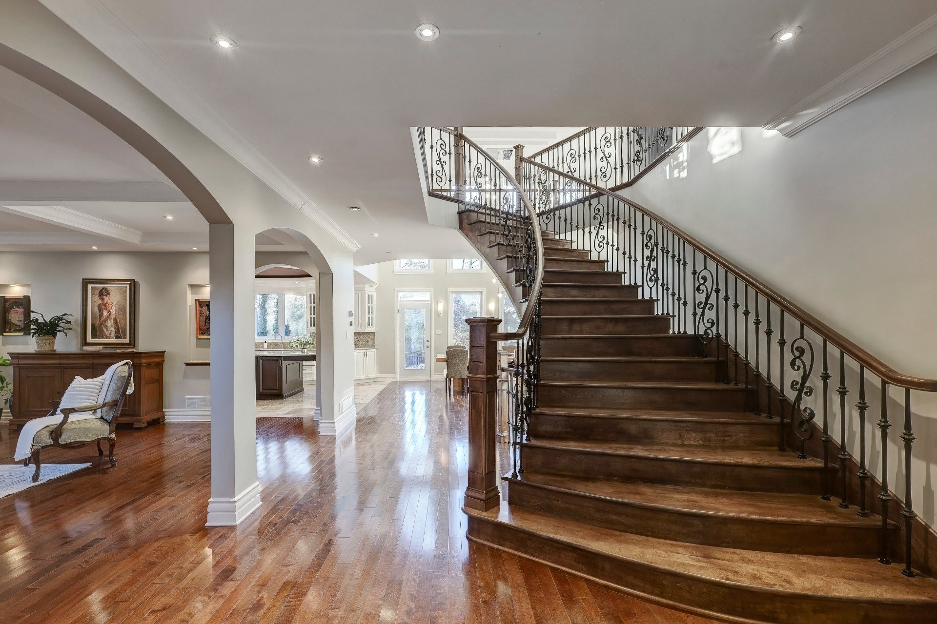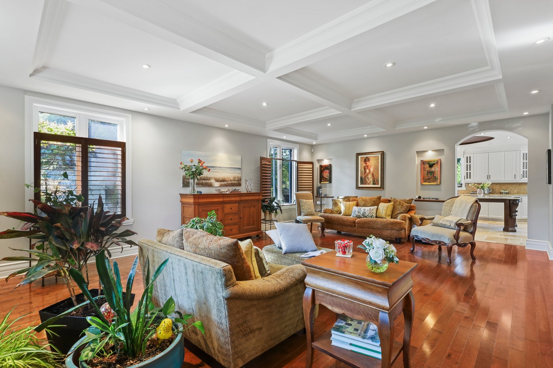 L'entrée principale mène à un vestibule formel (11.9 x 7.7) avec une grande penderie et des portes à deux vantaux ouvrant sur le hall d'entrée et ses planchers en bois franc. La salle de séjour formelle est dotée d'un plafond à caissons et de puits de lumière.