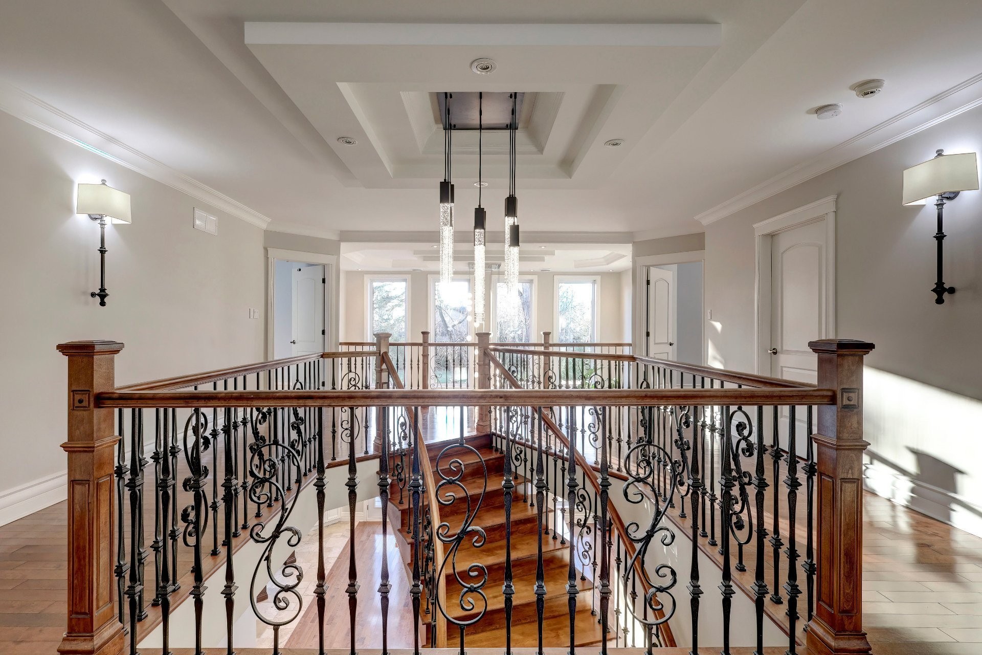 L'escalier en bois franc mène à l'étage supérieur qui compte quatre chambres, dont deux suites principales, trois salles de bain complètes et une des deux salles de lavage.