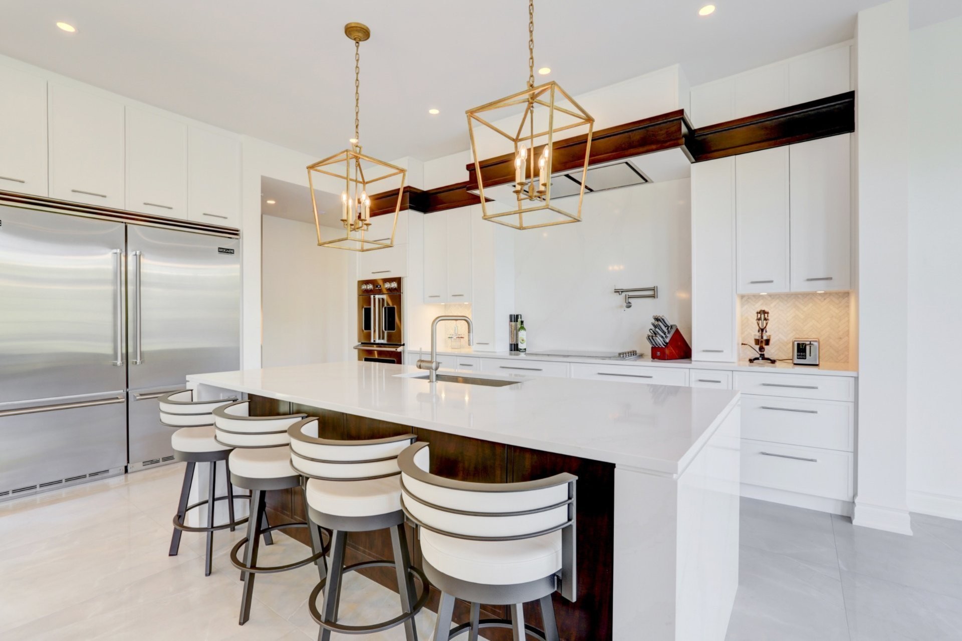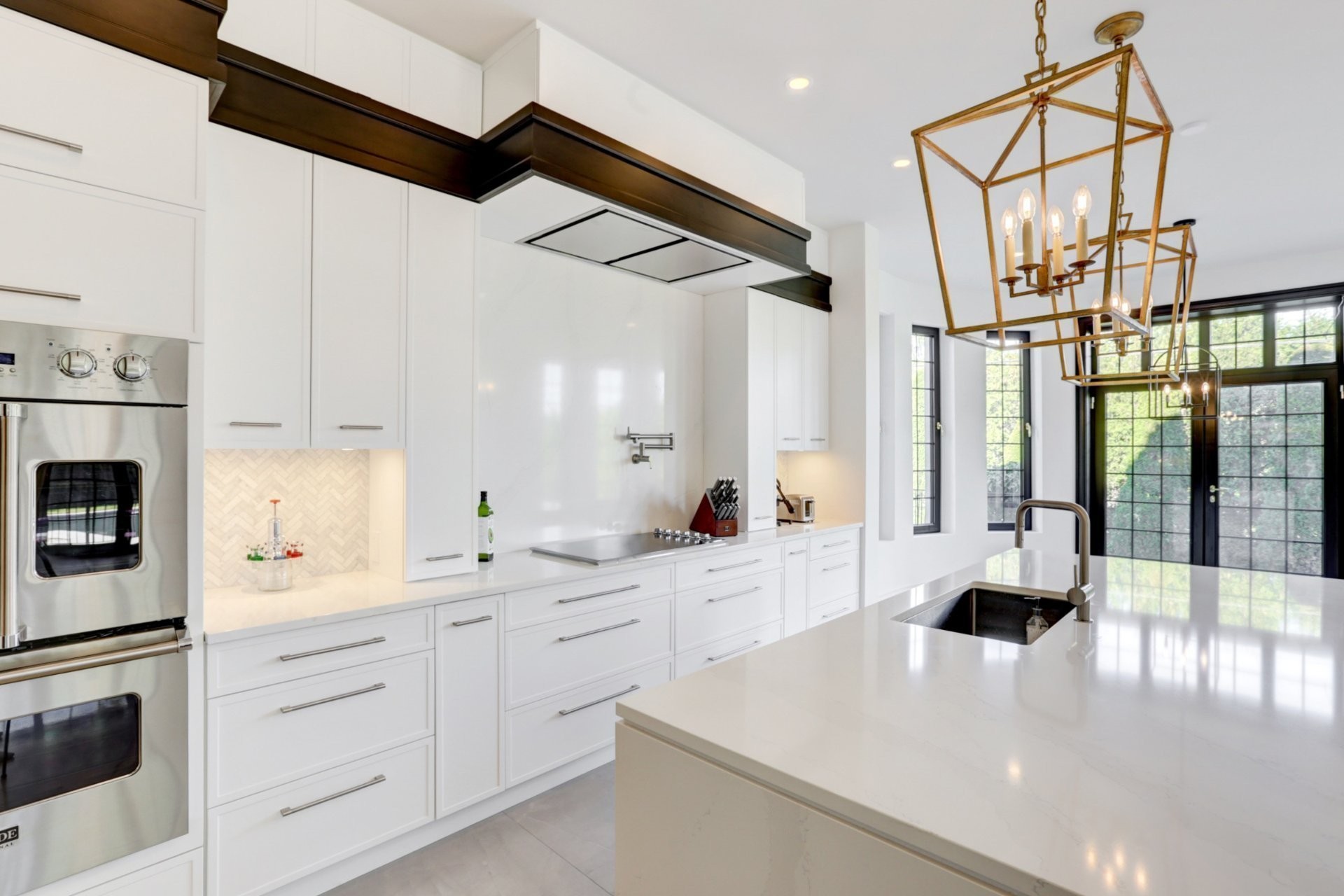 La cuisine gastronomique entièrement équipée est le rêve de tout chef, avec son garde-manger walk-in, sa station café, son grand îlot central avec comptoirs en quartz, sa hotte sur mesure et son spectaculaire dosseret en quartz de 4' x 6'.