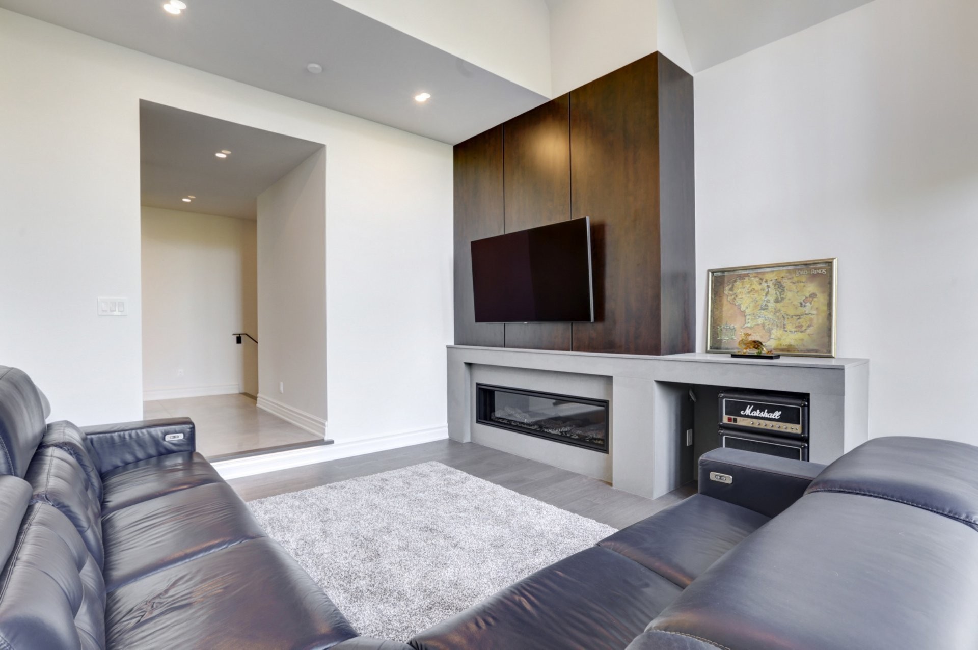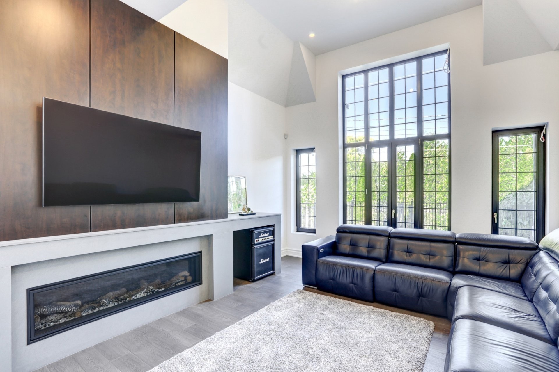 Le rez-de-chaussée se poursuit avec un chaleureux salon familial aux planchers de bois franc, un deuxième foyer au gaz et des plafonds de 13 pieds.