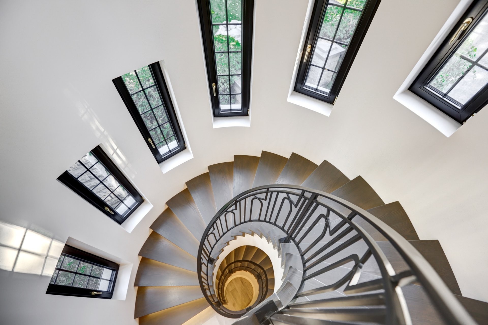 Un élégant escalier à éclairage indirect mène aux étages supérieurs et inférieurs.