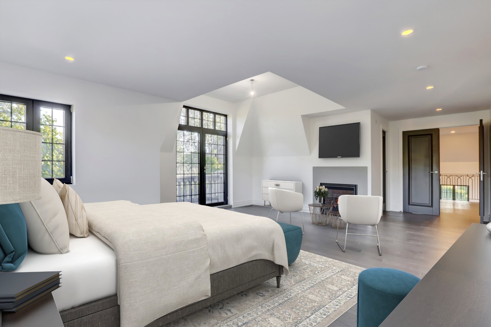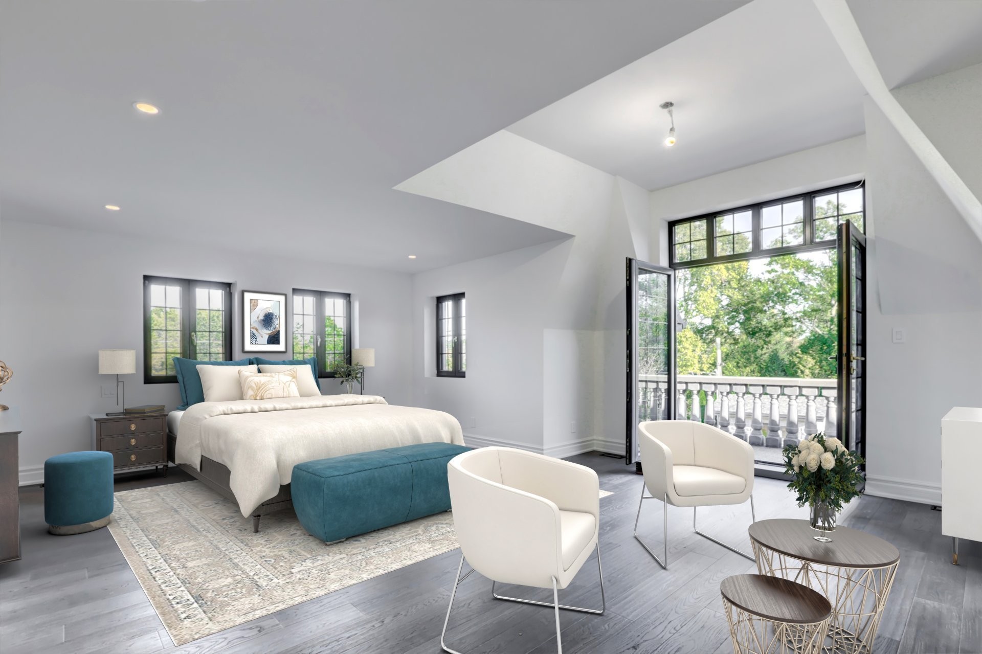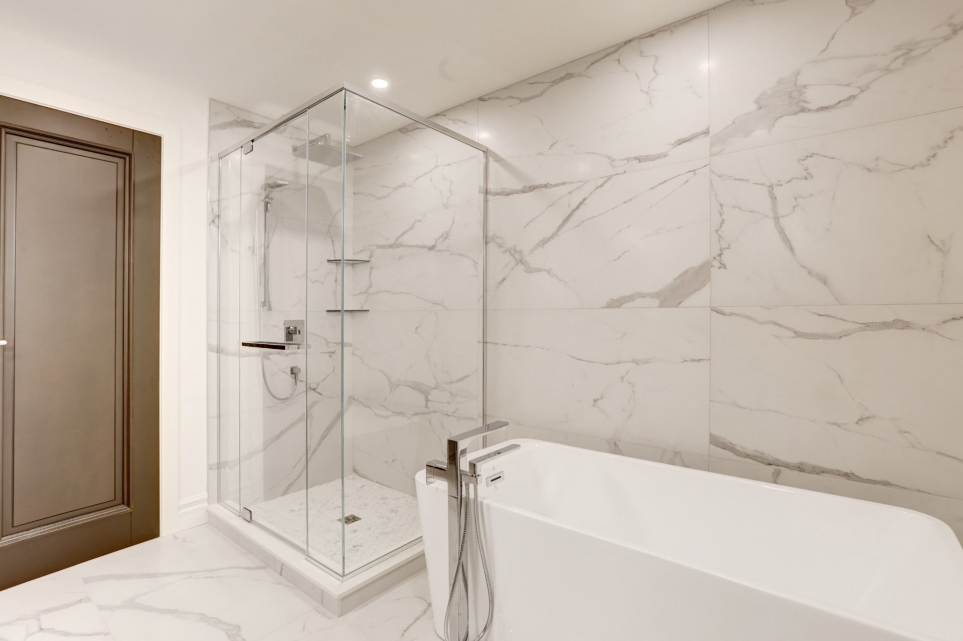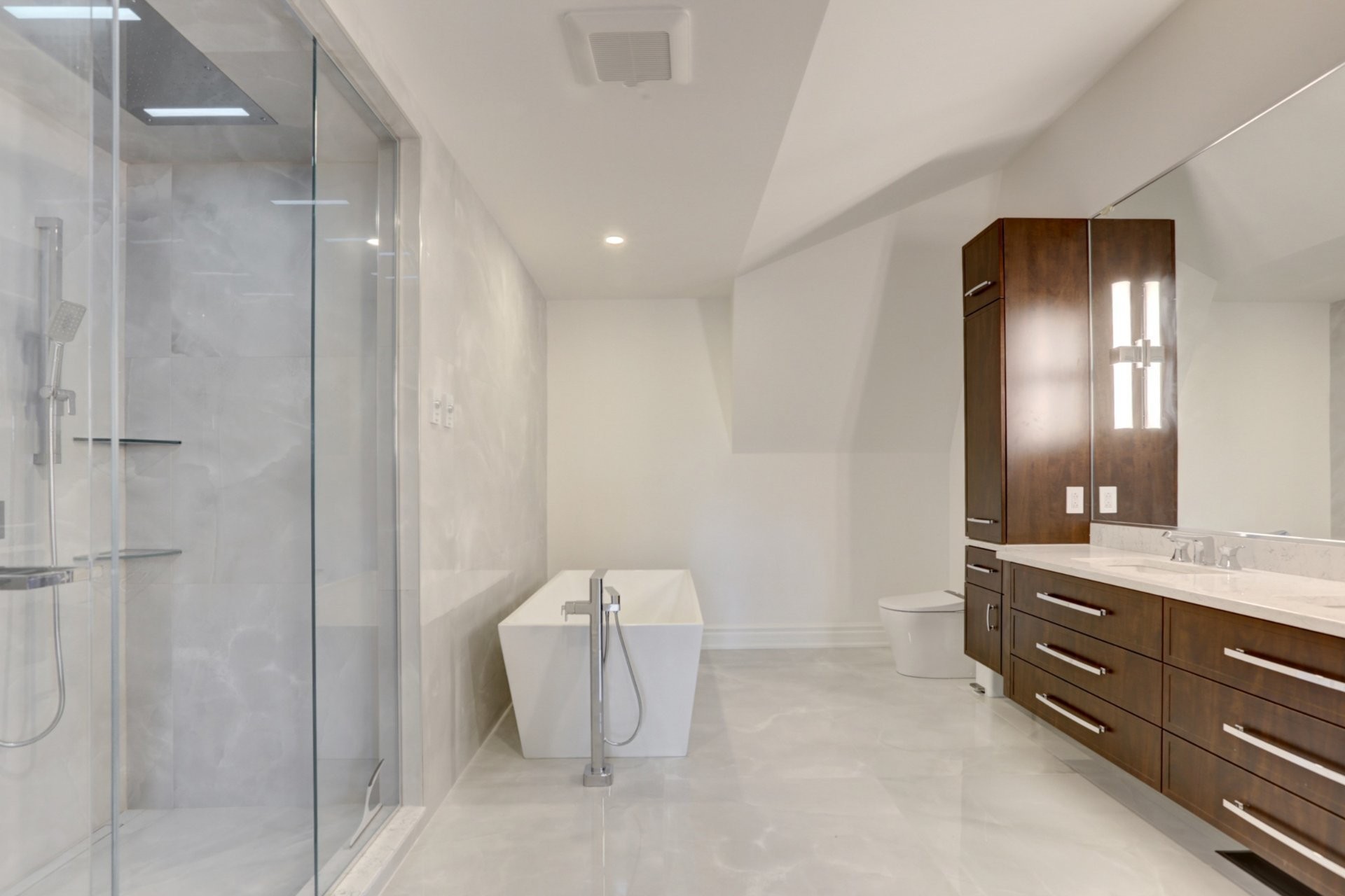 La suite principale est un véritable havre de paix, avec foyer, balcon extérieur privé et deux garde-robes walk-in, dont une immense de 13,8 x 8,9 pi avec armoires sur mesure. La salle de bain attenante luxueuse comprend une double douche effet pluie, une baignoire profonde et une toilette intelligente autonettoyante.