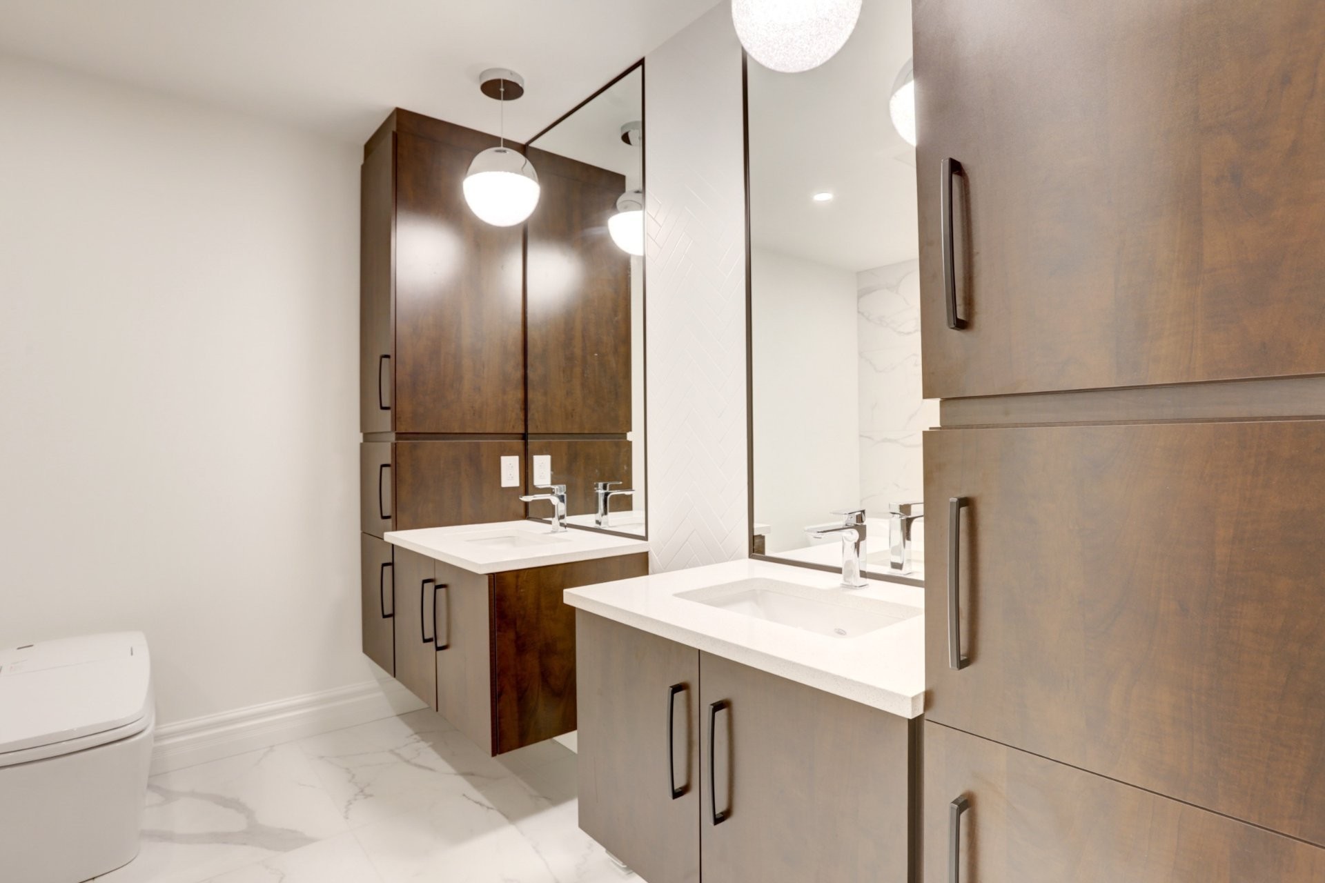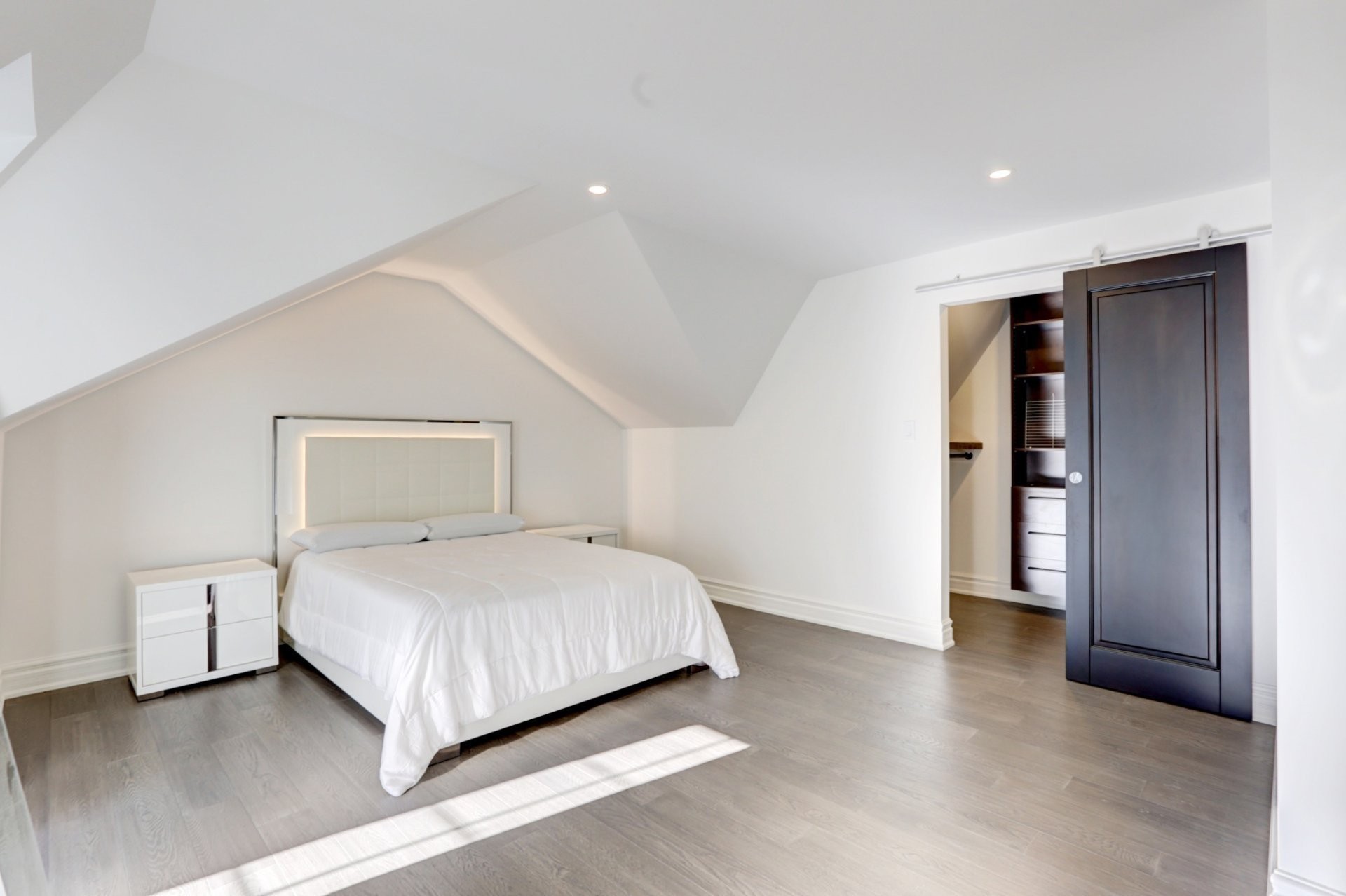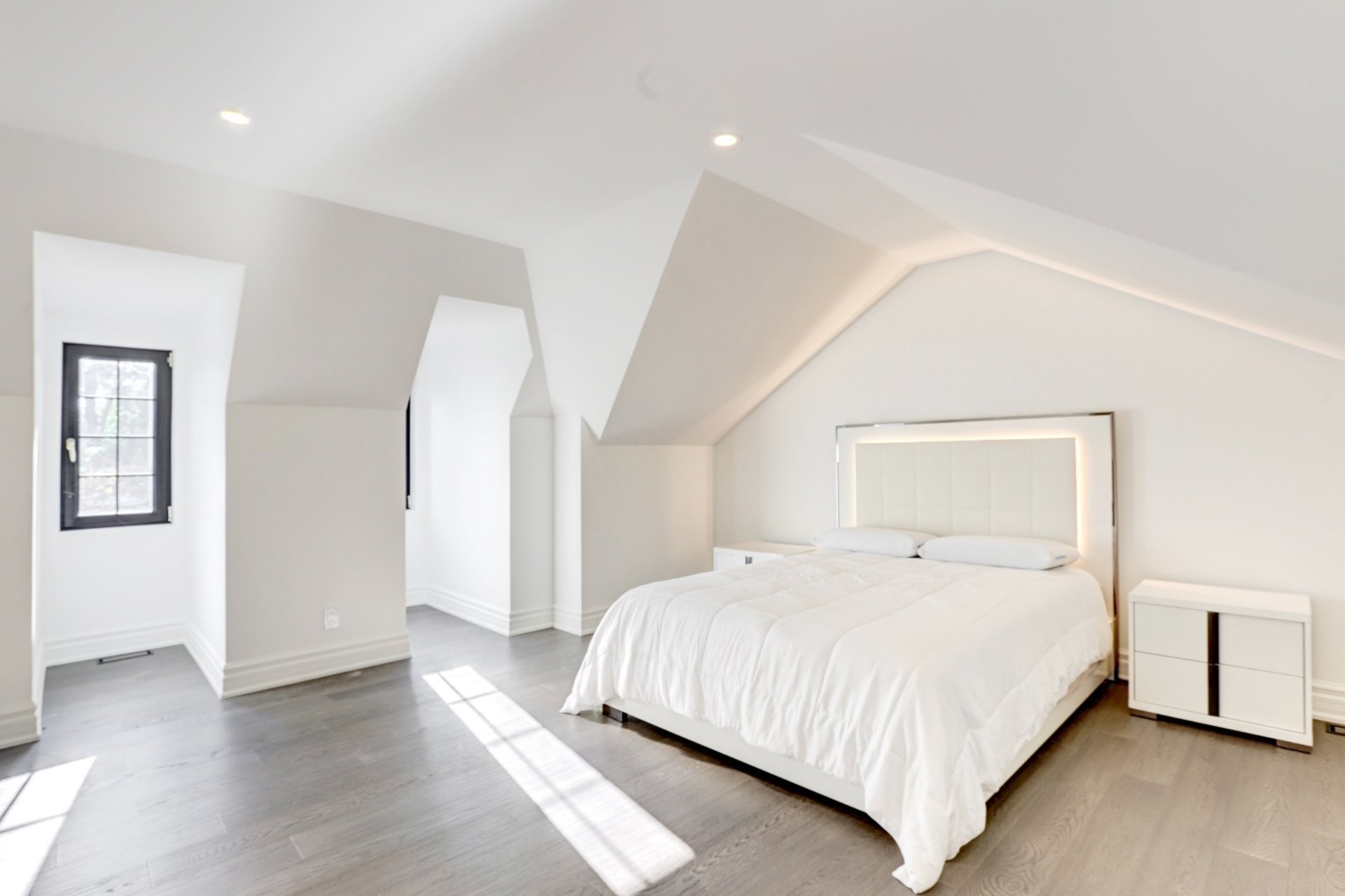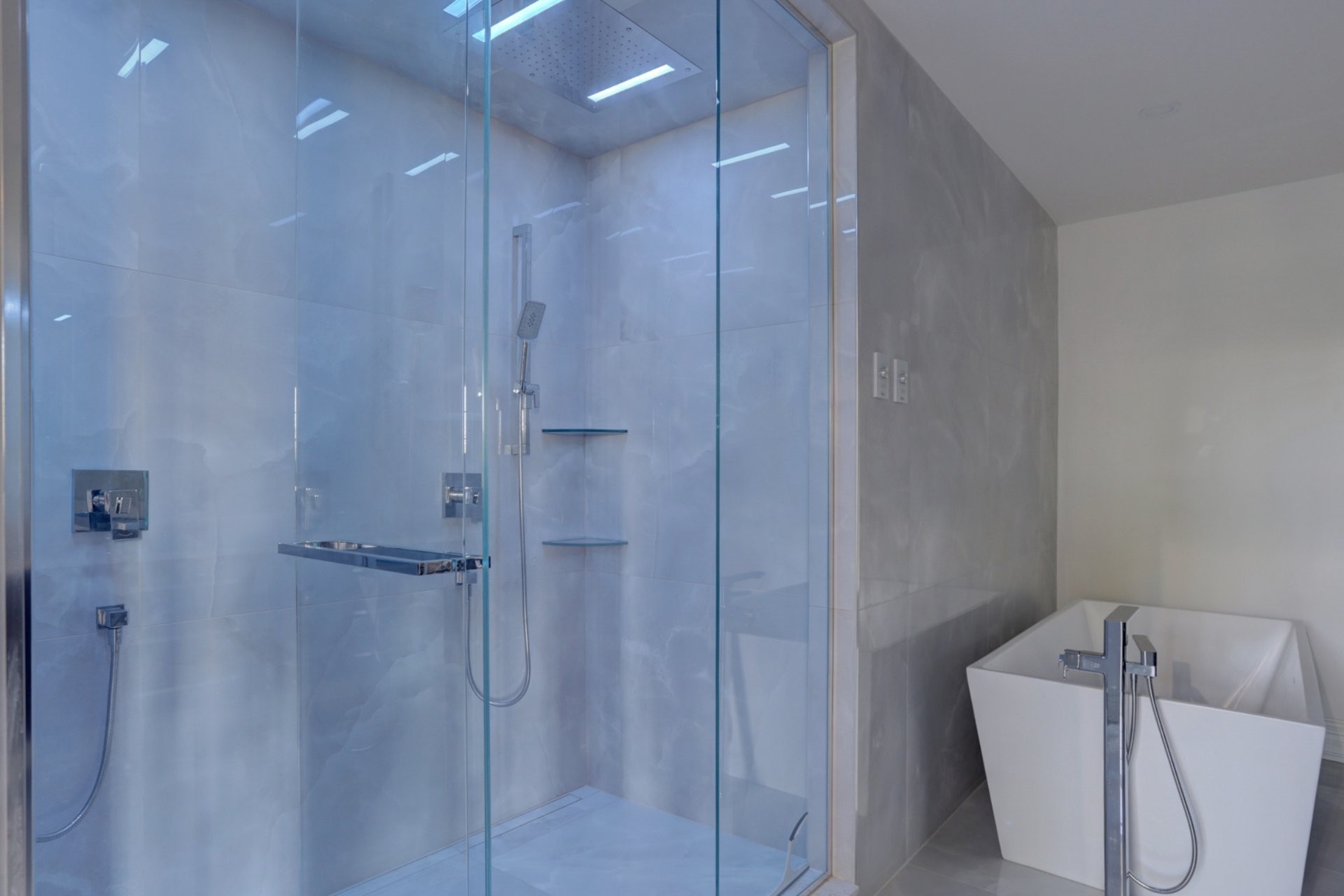 La suite principale est un véritable havre de paix, avec foyer, balcon extérieur privé et deux garde-robes walk-in, dont une immense de 13,8 x 8,9 pi avec armoires sur mesure. La salle de bain attenante luxueuse comprend une double douche effet pluie, une baignoire profonde et une toilette intelligente autonettoyante.