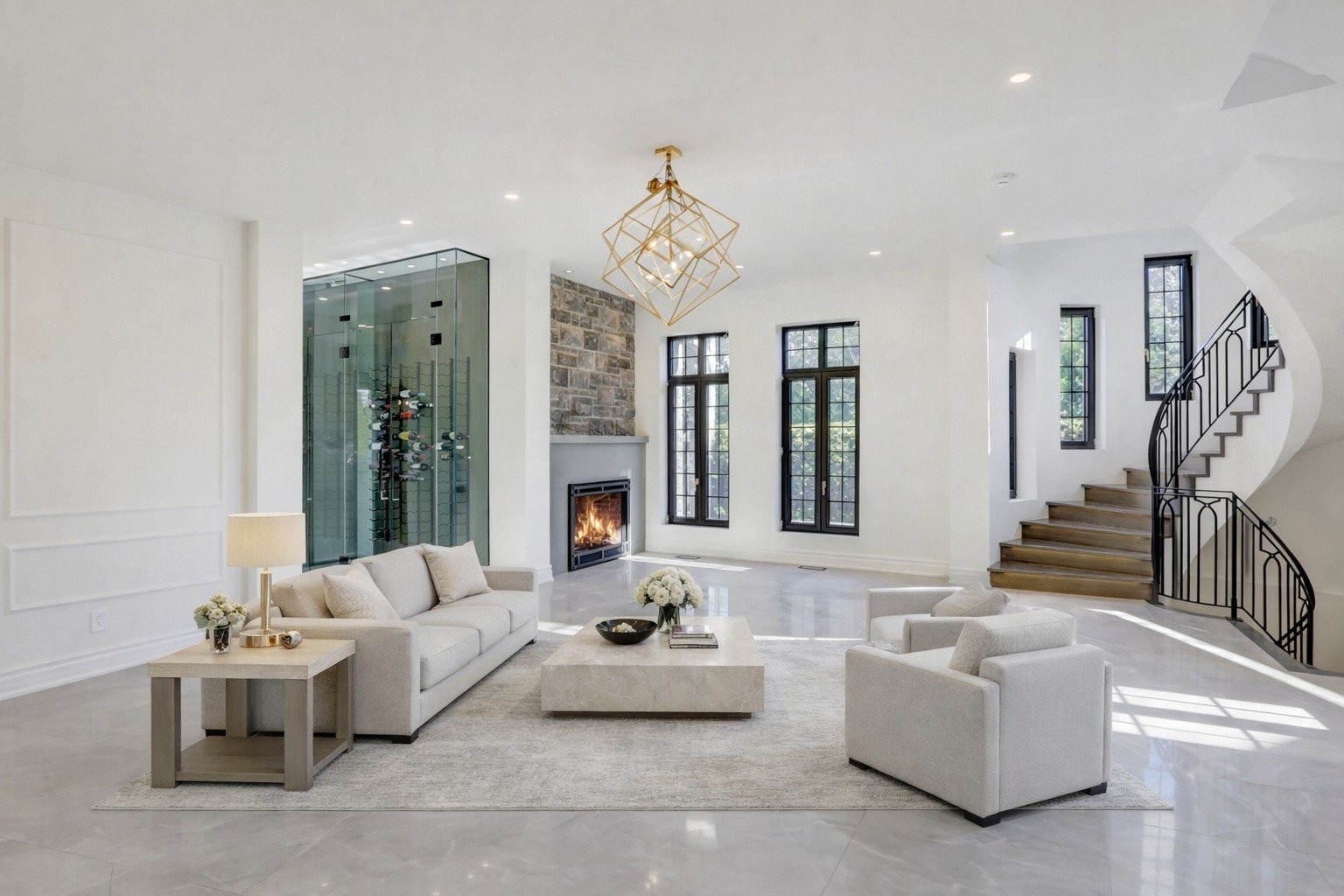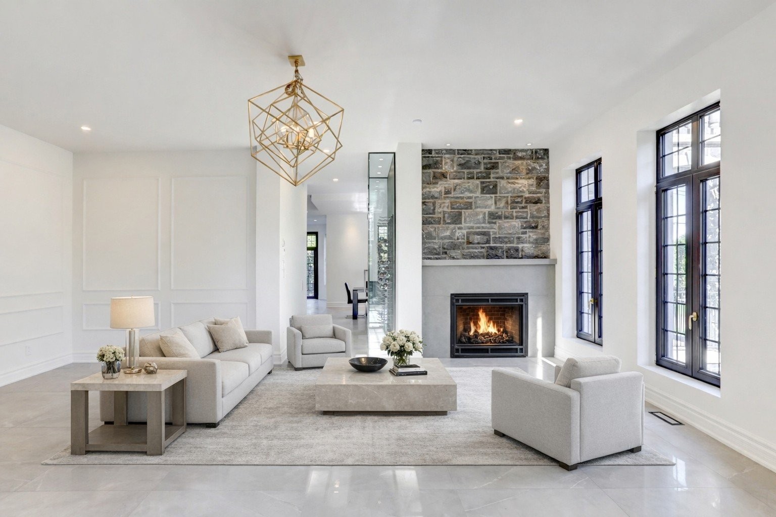 Entrez par les impressionnantes portes d'entrée doubles de neuf pieds dans un vestibule formel, menant à un vaste salon aux plafonds majestueux, doté d'un foyer au gaz et d'un manteau en calcaire.