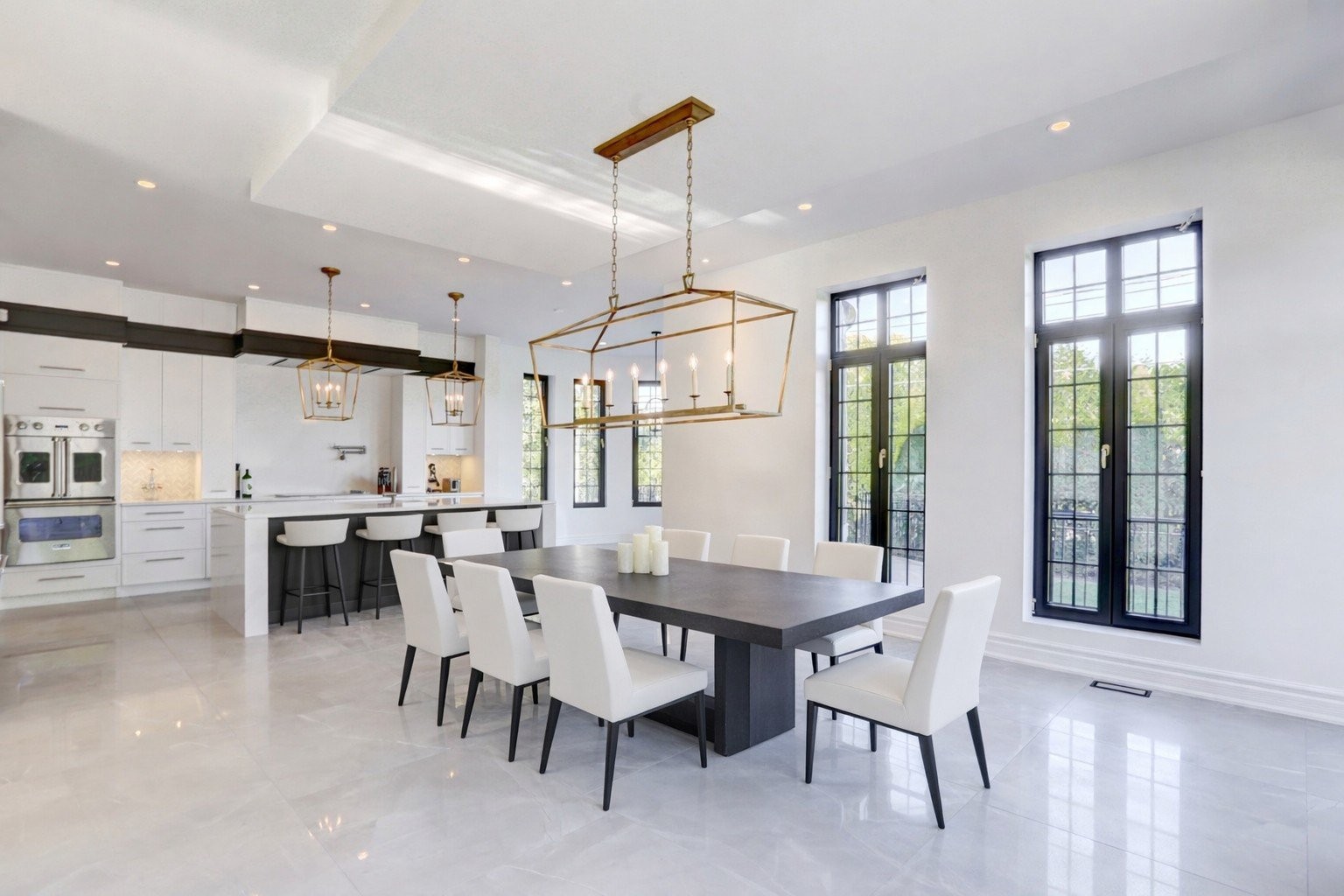 La cuisine donne harmonieusement sur la salle à manger formelle et le coin-repas, chacun muni de portes doubles ouvrant sur des balcons privés.