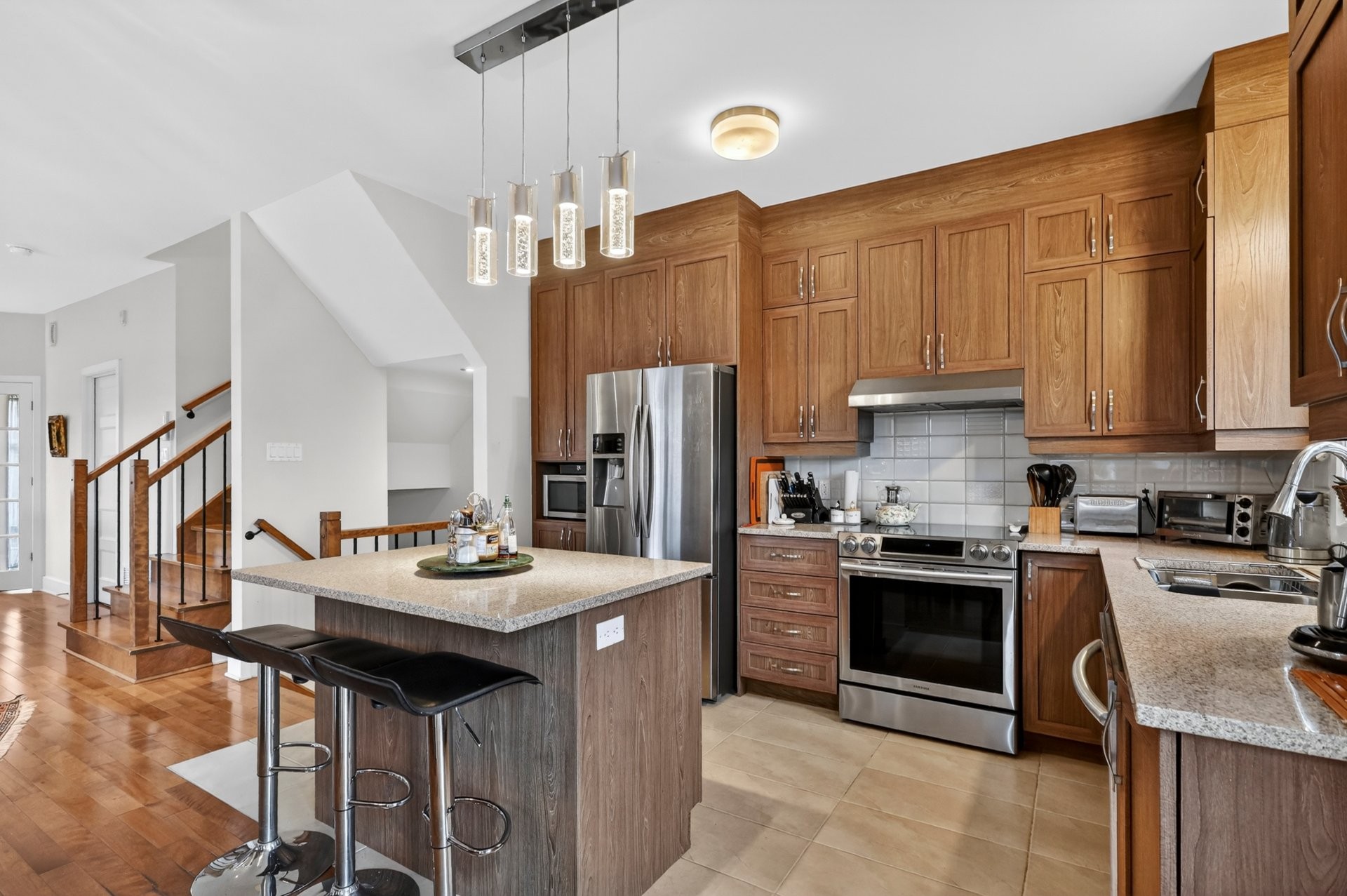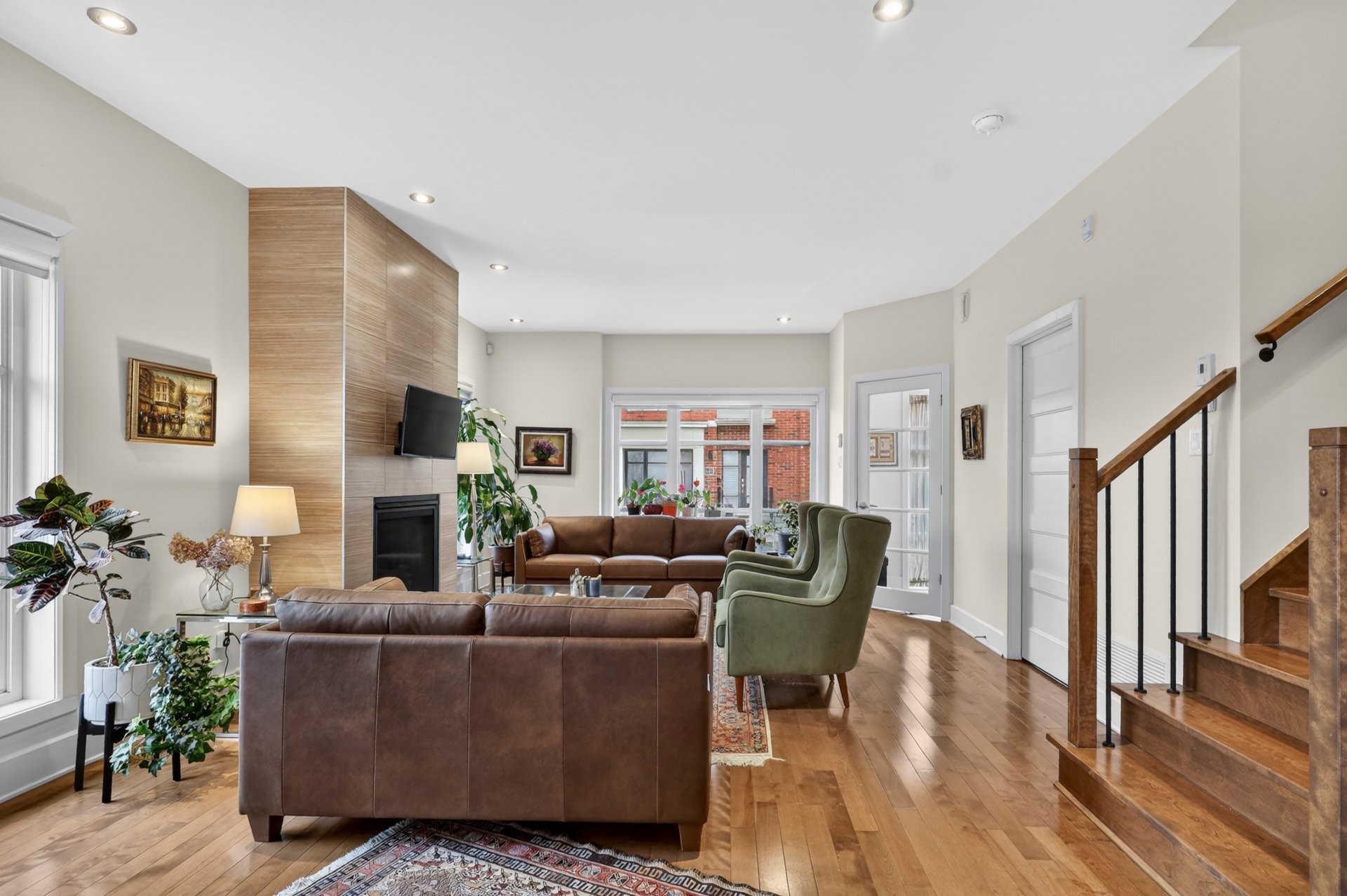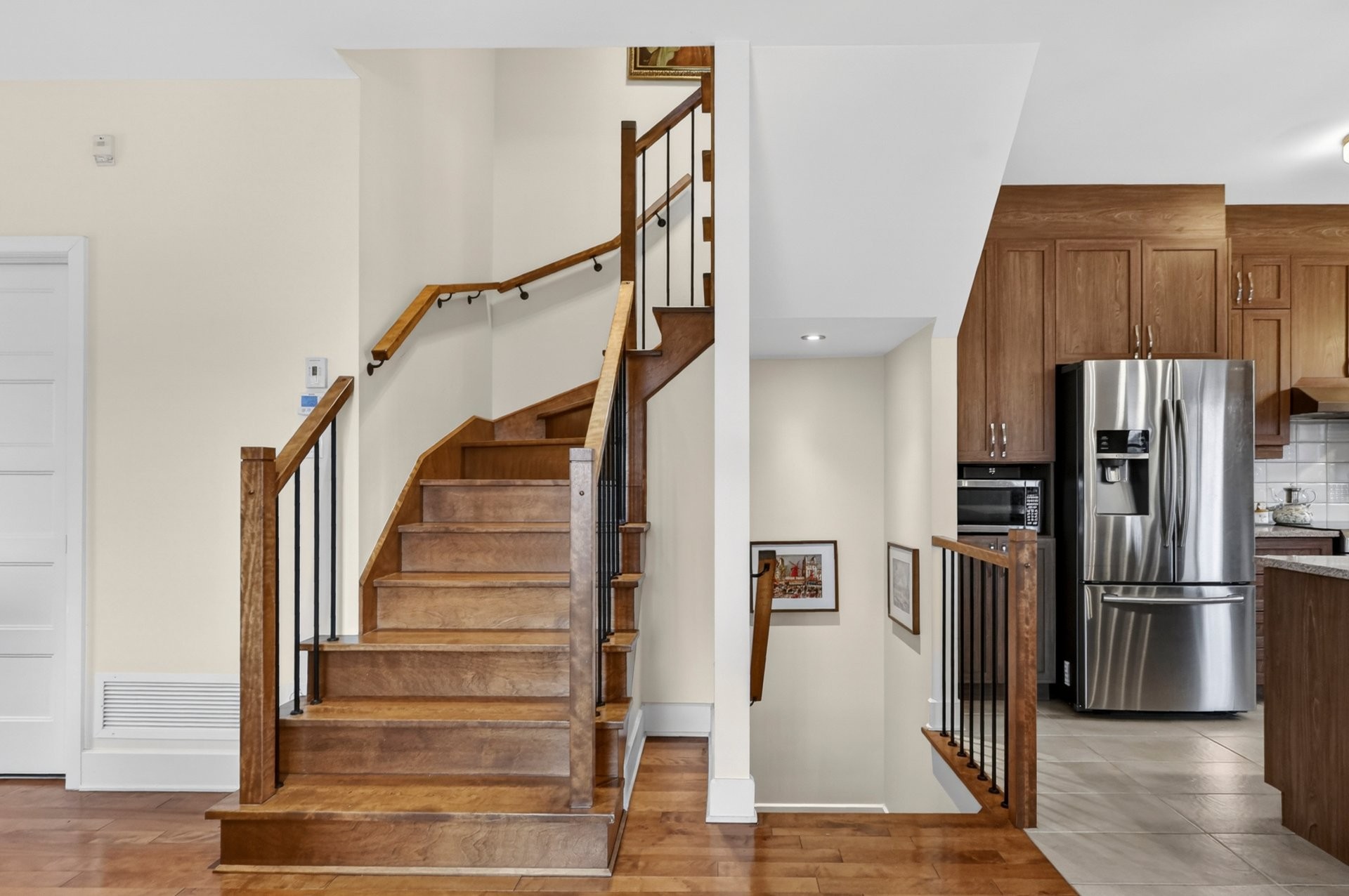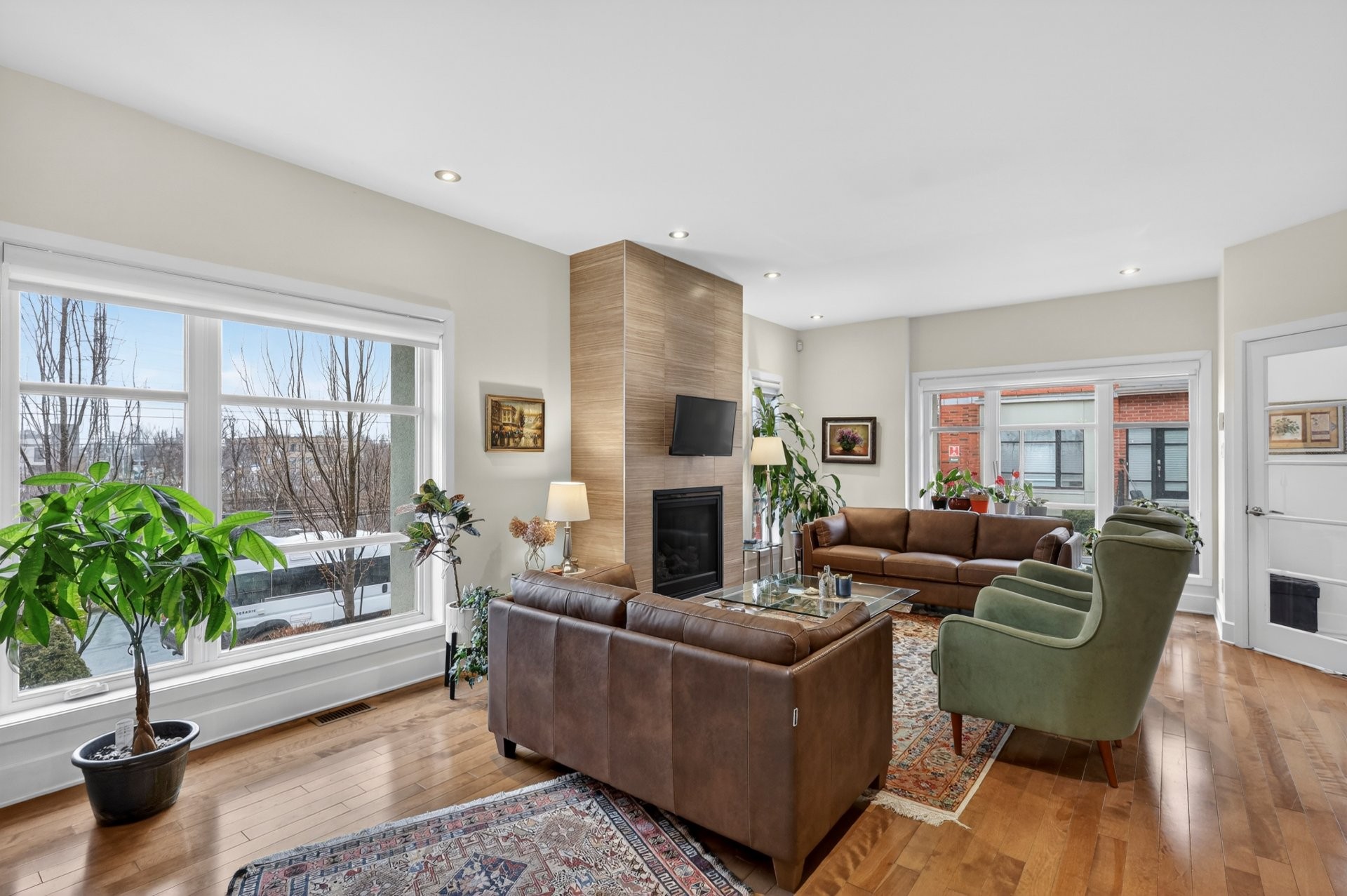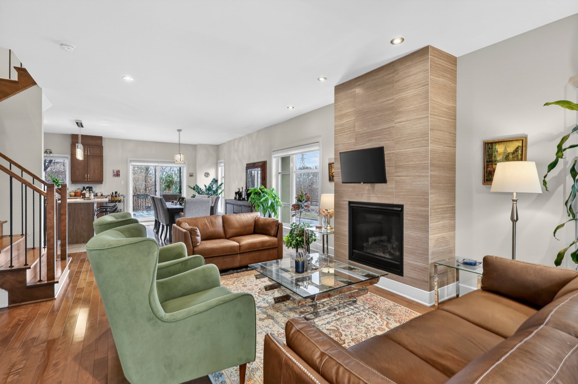 Le rez-de-chaussée offre un espace à aire ouverte lumineux regroupant la cuisine, la salle à manger et le salon, agrémenté d'un foyer au gaz naturel. On y retrouve des planchers de bois franc, des plafonds de 9 pieds, des comptoirs en quartz et des stores zébrés sur mesure. La cuisine moderne donne accès à une grande terrasse privée par une porte-patio. Une salle d'eau avec espace buanderie complète cet étage.