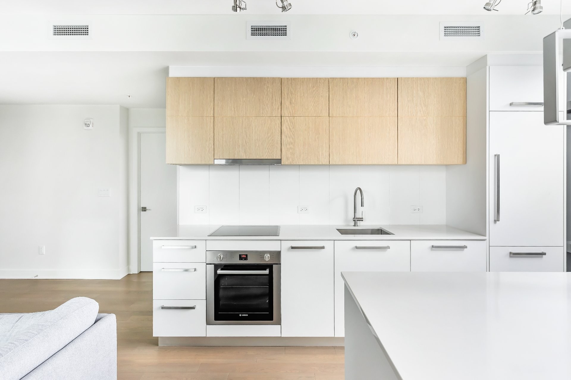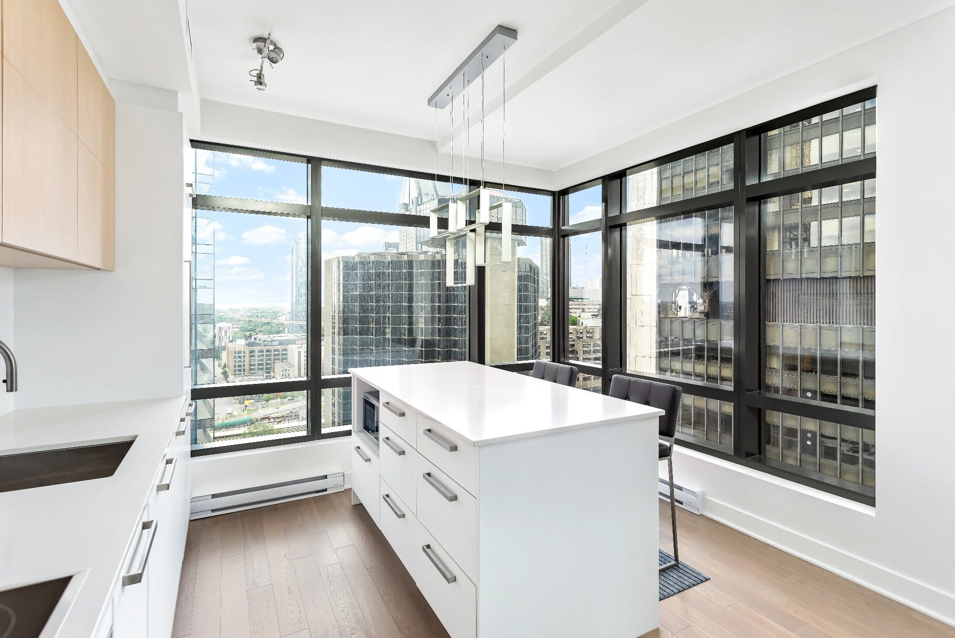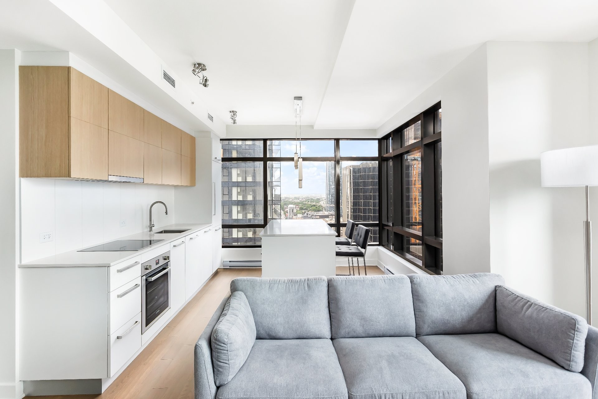 Unité de coin partiellement meublé moderne au YUL avec 2 chambres, 1 salle de bain et espace lumineux à aire ouverte. Fenêtres pleine hauteu...