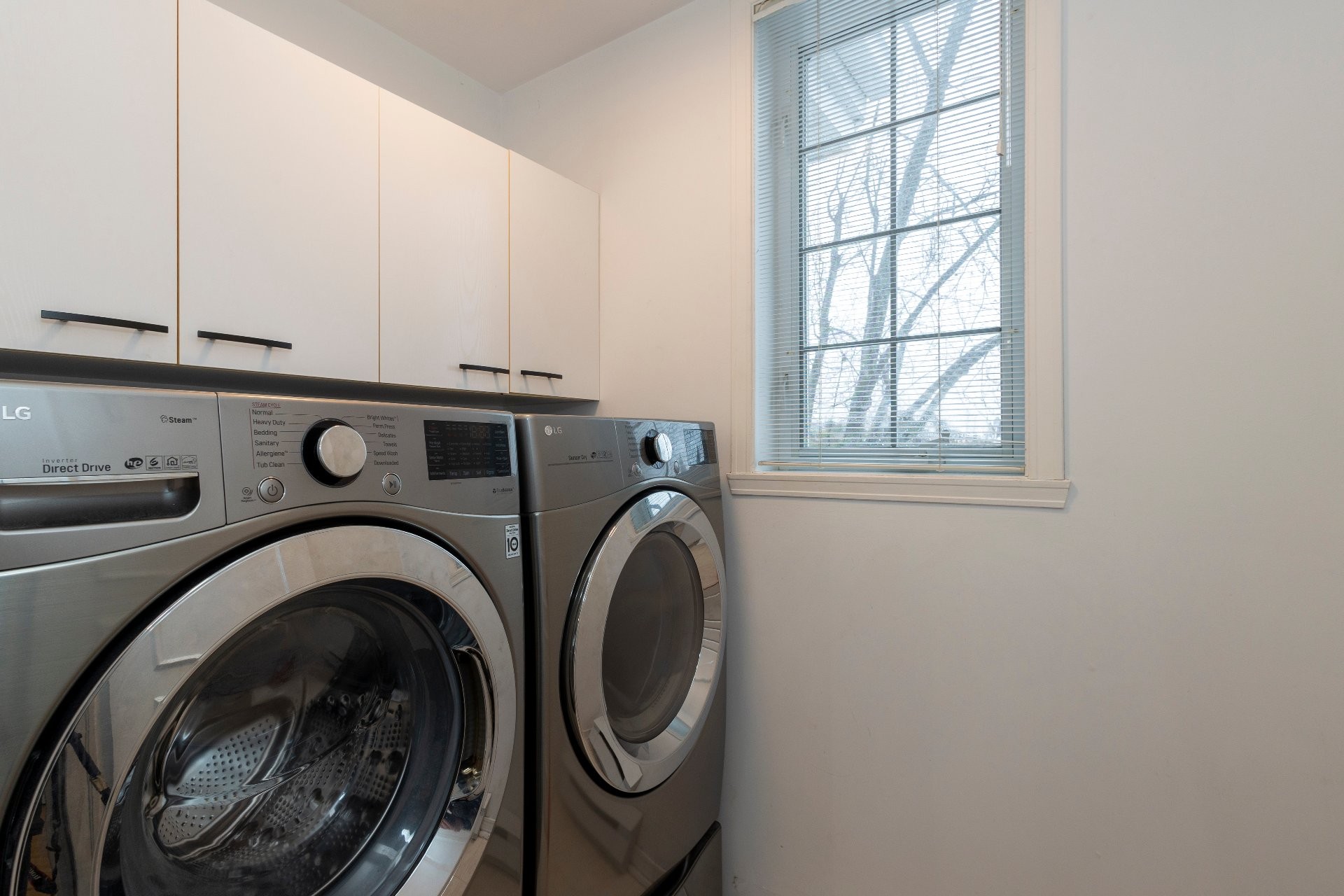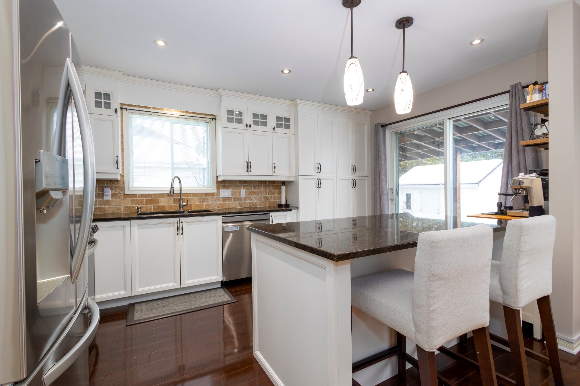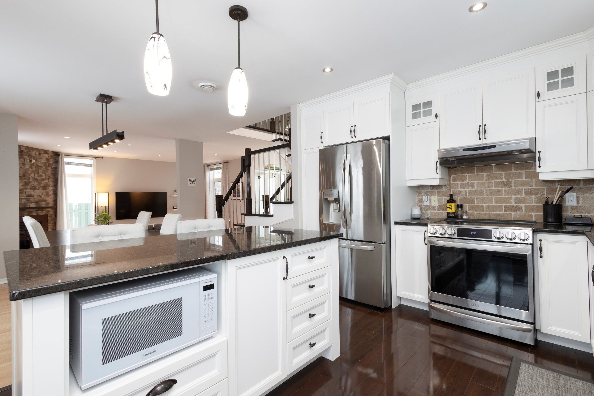 Réfrigérateur, cuisinière, laveuse, sécheuse, îlot à café dans la cuisine