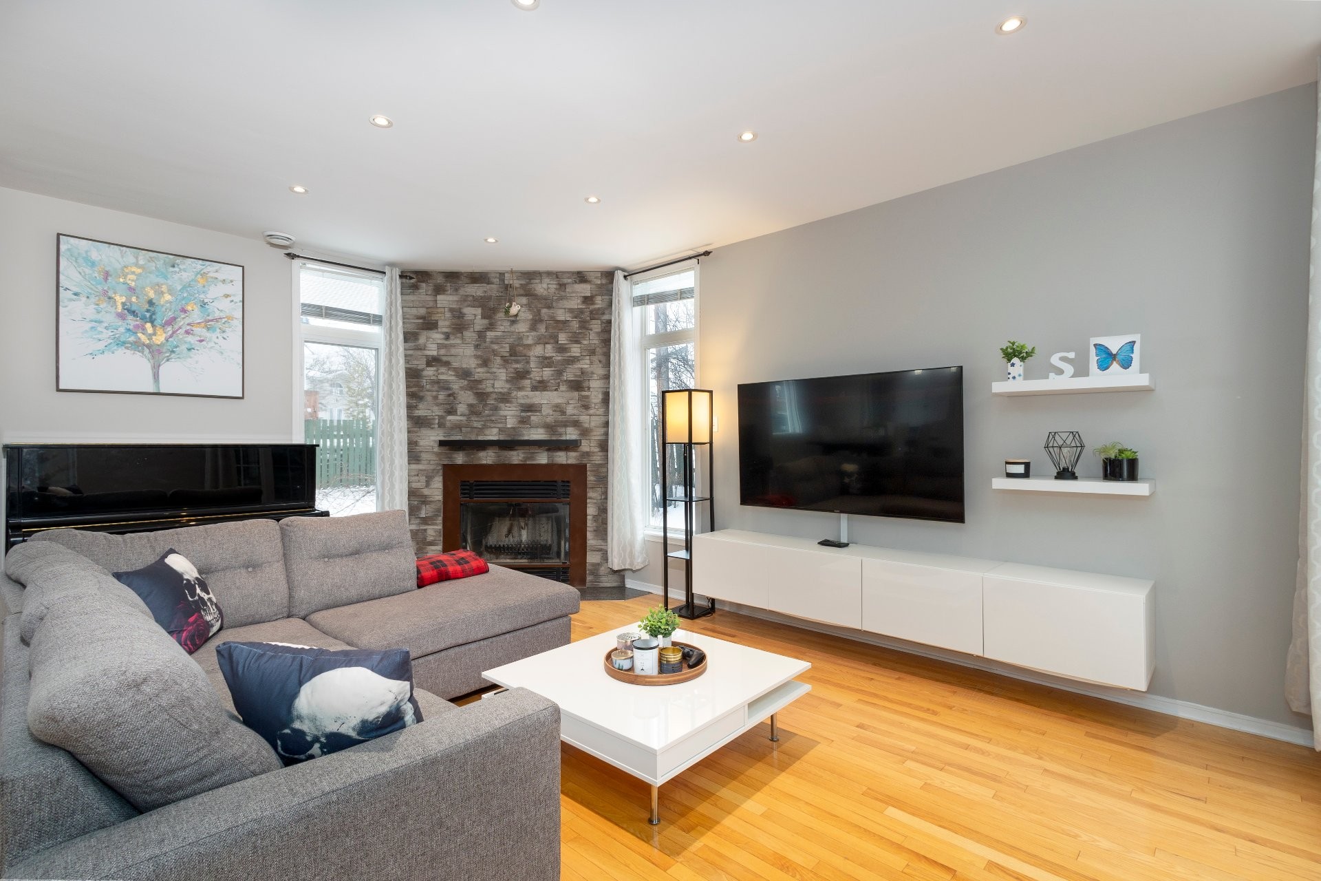 Revêtements de fenêtres, luminaires permanents, les étagères flottantes dans le salon et le bureau du sous-sol, le lave-vaisselle, les deux étagères flottantes dans la cuisine, l'aspirateur central et ses accessoires, le gazebo et les rideaux, le parasol dans la cour arrière, le spa et sa couverture, toutes les étagères et le porte-pneus dans le garage