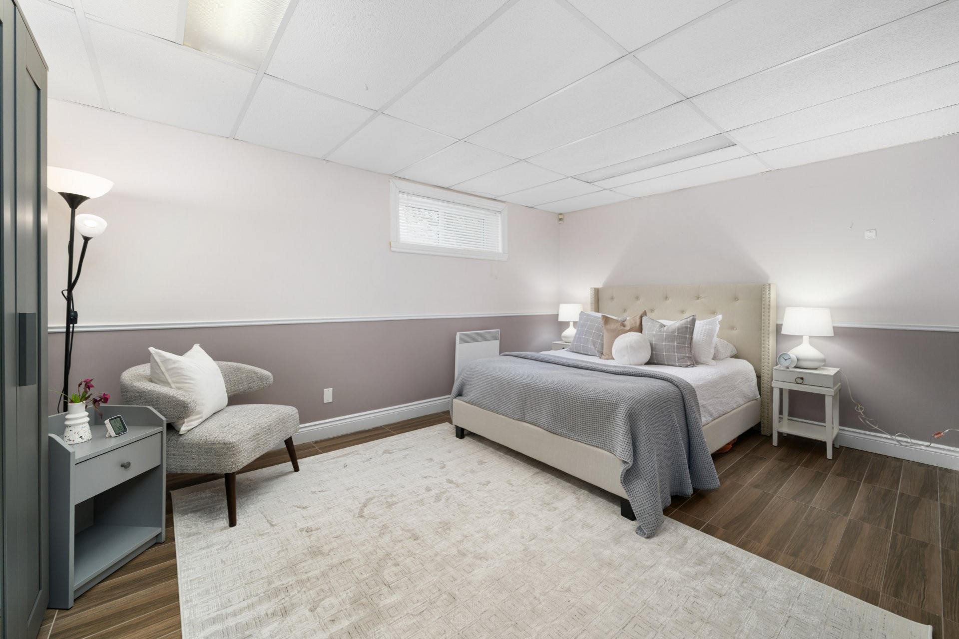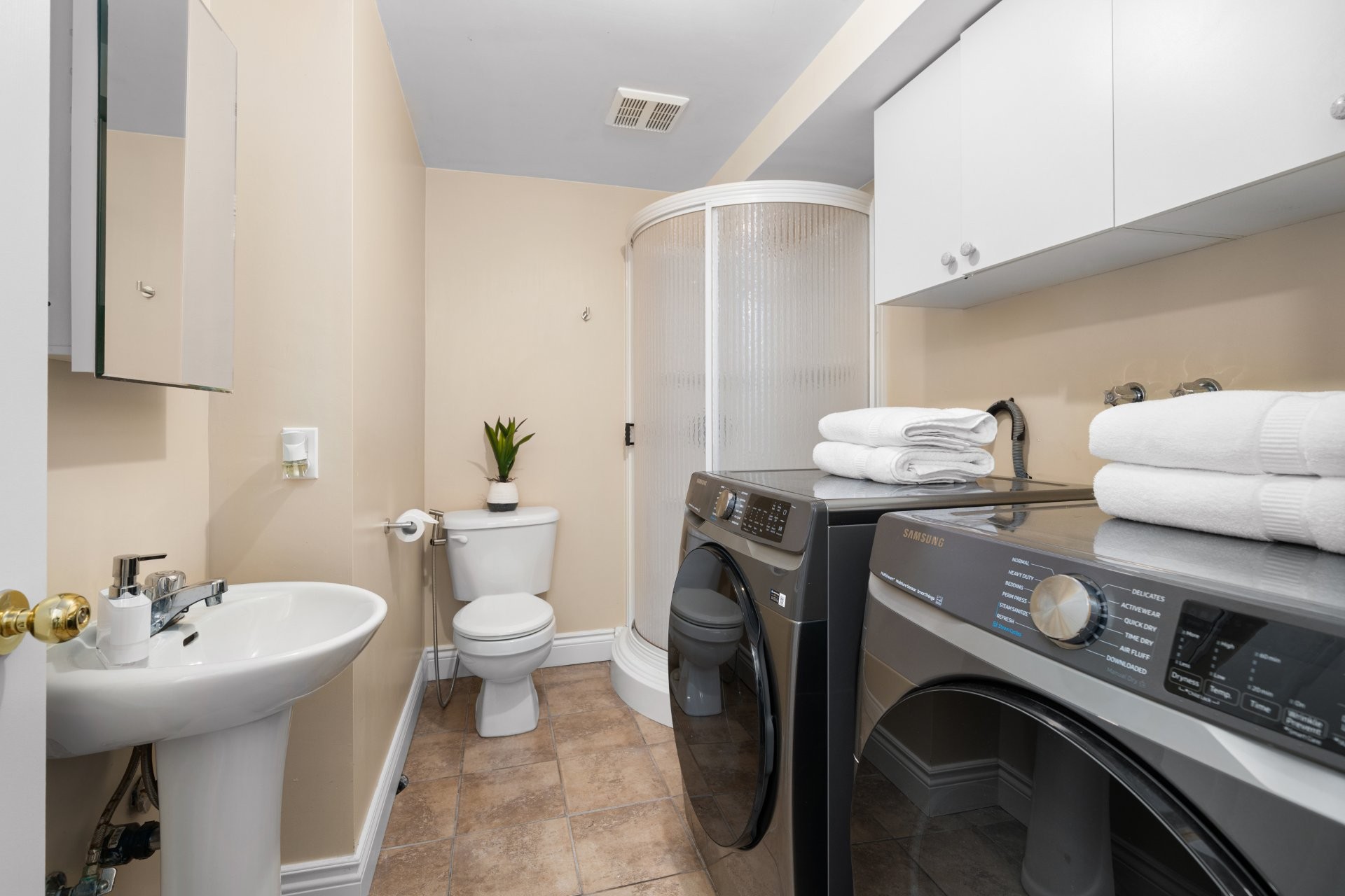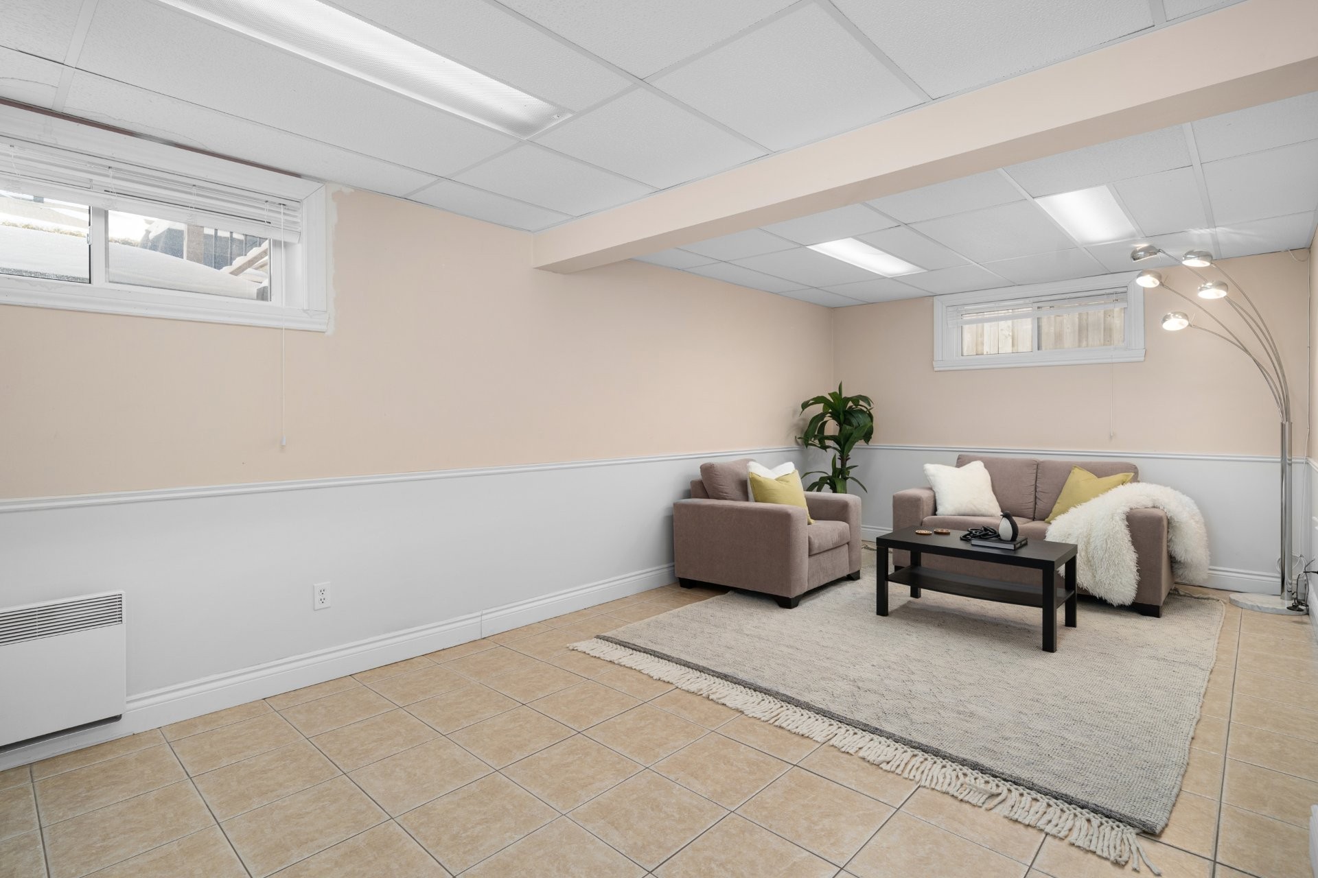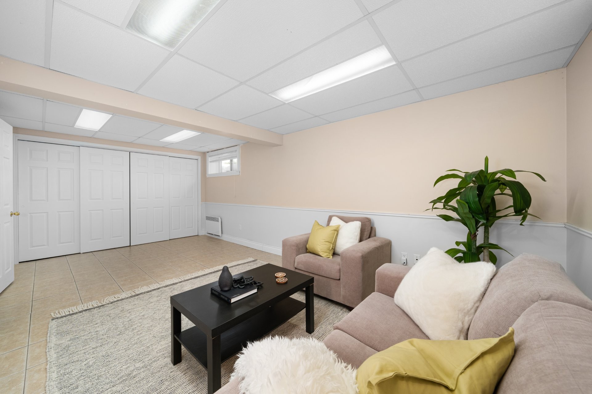 Sous-sol entièrement aménagé comprenant une chambre additionnelle, une grande salle de jeux, une salle de bain complète, une salle de lavage et des espaces de rangement.