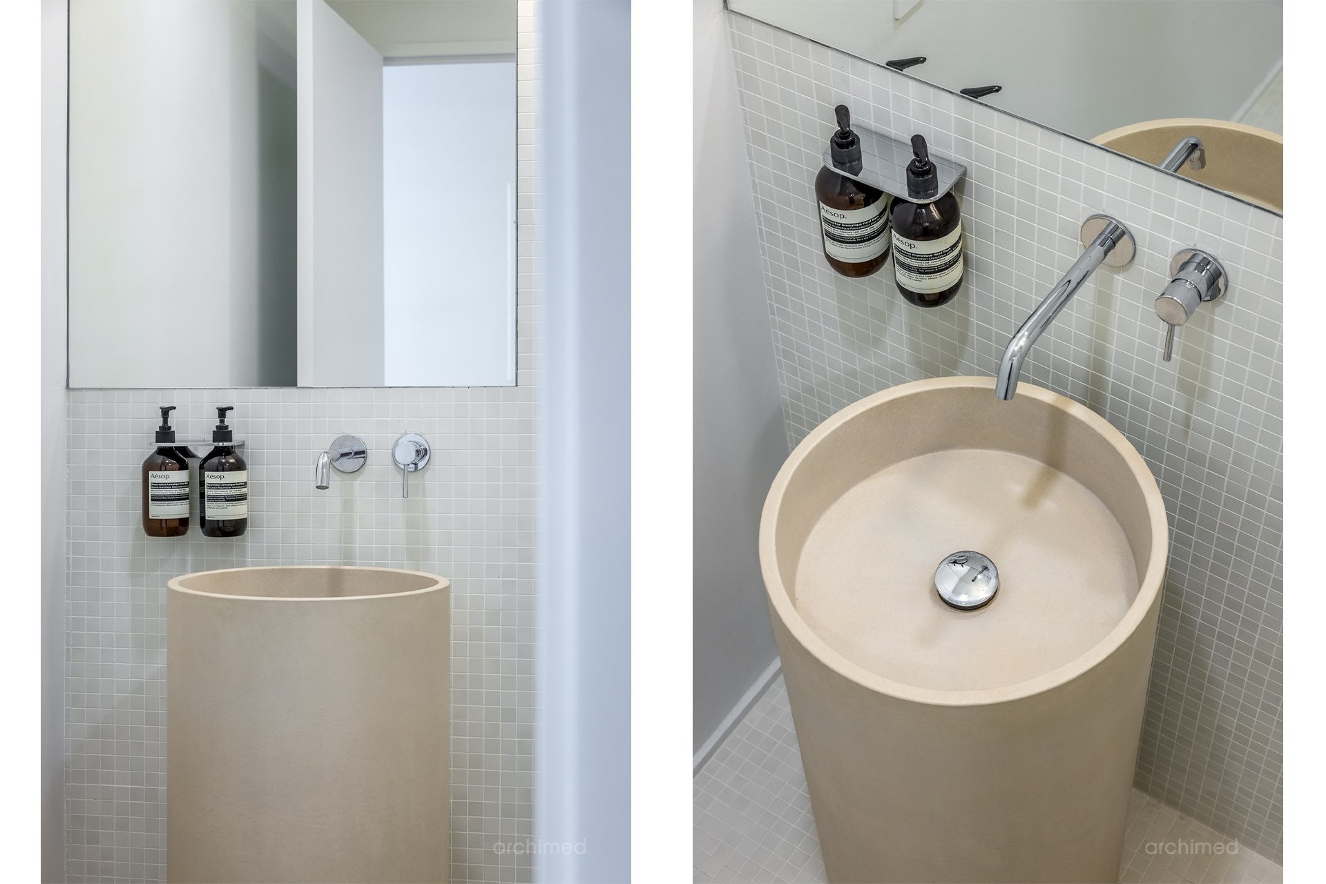 Effets personnels, luminaire beige (Authentik) -- petite salle de bain, laveuse et sécheuse
