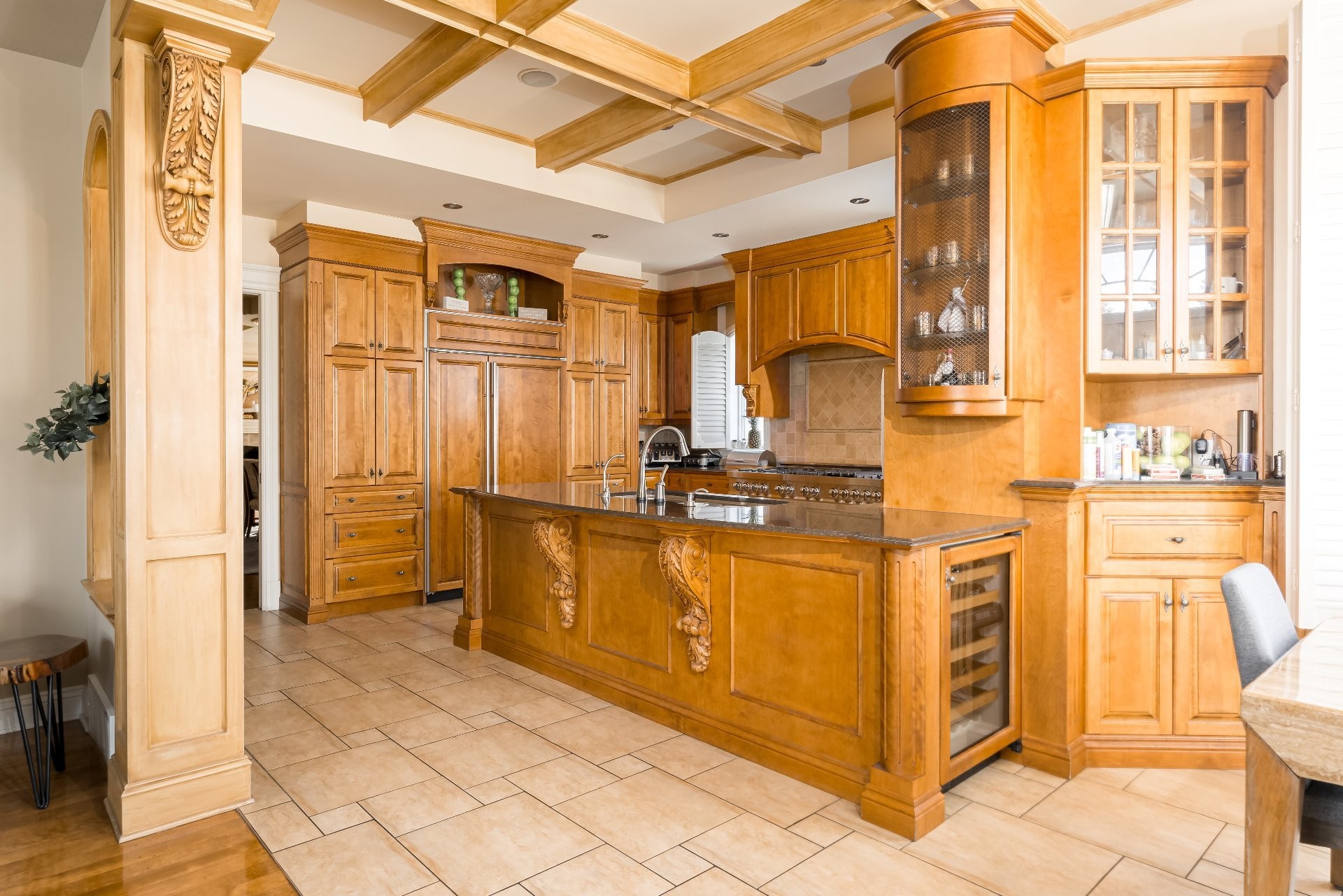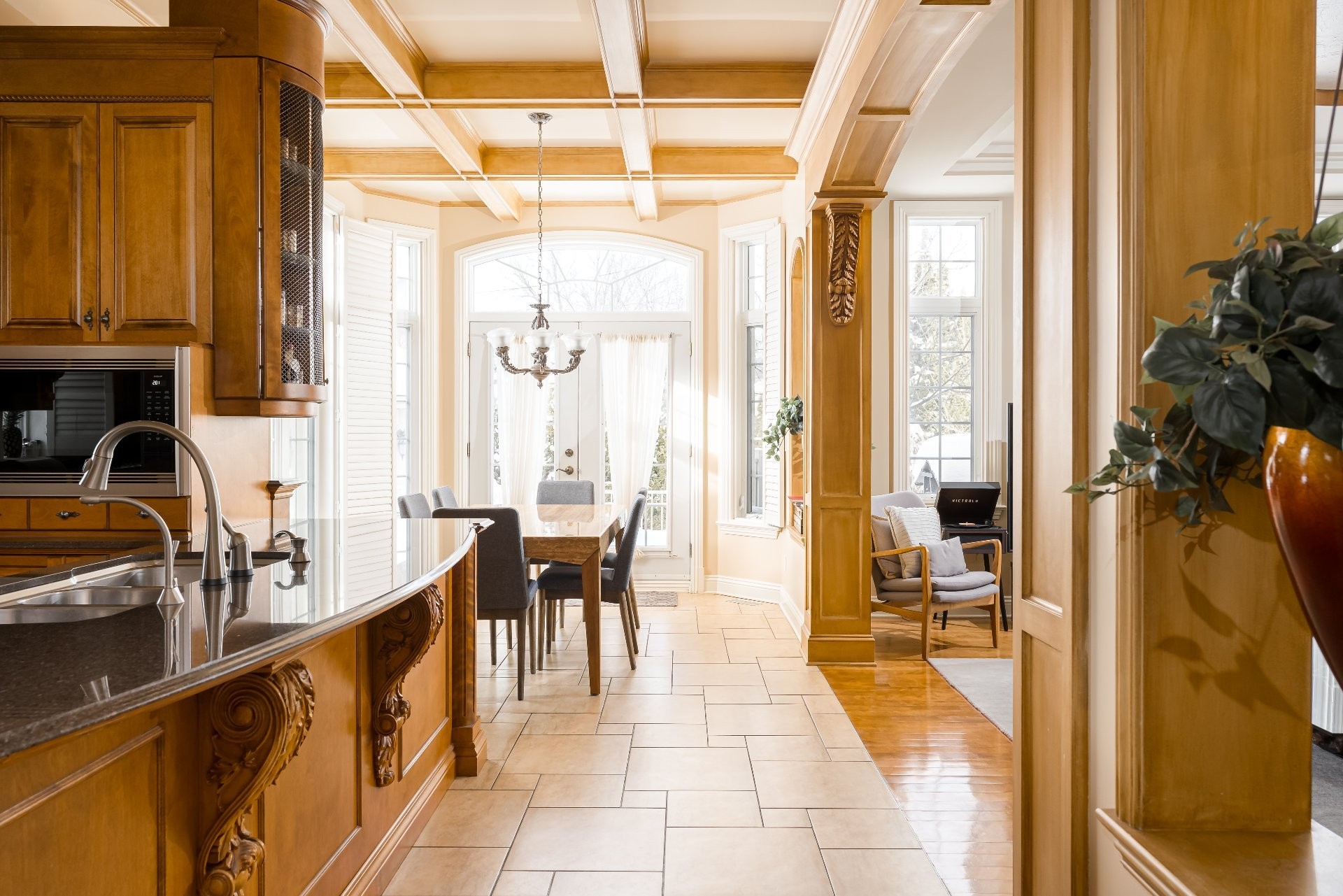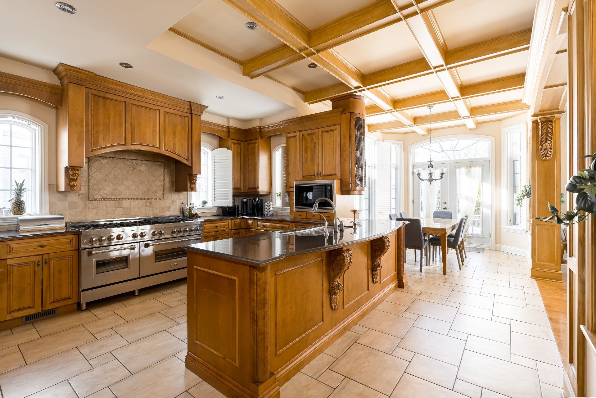 Superbe cuisine conçue avec des matériaux et un style de grande qualitéArmoires du sol au plafond aux couleurs chaudes du bois. Comptoirs en granit, plafond à poutres apparentes et vue sur l'immense salle familiale. Un grand garde-manger se trouve également à côté de la cuisine.