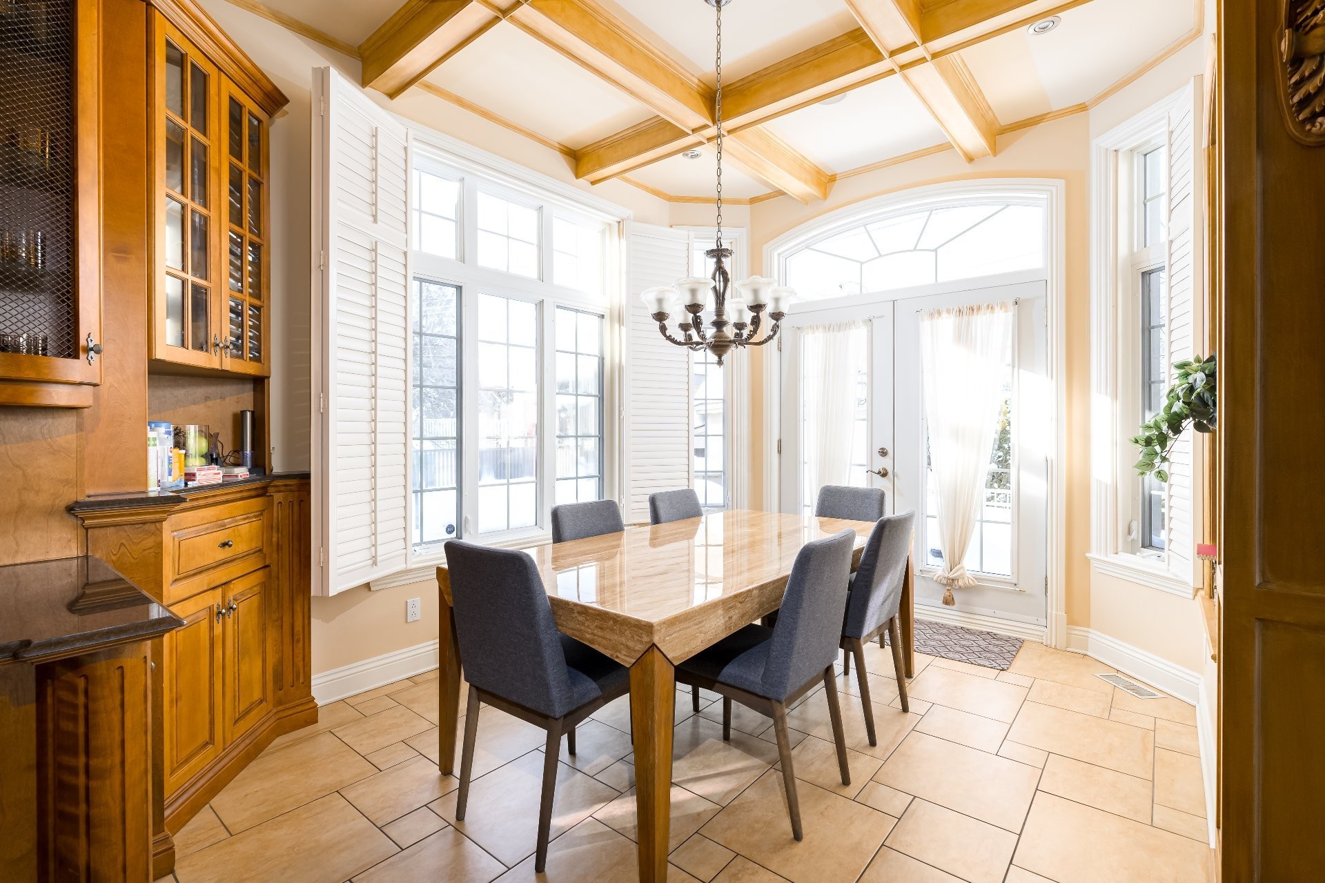 La dinette baigne dans la lumière naturelle avec d'immenses fenêtres et des portes-fenêtres donnant sur l'arrière-cour.