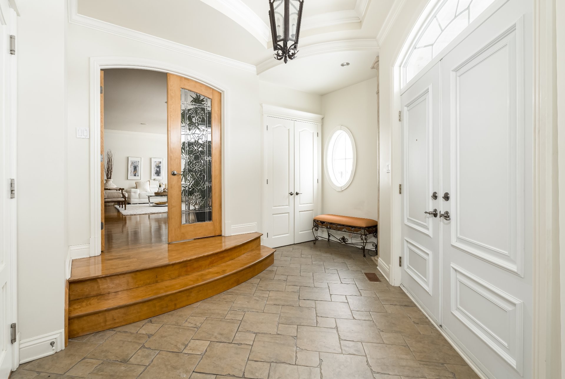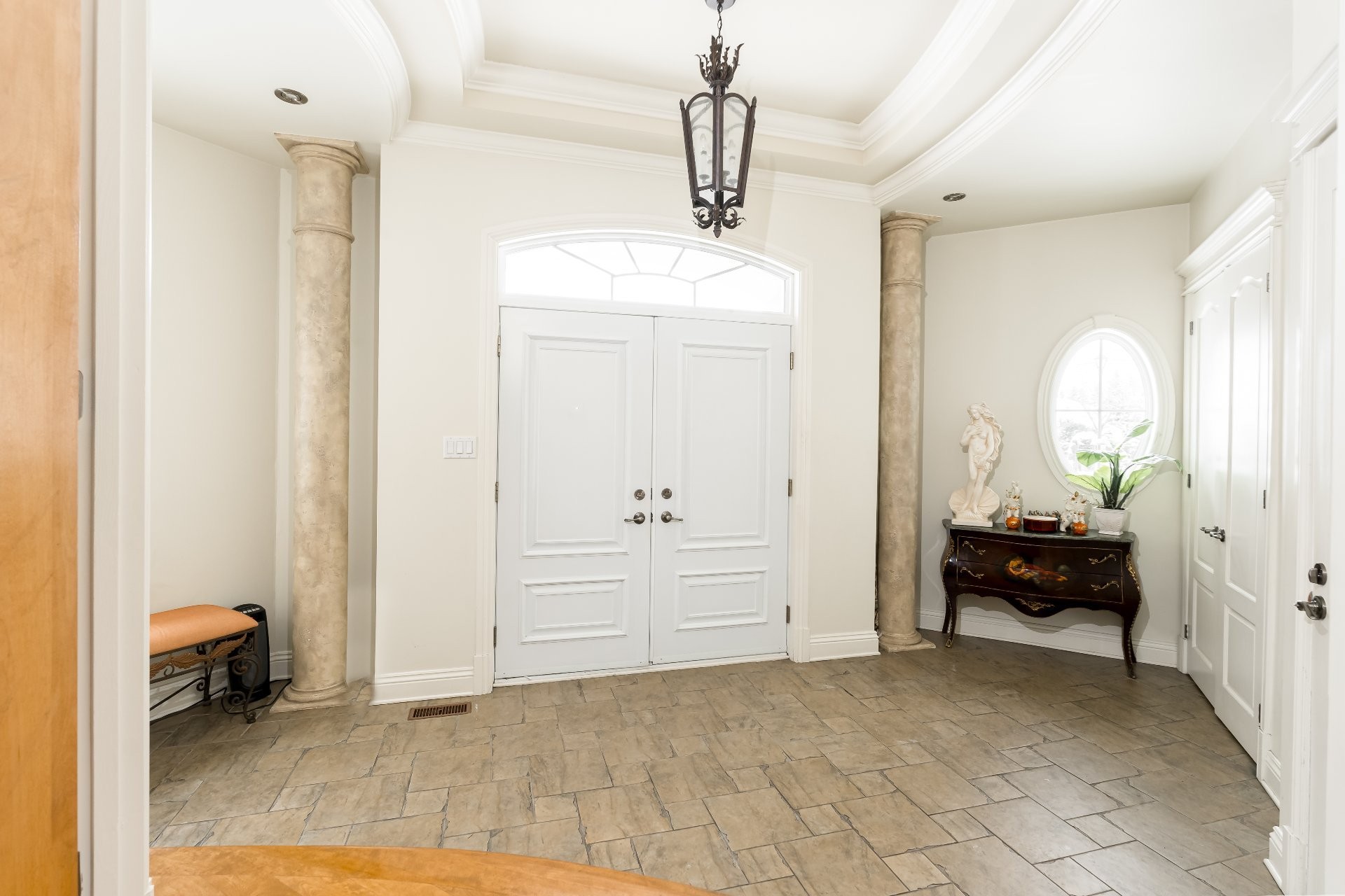 Entrée de la maison par des portes doubles dans un très grand hall d'entrée. Sols en pierre et doubles portes menant au niveau principal.