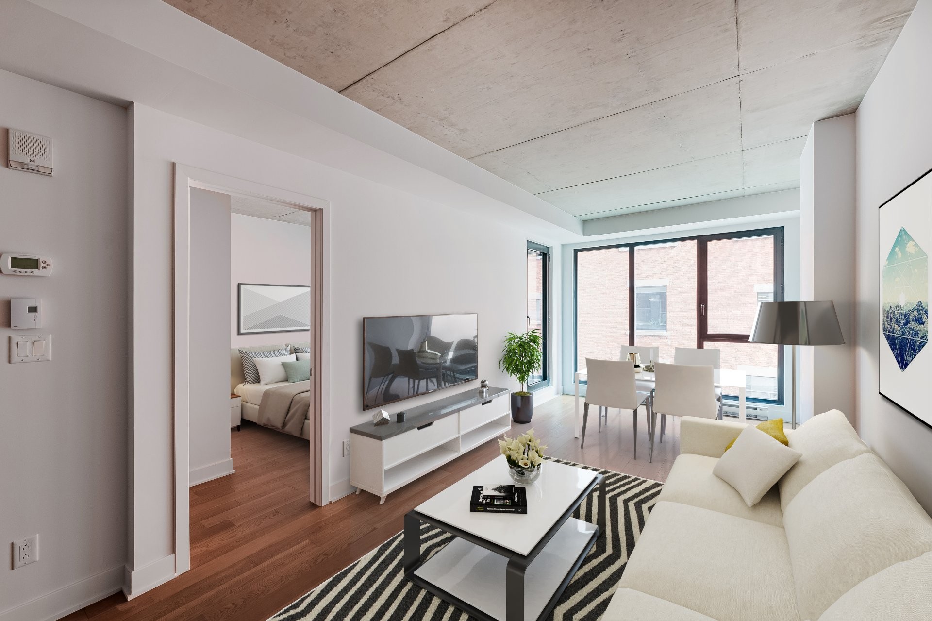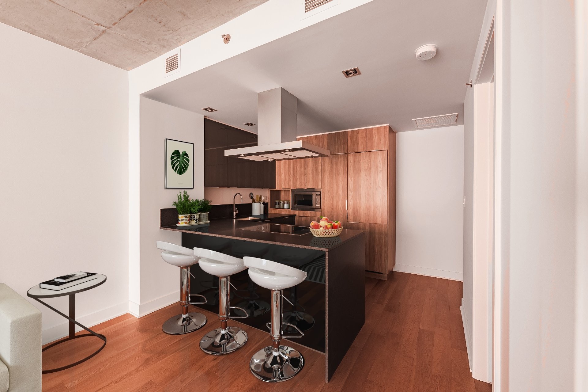 Unité de coin partiellement meublé moderne au YUL avec 2 chambres, 1 salle de bain et espace lumineux à aire ouverte. Fenêtres pleine hauteu...