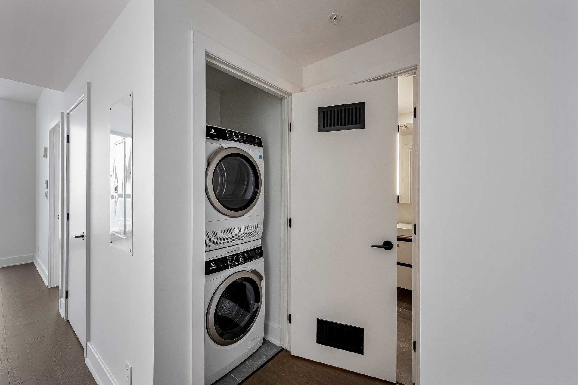 Réfrigérateur de 24 po. avec panneau intégré, plaque de cuisson électrique de 24 po., four à cuisson rapide en acier inoxydable de 24 po., encastré, lave-vaisselle avec panneau intégré. Laveuse et sécheuse superposées à chargement frontal de 24 po.