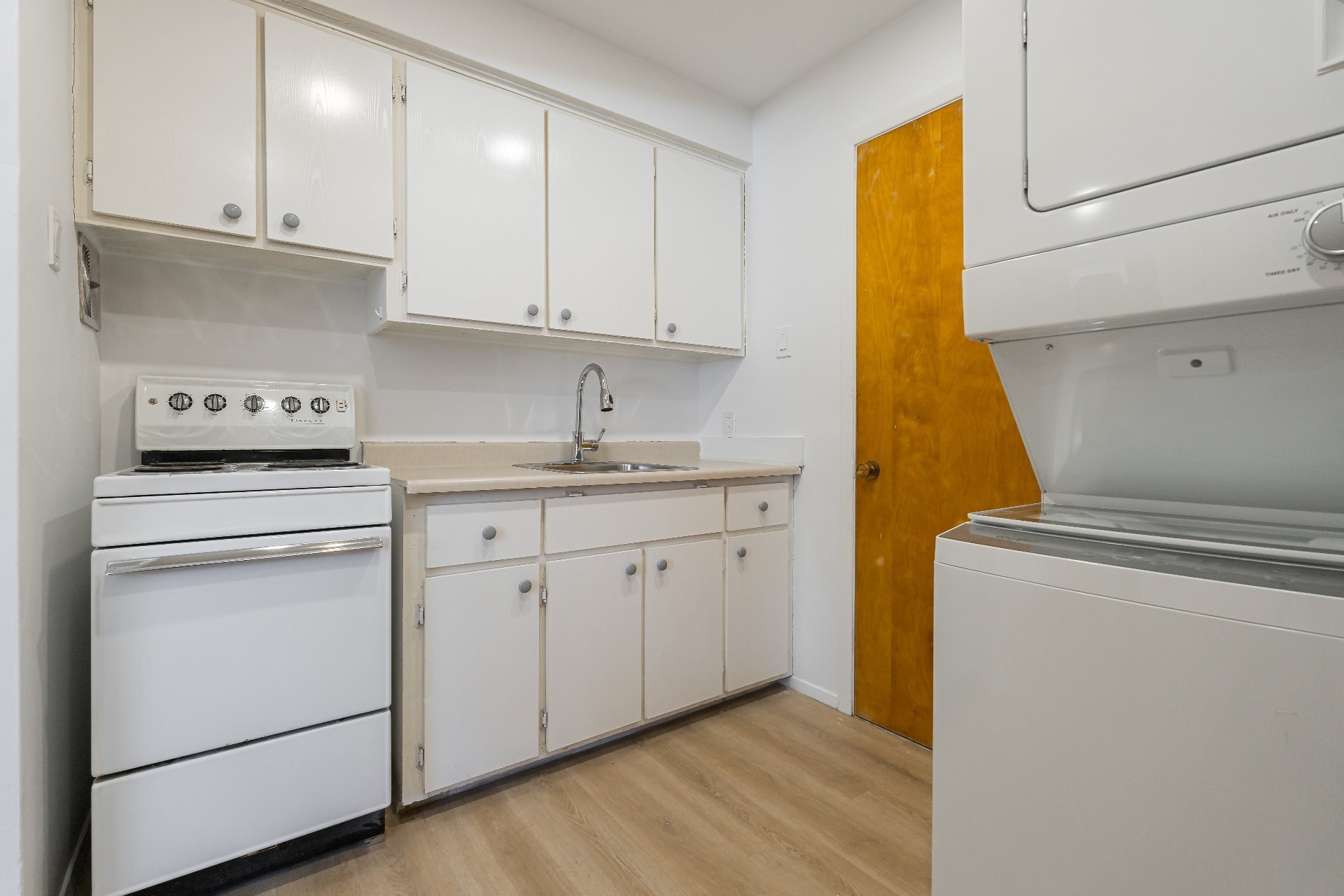Réfrigérateur, cuisinière, laveuse, sécheuse, lit, table, 2 chaises, stores