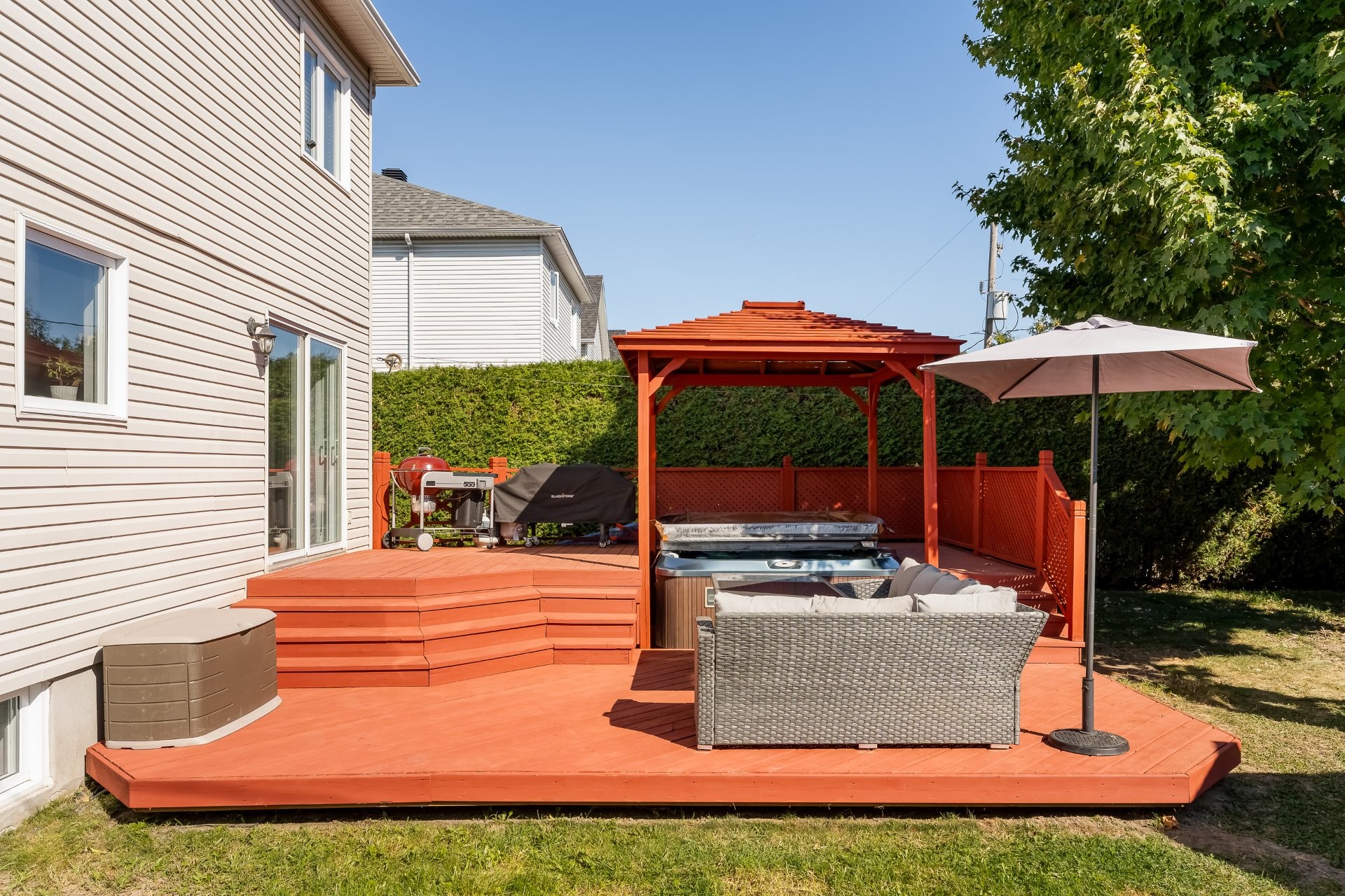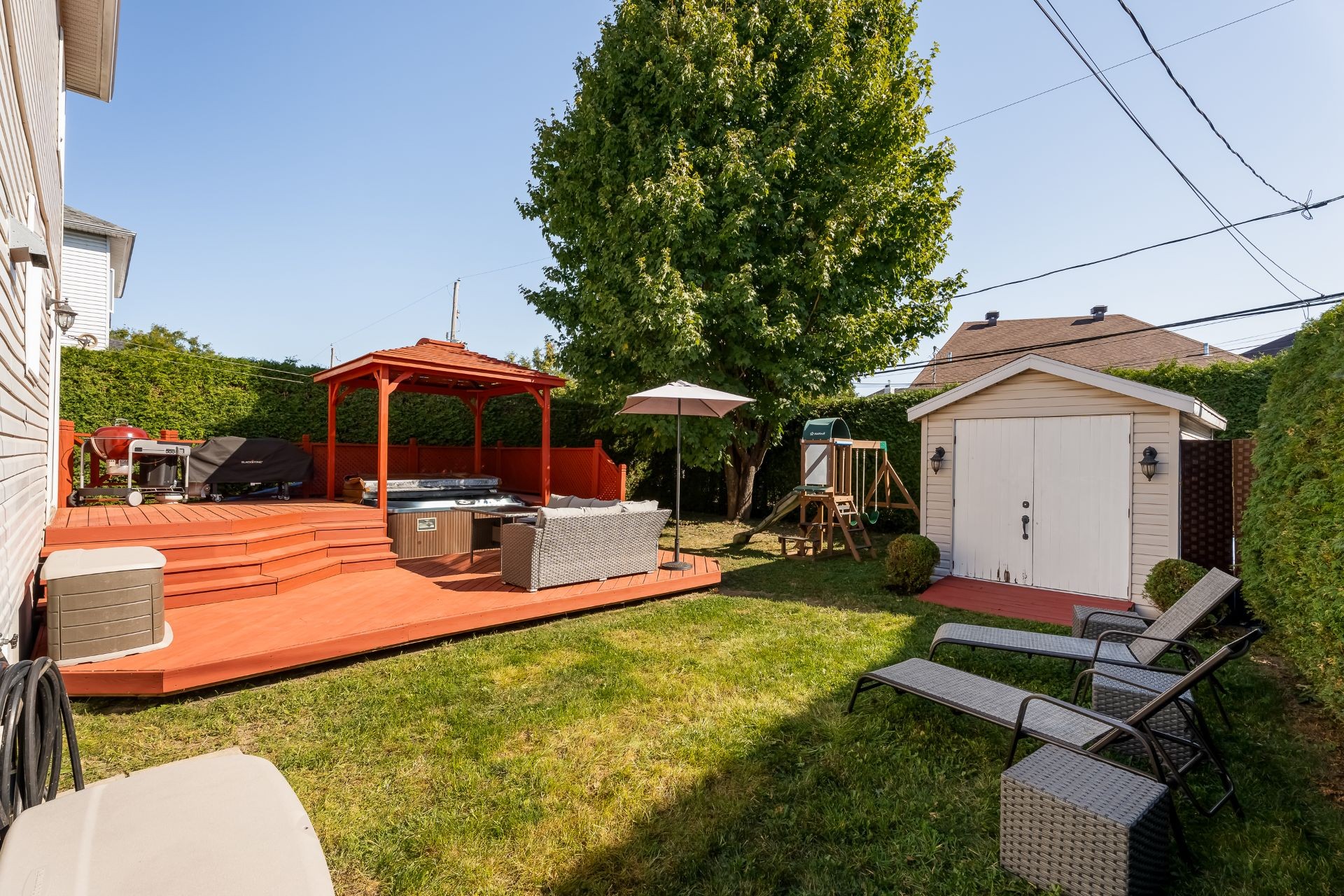 Belle cours privée, intime, bordée de haies et un spa. Un véritable havre de paix où s'allient quiétude, confort et qualité de vie, tout en étant près de tout.