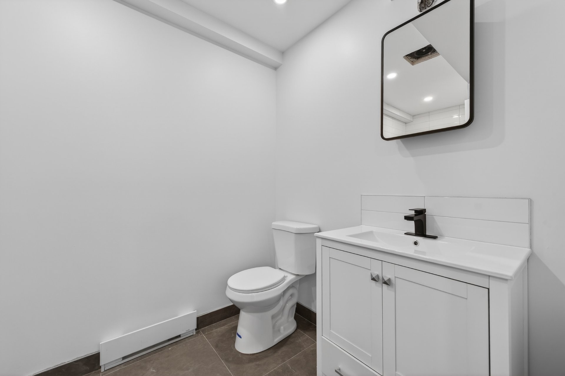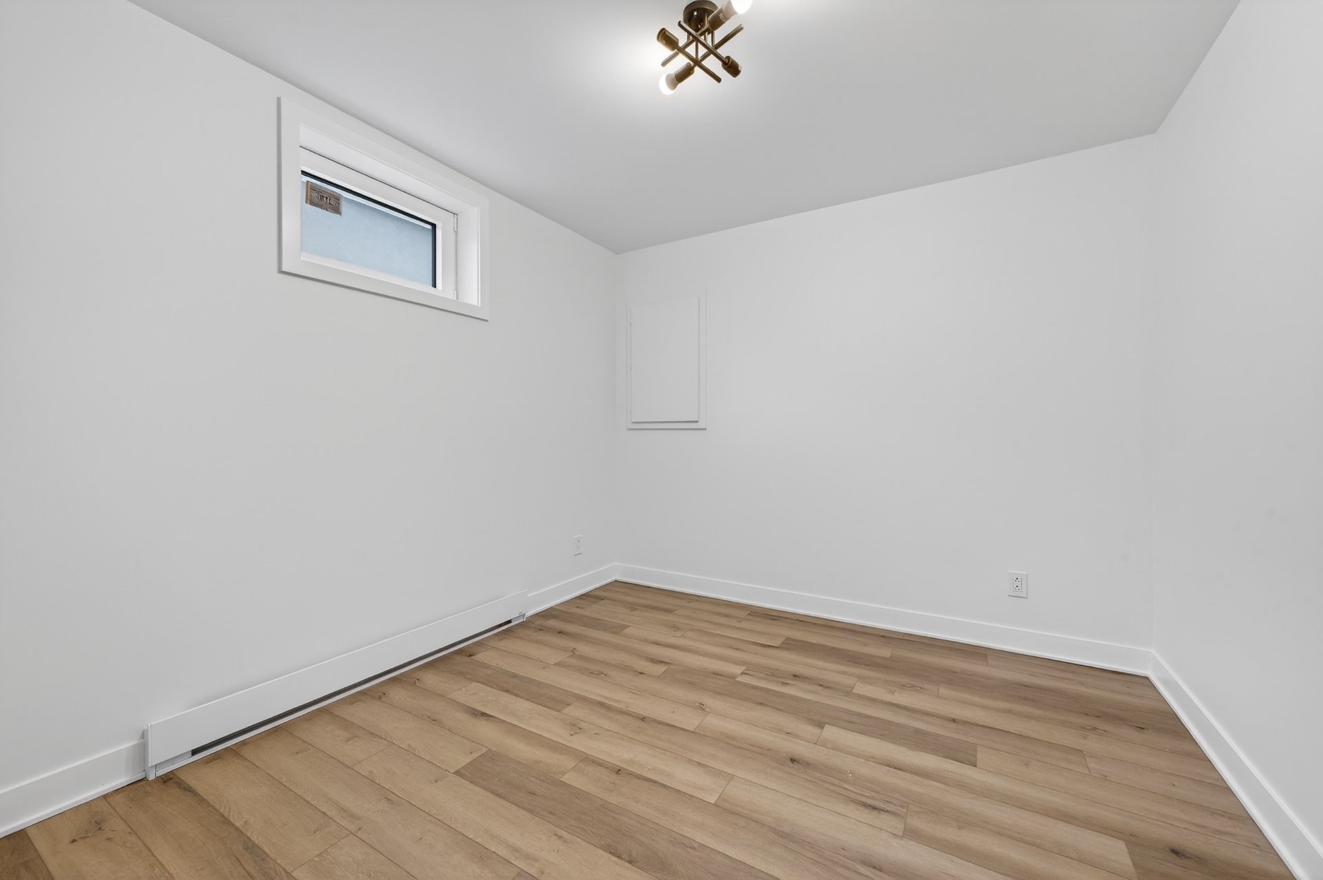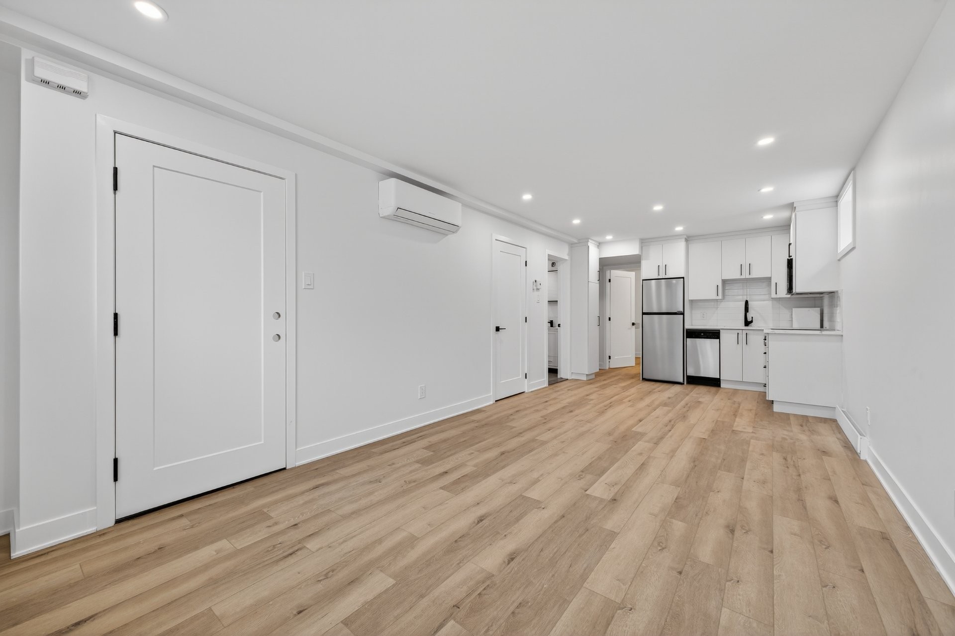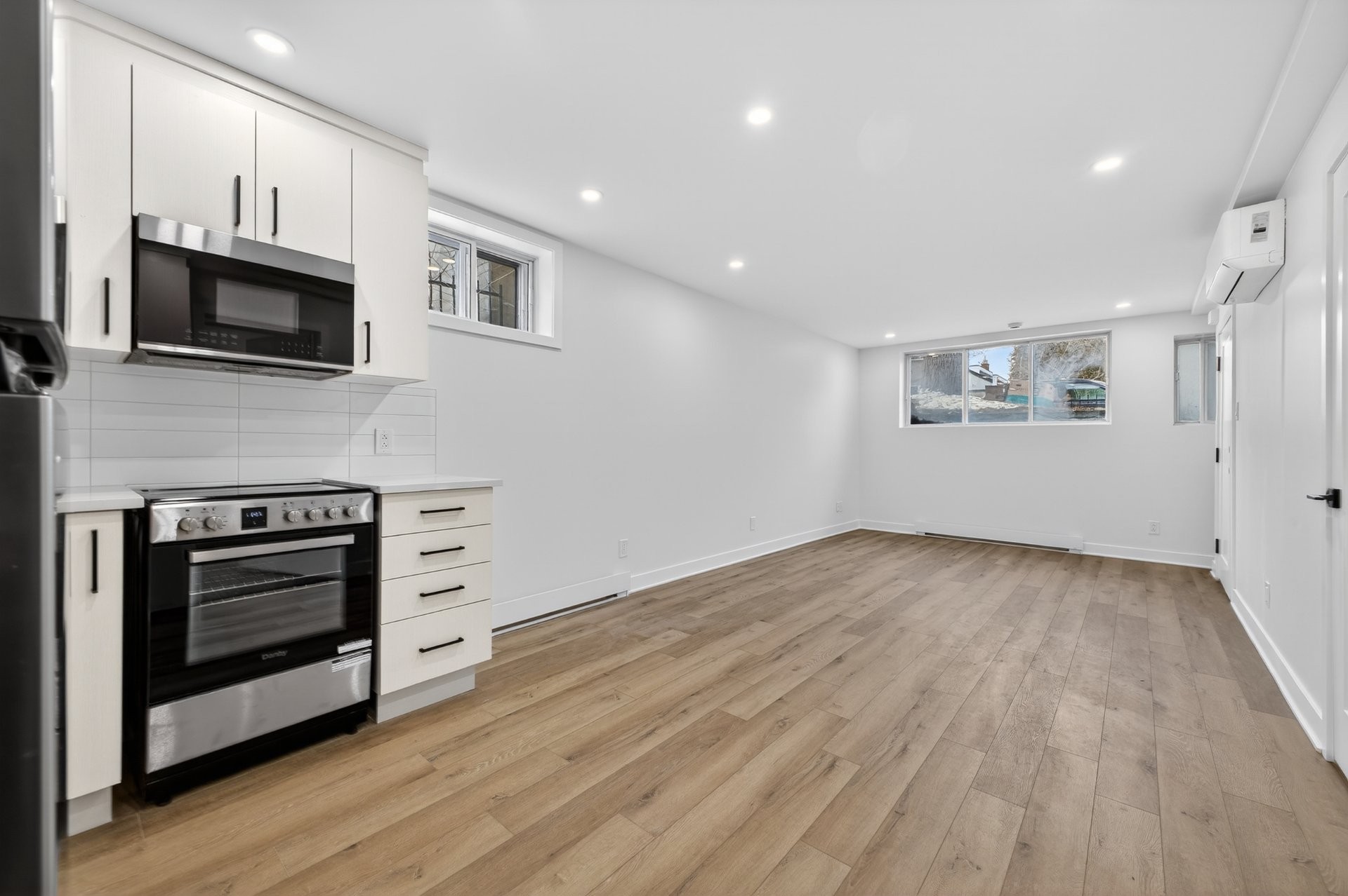 Espace à aire ouverte avec belle profondeur et éclairage encastré. Lumineux pour un sous-sol et très bien optimisé.